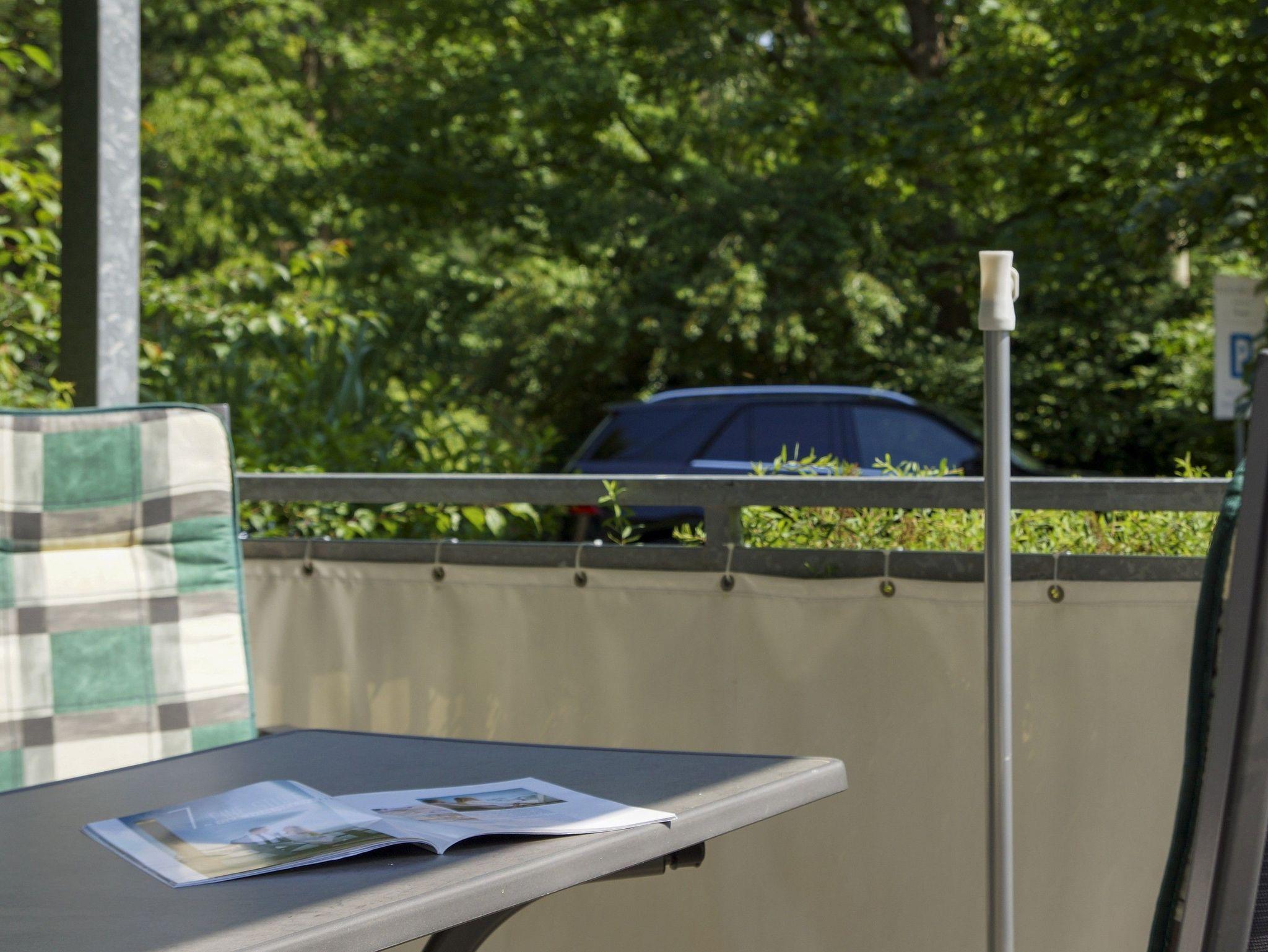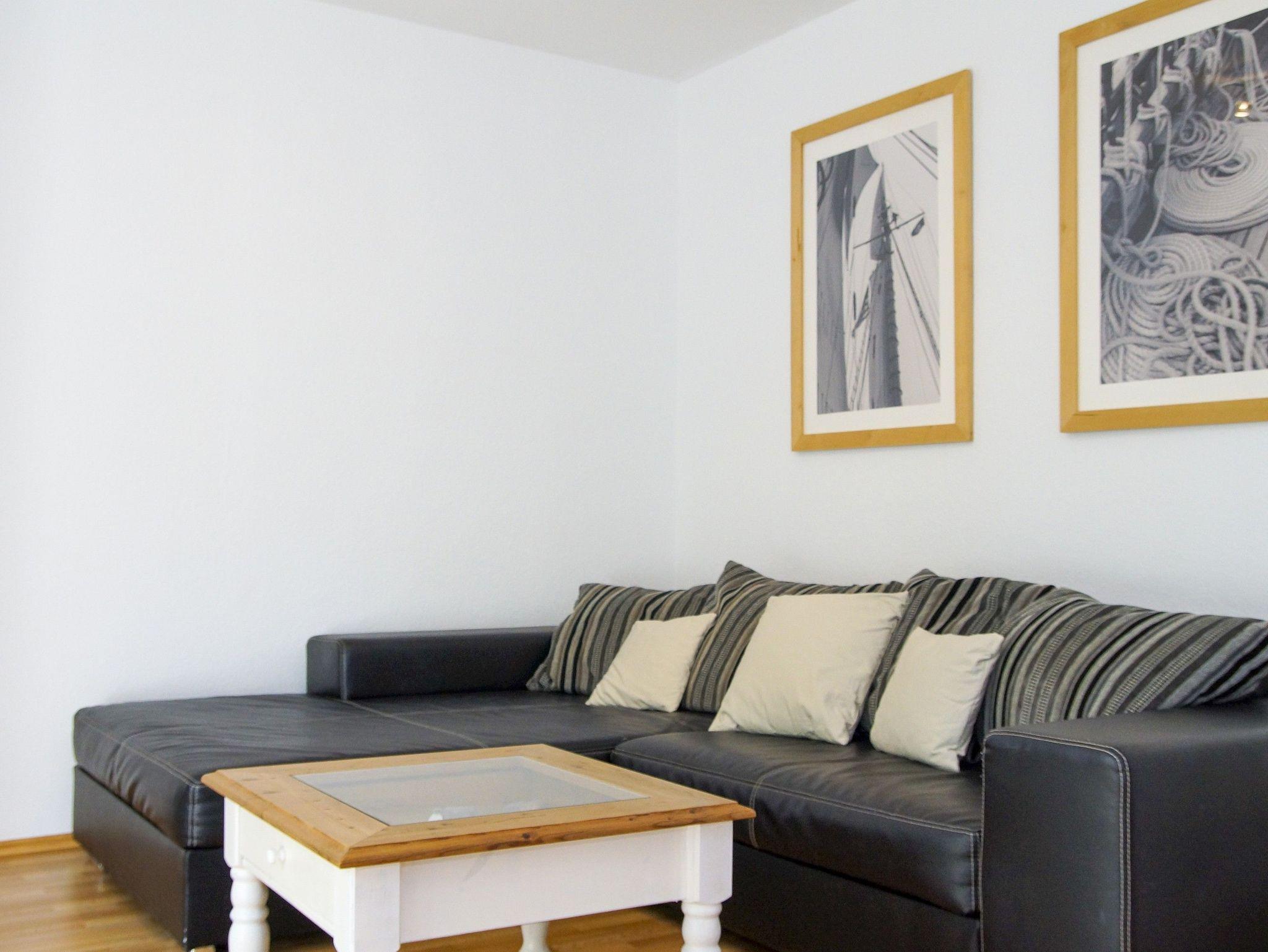 Das modern eingerichtete Wohnzimmer mit TV und Schlafcouch bietet Ihnen nicht nur Zugang zum sonnigen Balkon, sondern auch einen hellen Essbereich.