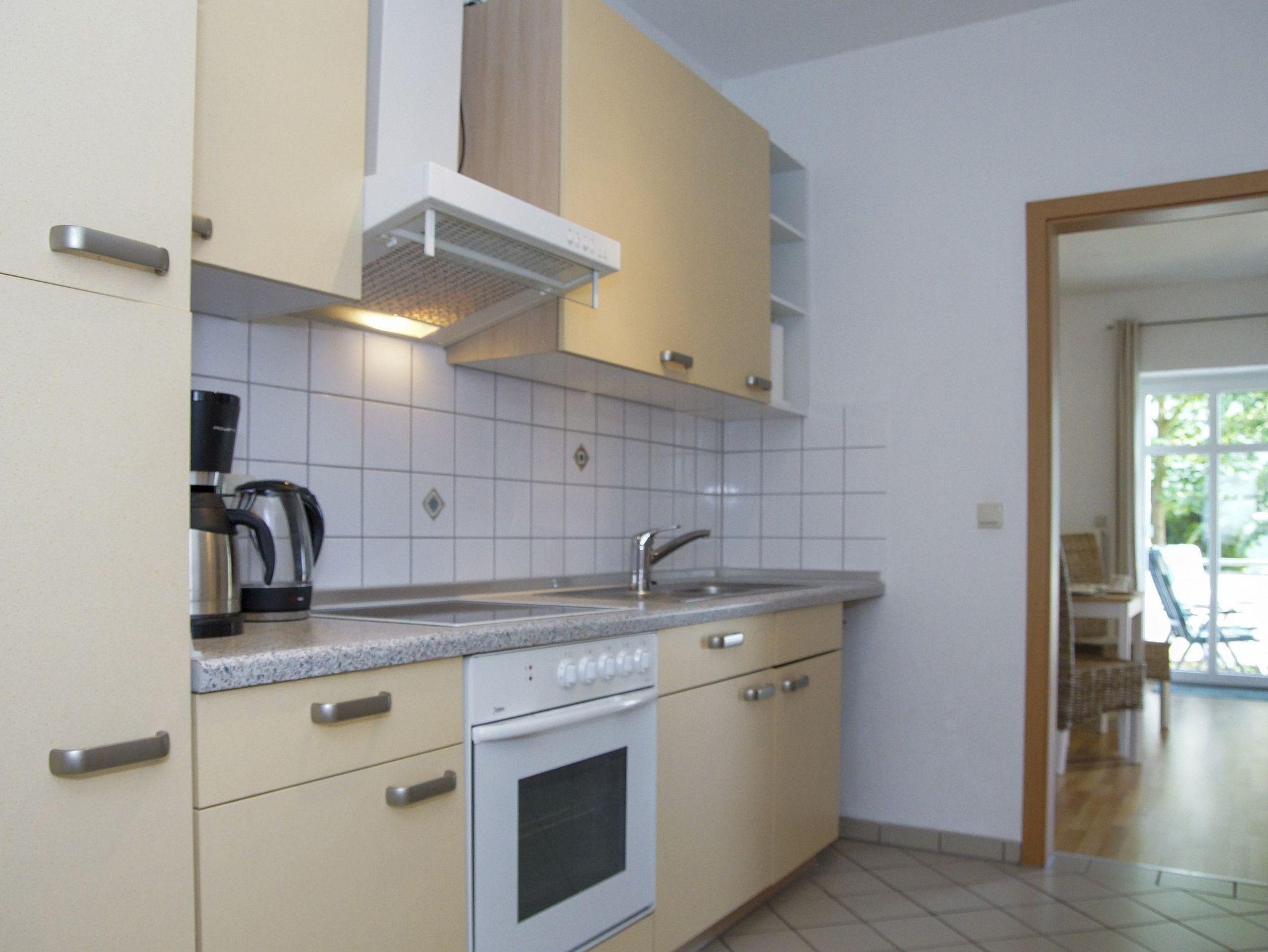 Die Küchenzeile ist mit allem ausgestattet, was es für das tägliche Leben braucht; einen Kühlschrank, einen 4-Platten-Herd, eine Mikrowelle und allerlei Küchenkleingeräte (Kaffeemaschine, Wasserkocher...).
