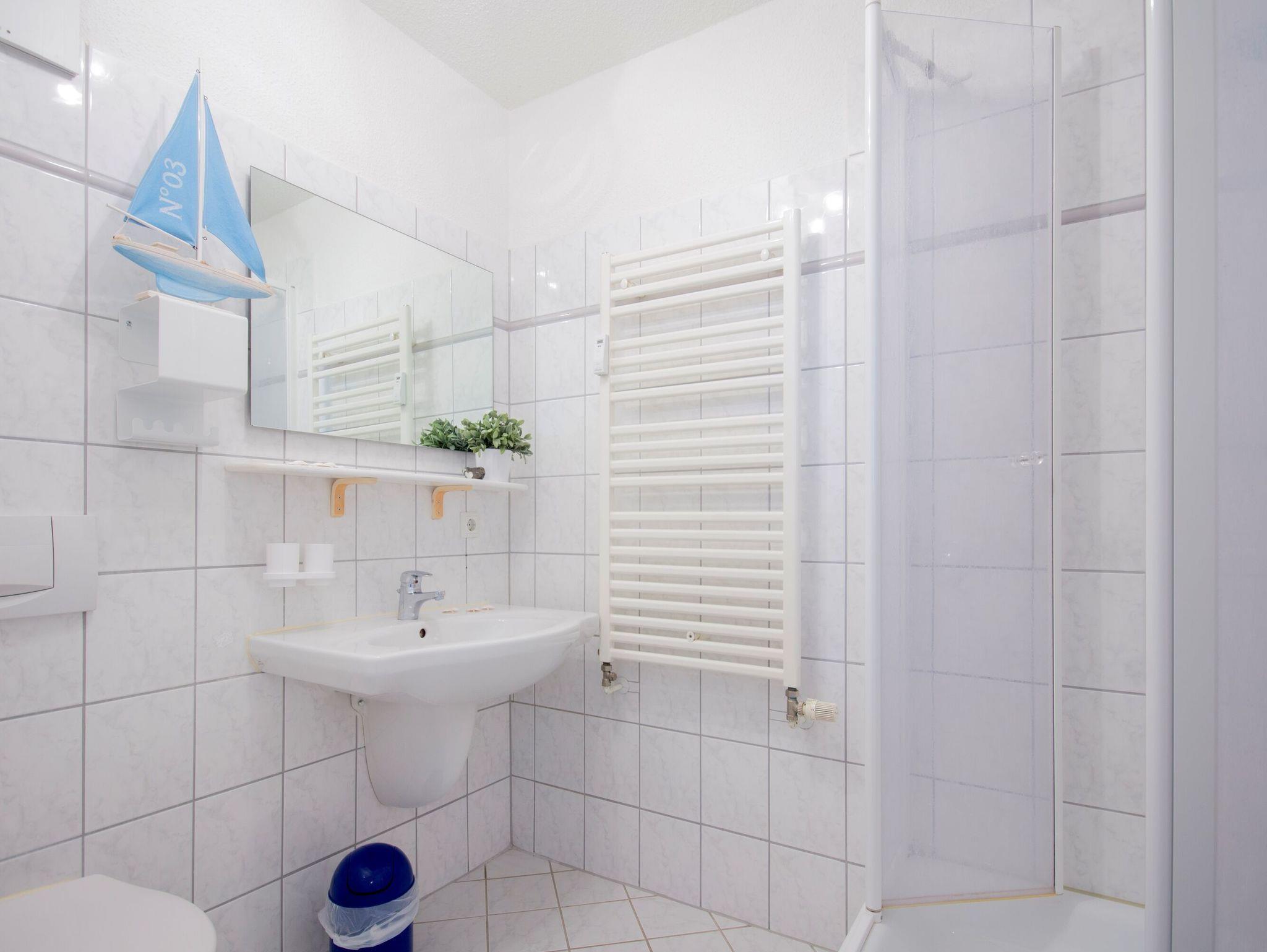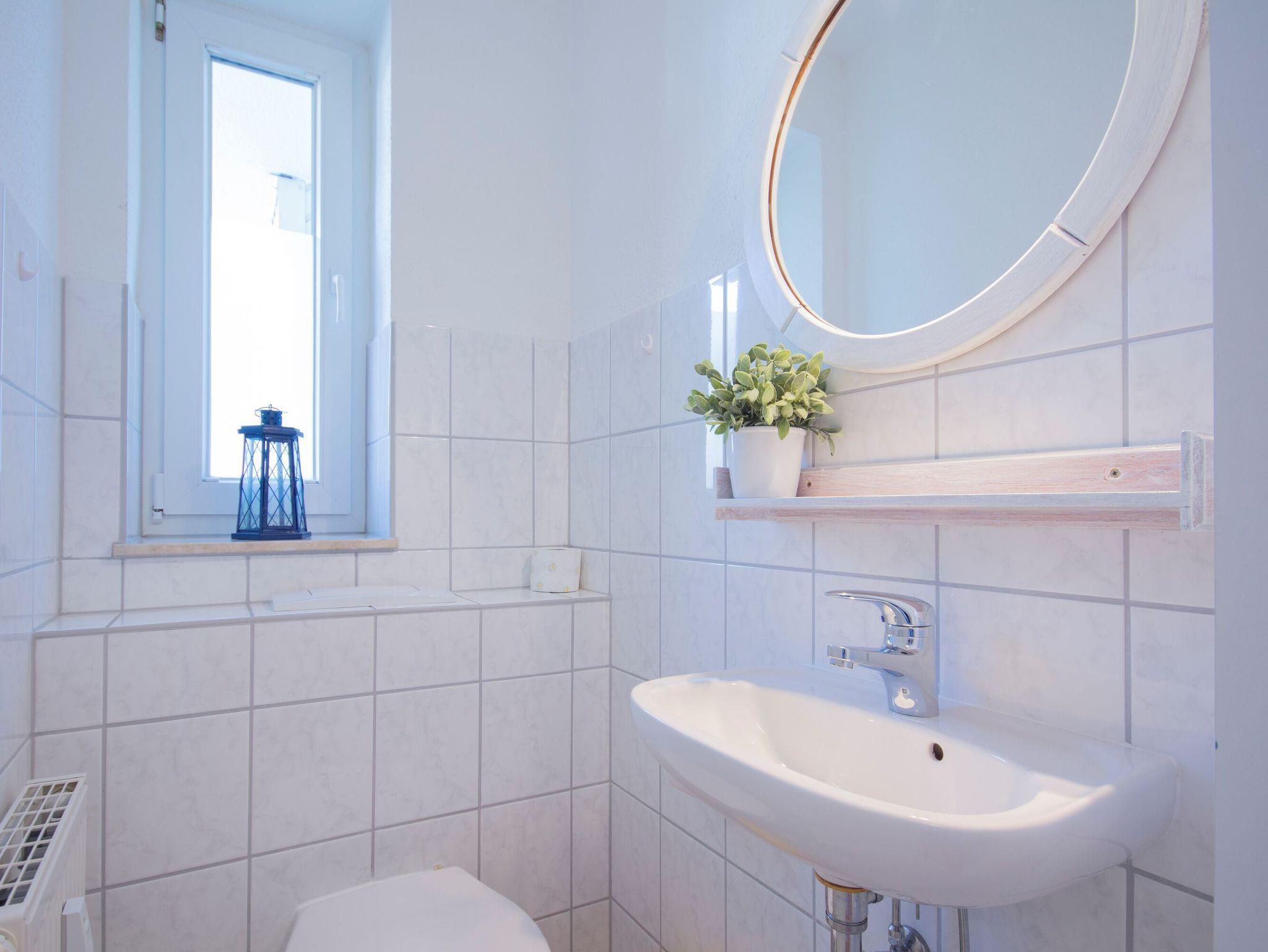 Das hell erleuchtete Badezimmer ist mit einer Dusche, einem Waschbecken mit großem Spiegel und einer Toilette ausgestattet. Zudem gibt es noch ein separates Gäste-WC mit Fenster.