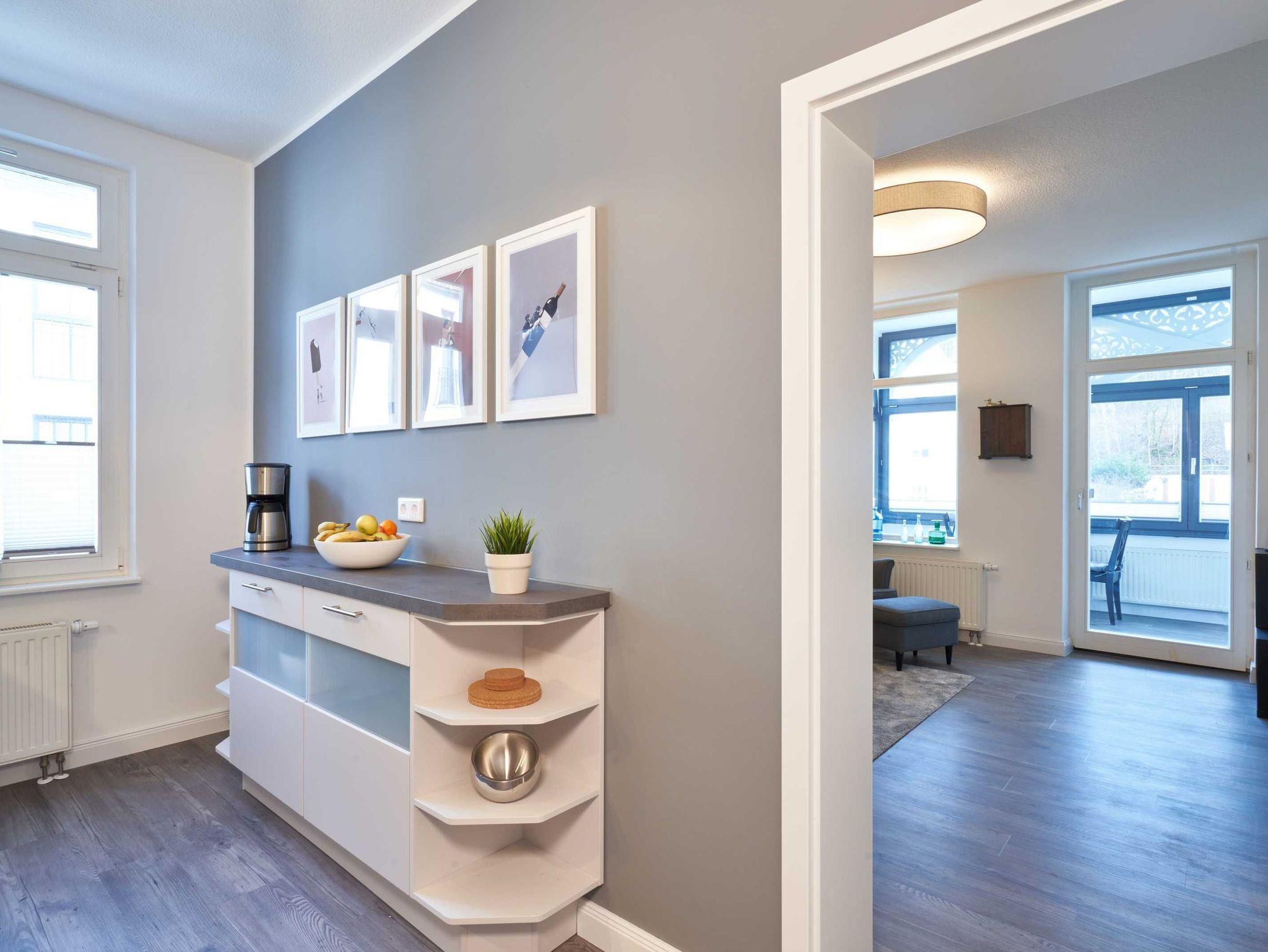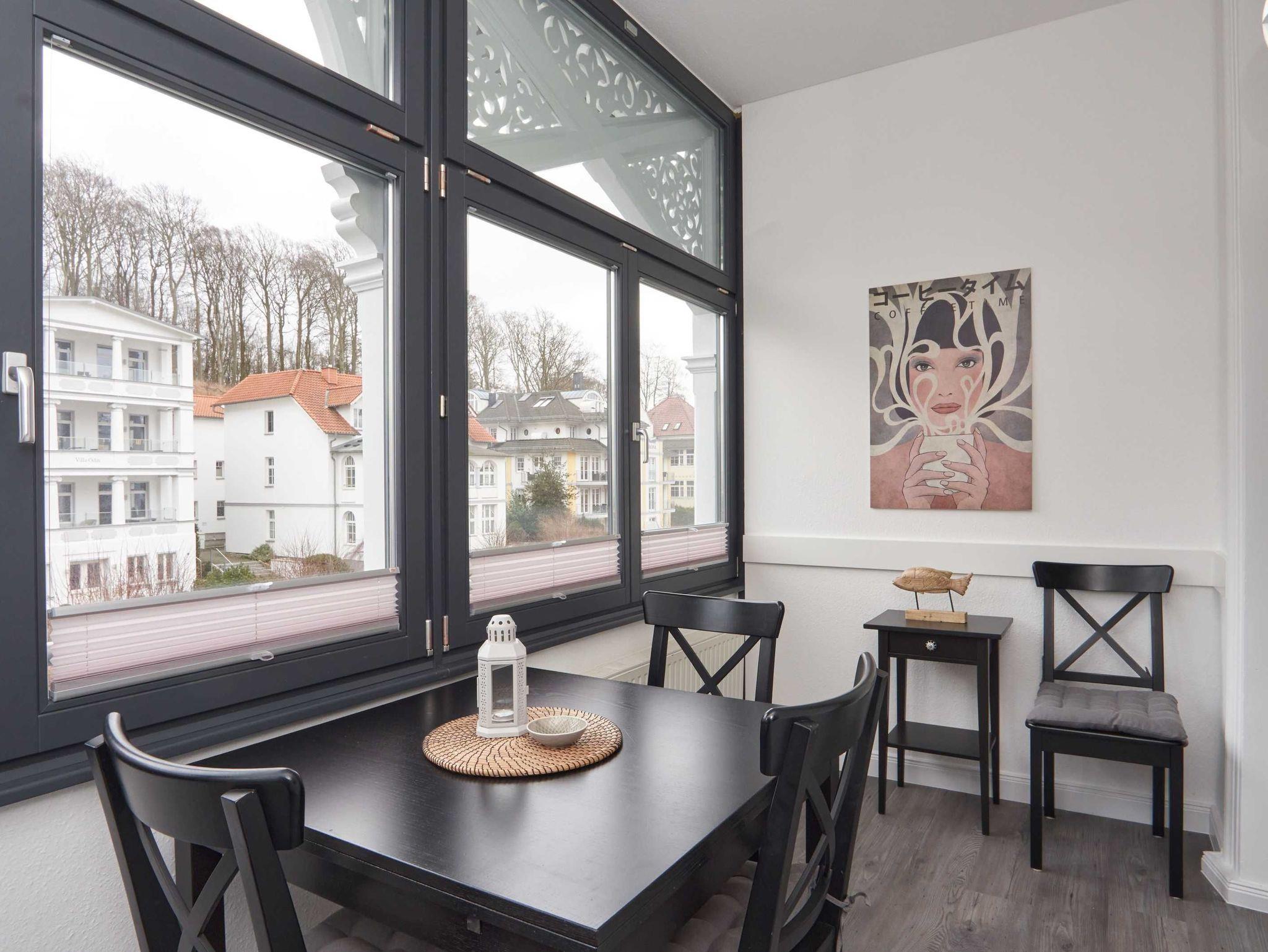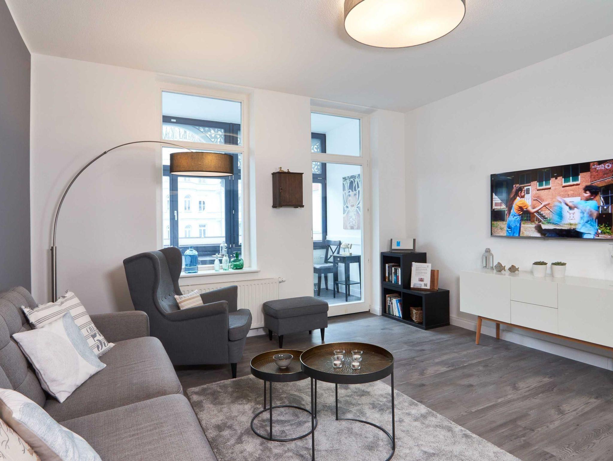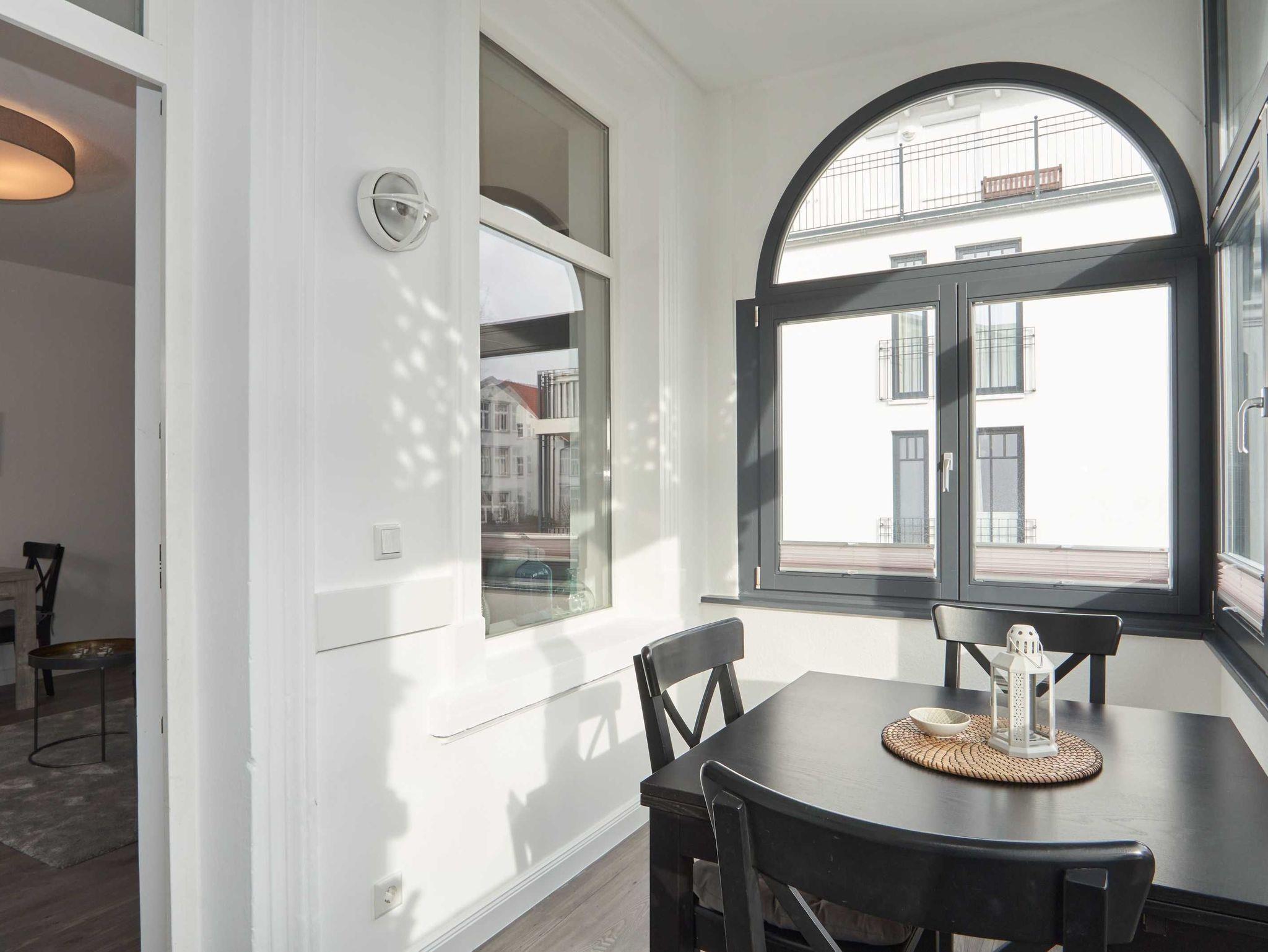 Es gibt 2 Schlafzimmer ( jeweils mit einem Doppelbett 1,80 m x 2,00 m), davon eines mit TV. Im gemütlichen Wohnbereich haben Sie einen Flat-TV und eine Musikanlage mit Bluetooth. WLAN ist inklusive. Bei Anreise mit einer 5. Person, vorzugsweise einem Kind, da die Liegefläche 1,15 m x 1,90 m ist, kann die Couch im Wohnbereich zu einem bequemen Bett umgewandelt werden. Vom schicken Wohnbereich aus gelangt der Gast in den vorgelagerten und verglasten Wintergarten, der einen traumhaften Blick auf die pittoreske Promenade der Wilhelmstrasse bietet. (Vorhänge als Sonnenschutz vorhanden). Genießen Sie Ihre Urlaubszeit in der wundervollen Atmosphäre des Wintergartens, in dem sich der Essbereich befindet. Die Fenster lassen sich alle öffnen und zu jeder Jahreszeit spürt man hier besonders den Charme des Wohnens in einer Villa aus den Anfängen des letzten Jahrhunderts.