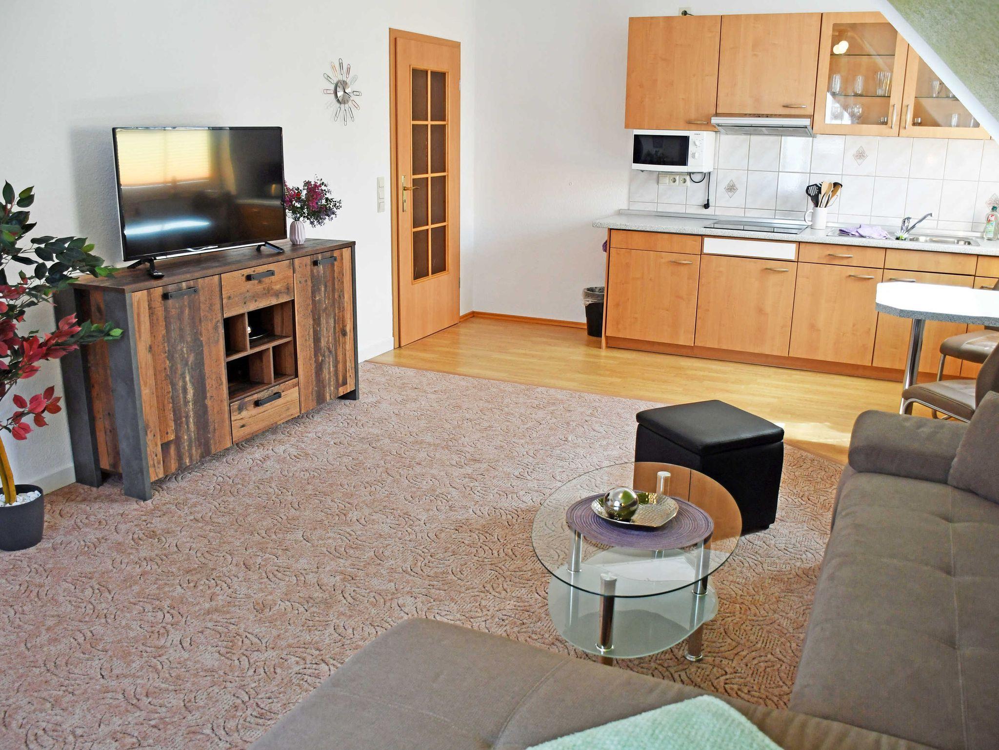Die 2-Raum Ferienwohnung 02 zwischen Ostsee und Bodden (50 qm, max. 2 erw. Gäste) hat getrennte Wohn- und Schlafräume. Im Wohnzimmer stehen Sitzcouch, Tisch und Stühle, ein Flachbild-TV und eine moderne Küchenzeile. Diese ist mit Ceranfeldherd, Spülmaschine, Wasserkocher, Kaffeemaschine, Toaster, Kühlschrank und Mikrowelle ausgestattet.