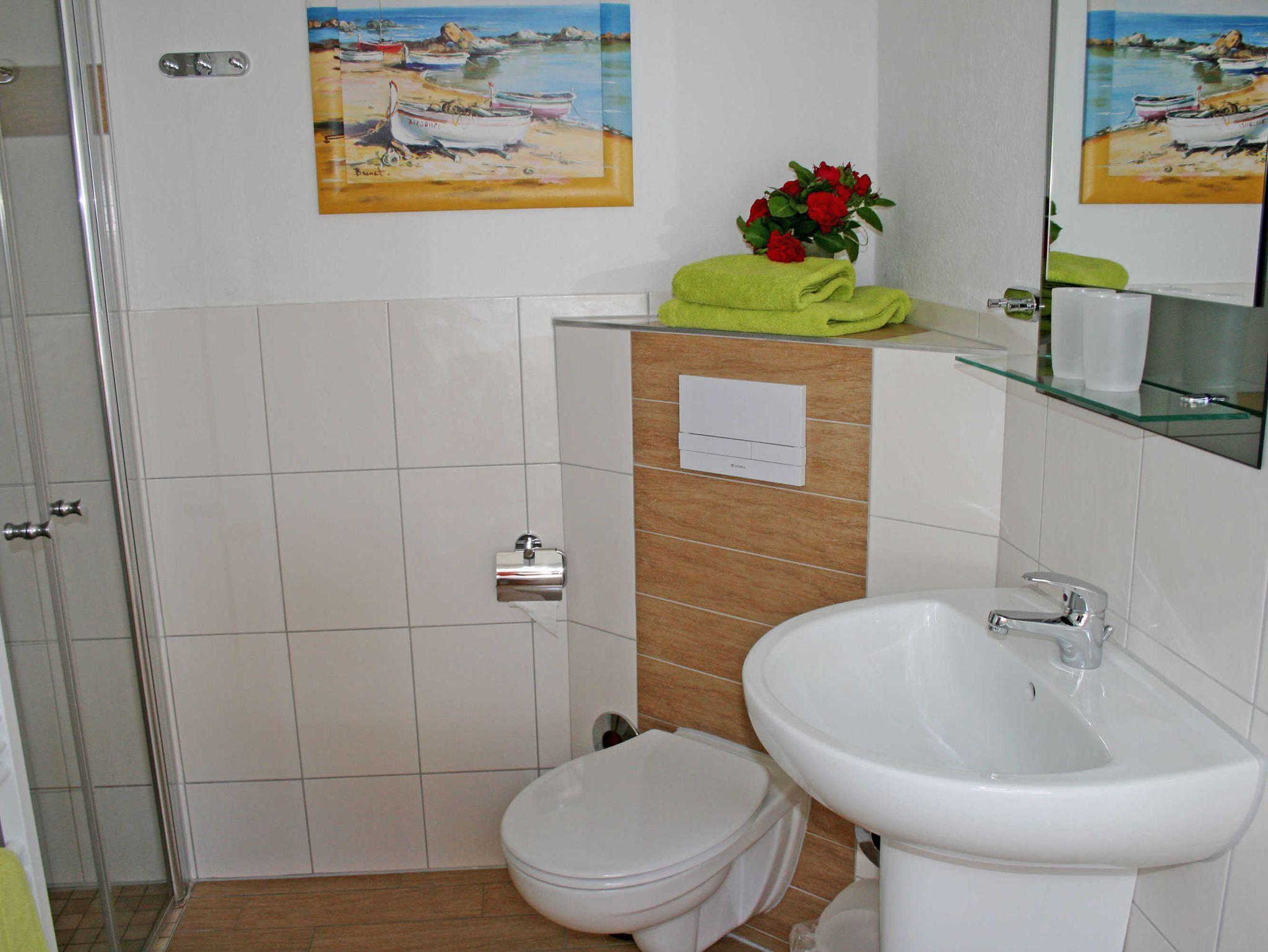 Das moderne Bad ist mit Dusche, WC und Waschtisch ausgestattet und verfügt über Tageslicht. Zum diesem Ferienhaus gehört auch eine schöne Balkonterrasse mit Gartenmöbeln.