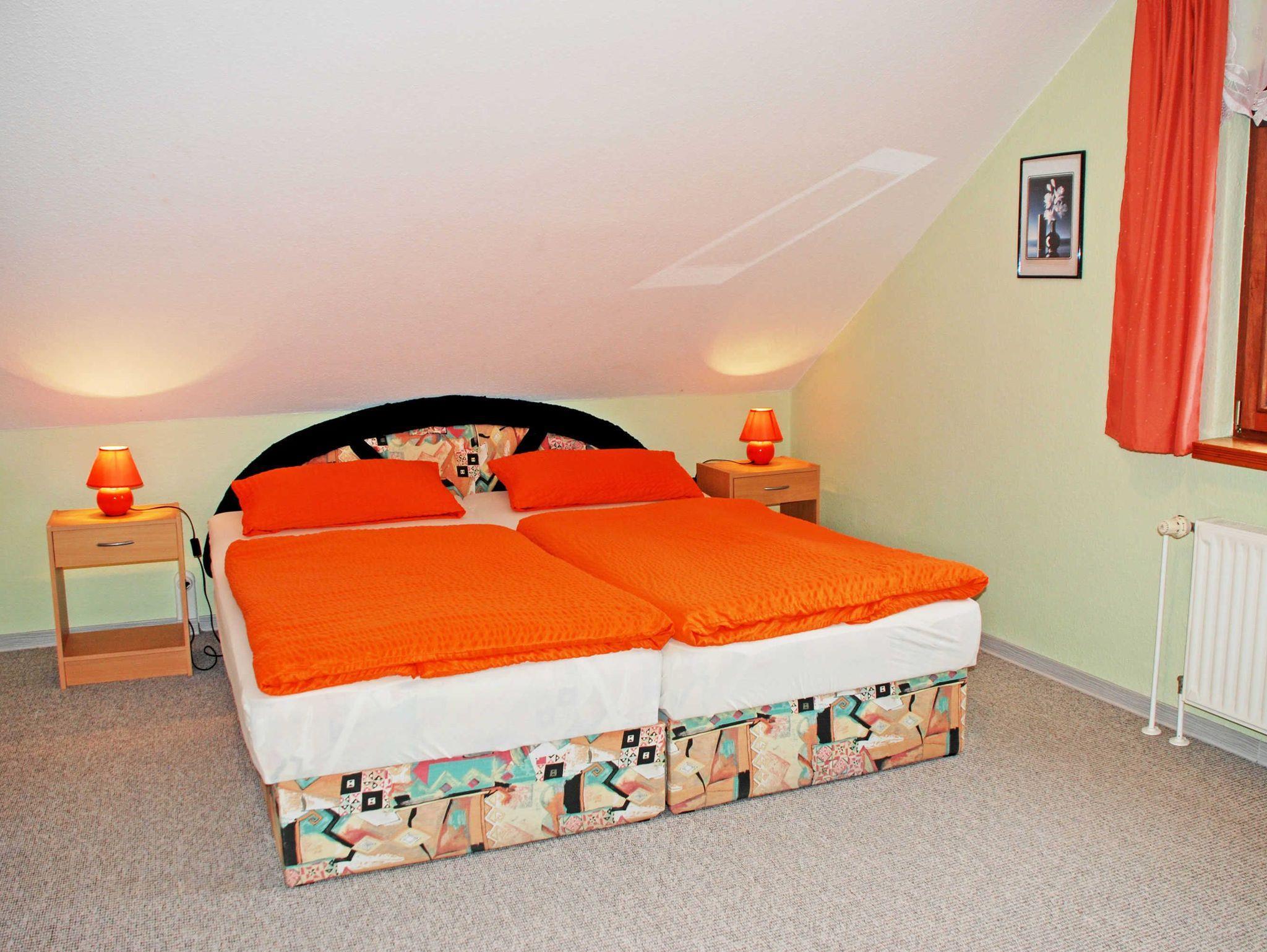 Das Dachgeschoss erreichen Sie über eine kleine Wechselstufentreppe. Hier befinden sich ein weiteres Schlafzimmer mit Doppelbett, Nachttischen und Leselampen, Flachbild-TV sowie Kleiderschrank. Hier kann für eine fünfte Person ein Zustellbett bereit gestellt werden. Aus diesem Zimmer haben Sie einen schönen Ausblick auf den Selliner See. Ein kleines Kinderreisebett und ein Hochstuhl können auf Wunsch kostenlos bereit gestellt werden.