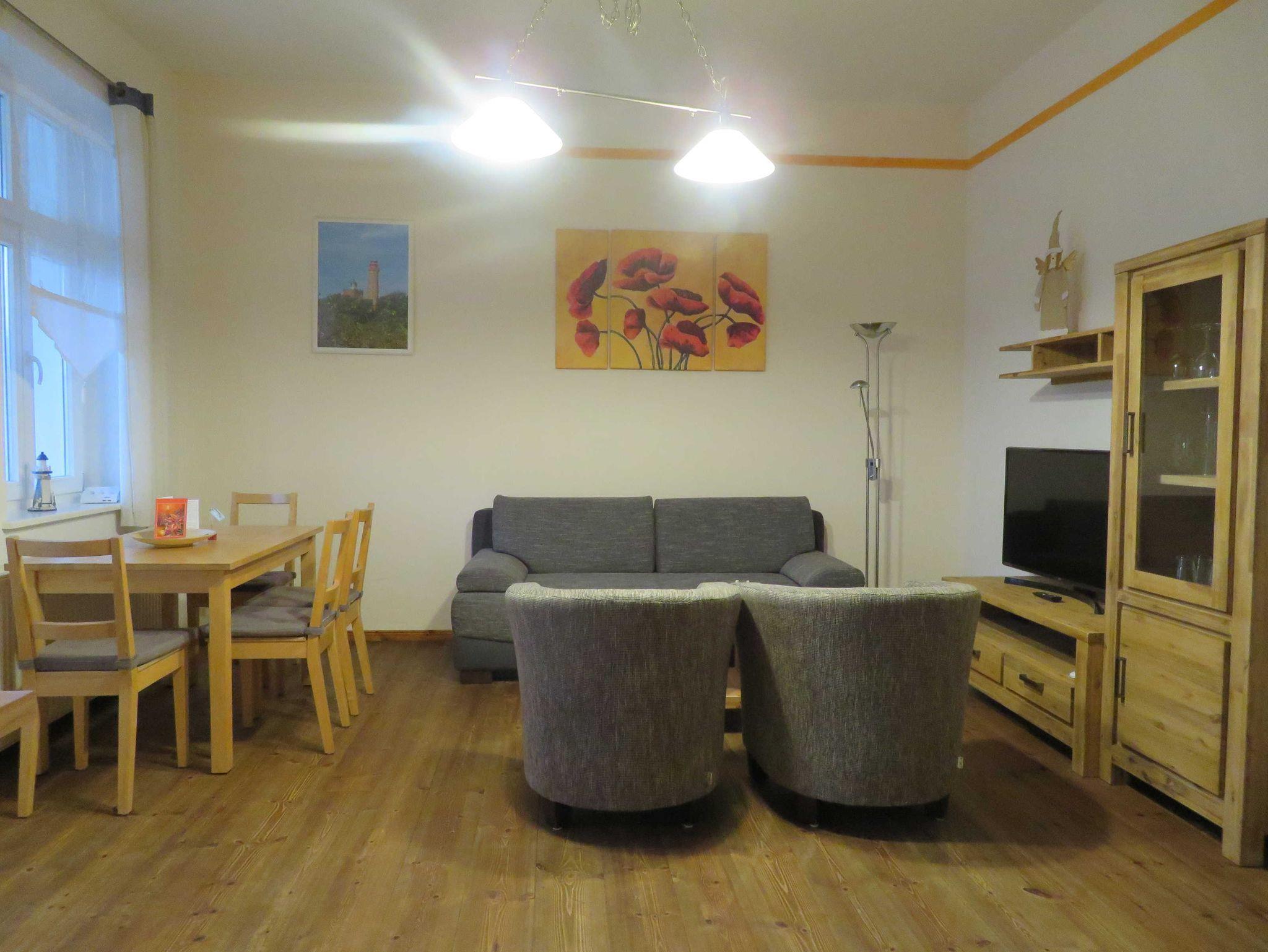 Die 2- Raum- Ferienwohnung hat ein Schlafzimmer mit einem Doppelbett und im Wohnzimmer ein Schlafsofa mit zwei weiteren Schlafplätzen. Im Wohnzimmer befindet sich die Küche mit Kühlschrank, Geschirrspülmaschine, Mikrowelle, Kaffeemaschine, Toaster und Wasserkocher. Die Ferienwohnung ist mit Kabel- TV ausgestattet und hat einen Balkon.