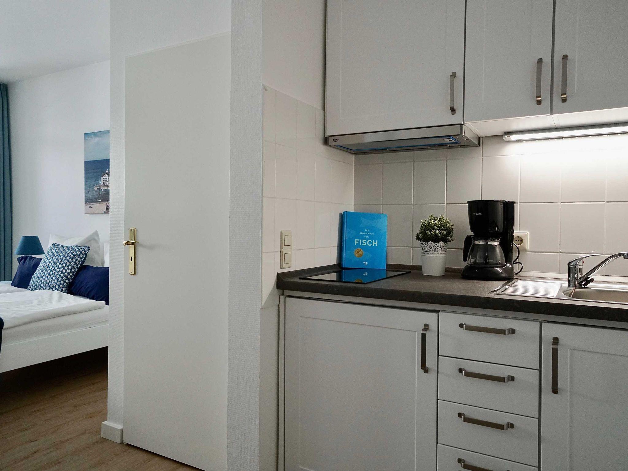 Das gemütliche Appartement Granitz (H) bietet Ihnen auf 30 - 34m² Platz für 2 Personen. Vom bequemen Doppelbett aus haben Sie einen direkten Blick auf den Flachbildfernseher. Entspannen können Sie in diesem Appartement sehr bequem auch im Wintergarten. Hier können Sie gemütlich frühstücken oder den Abend bei einem Gläschen Wein verbringen. Der WLAN-Zugang und ein SodaStream steht Ihnen kostenfrei zur Verfügung. In der modernen Pantryküche finden Sie neben einem Kühlschrank, Kaffeemaschine und Wasserkocher sogar ein 2-Platten-Cerankochfeld, um kleine Mahlzeiten zuzubereiten. Im modern gefliesten Badezimmer finden Sie neben WC und Waschbecken auch eine Dusche. Ein Babybett (bis zwei Jahre) kann bei Bedarf aufgestellt werden. Ein Fön gehört ebenfalls zur Ausstattung. Dieses Appartement liegt im Erdgeschoss, 1. oder 2. Obergeschoss mit Südost- bzw. Südwest-Ausrichtung.