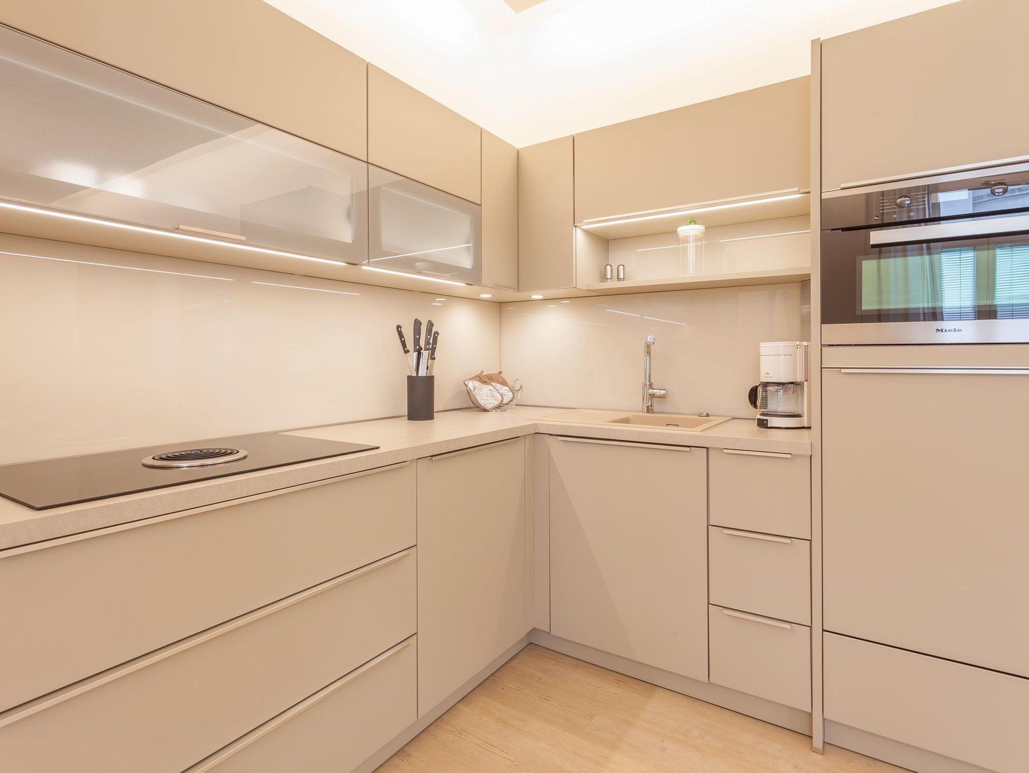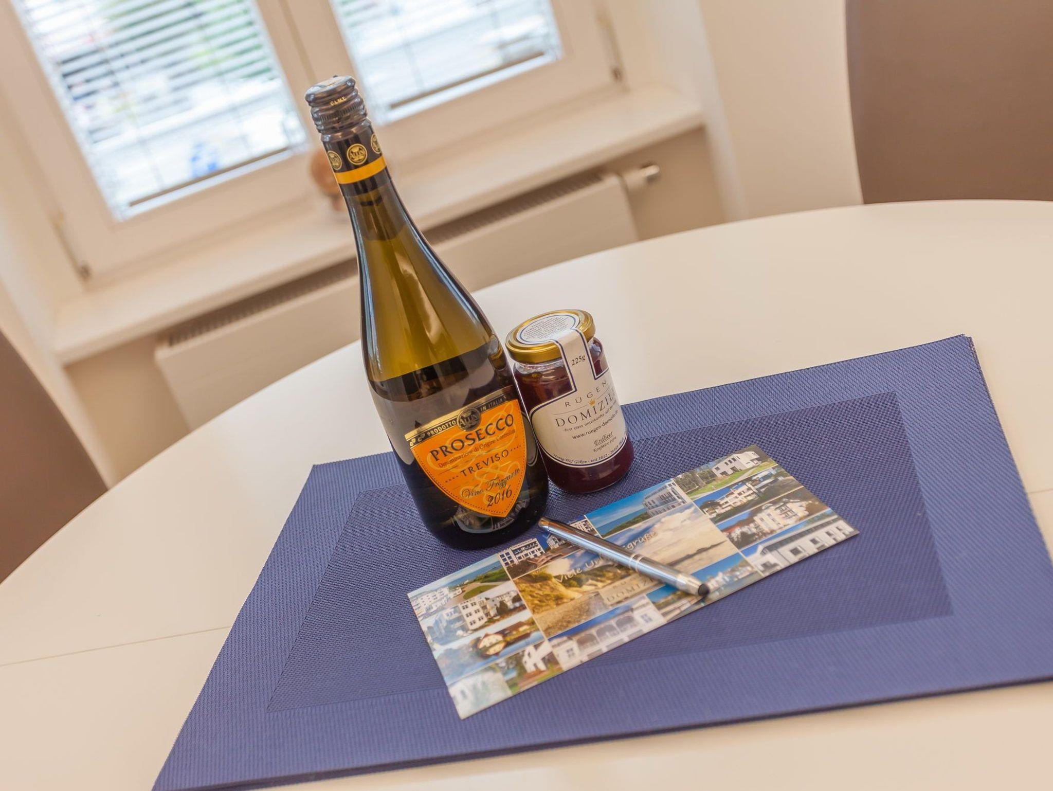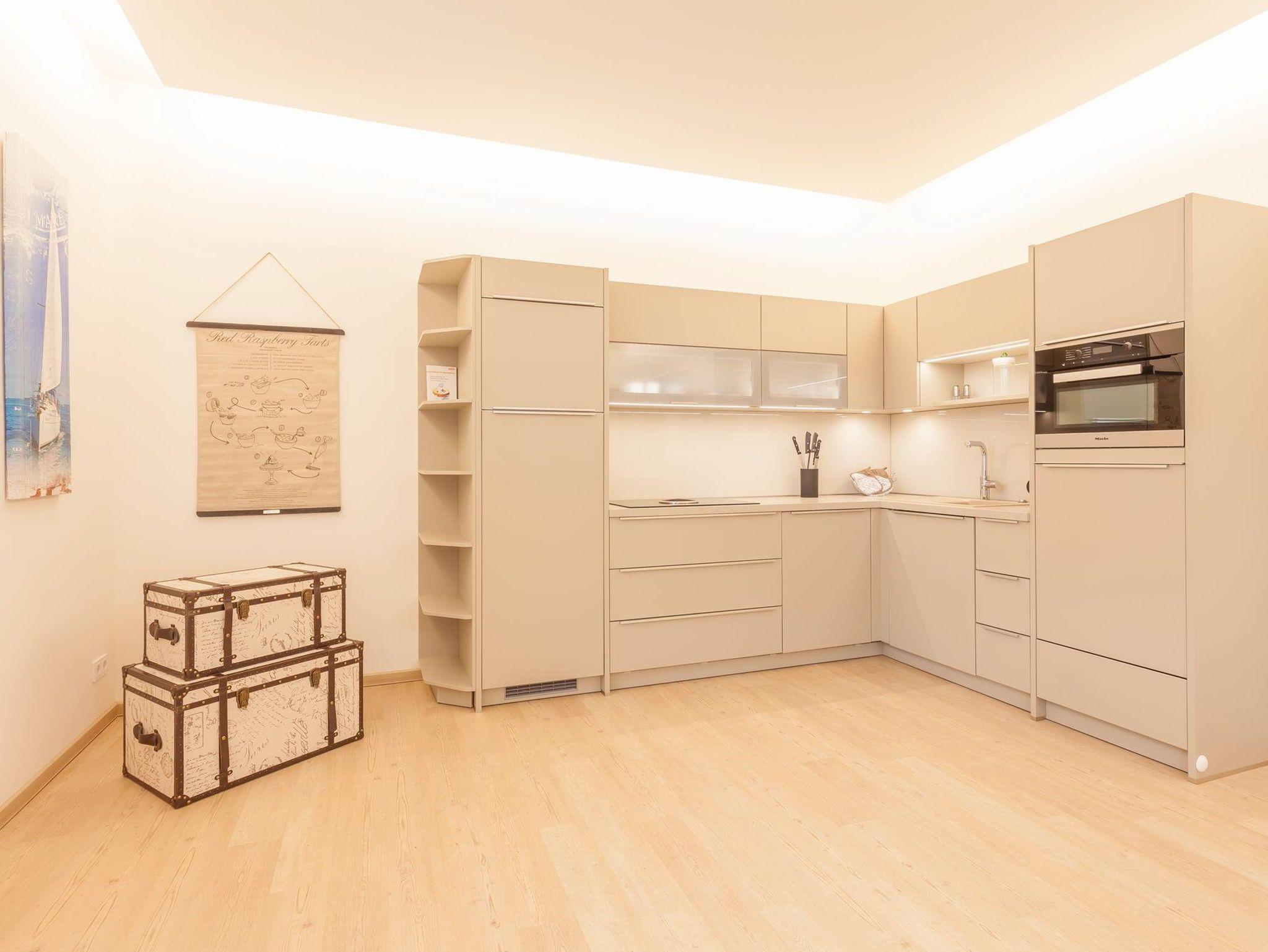 Die Fewo ist auf gut 90 qm Wohnfläche und dreieinhalb Zimmern für bis zu fünf Personen ausgelegt. Der großzügige Wohn-, Koch- und Essbereich besticht neben gemütlichen Couchmöbeln, einem großformatigen Flachbild-TV, einer Stereoanlage und kostenfreiem W-LAN mit seiner bestens ausgestatteten Küche von MIELE. Dank Kühl-/Gefrierkombi, Ceran-Induktionsherd, Backofen, Spülmaschine, Kaffeemaschine, Wasserkocher, Toaster etc. können Sie sich bequem selbst bekochen, wenn Sie nicht gerade in einem der zahlreichen guten Restaurants in der Nähe speisen. Der Esstisch im kreisrunden Erker bietet jedenfalls genügend Platz für ein stilvolles Essen ganz in Familie.