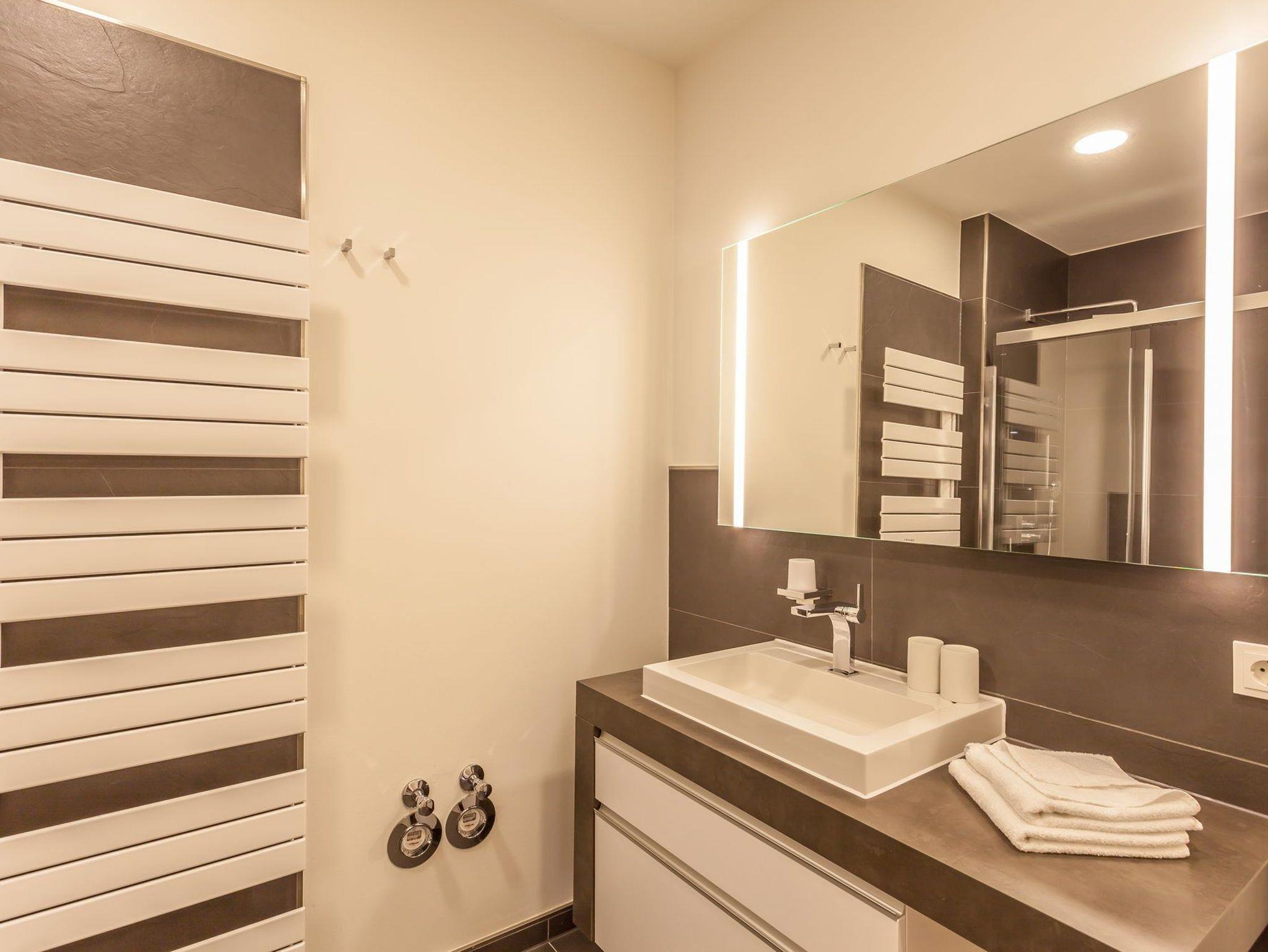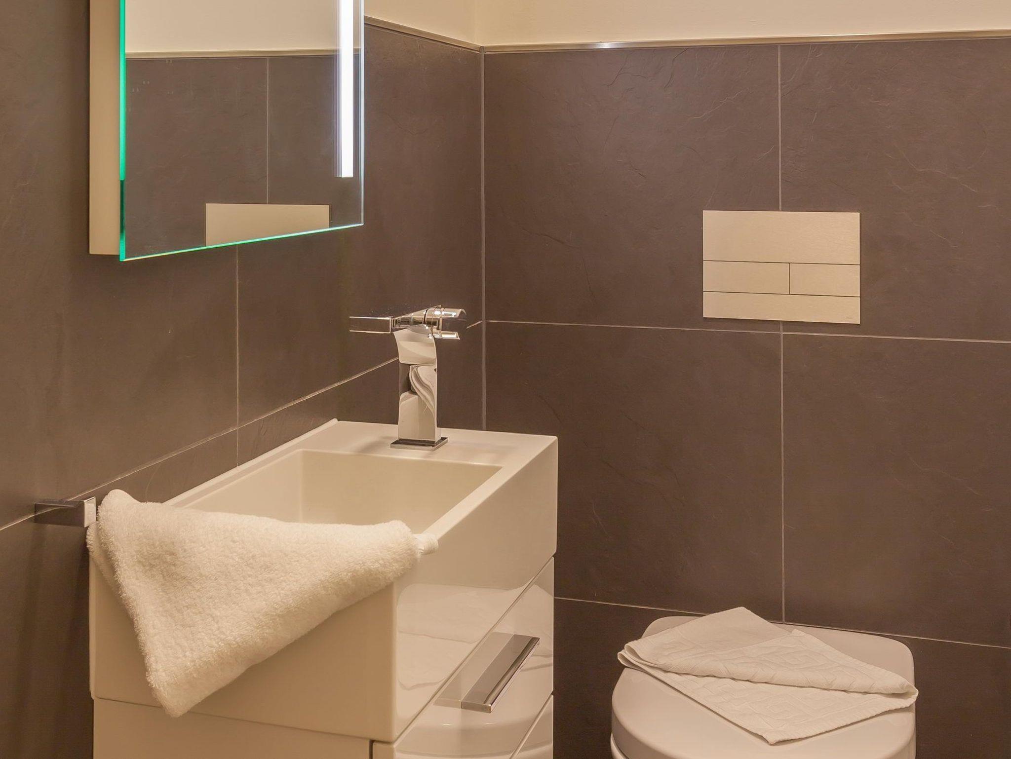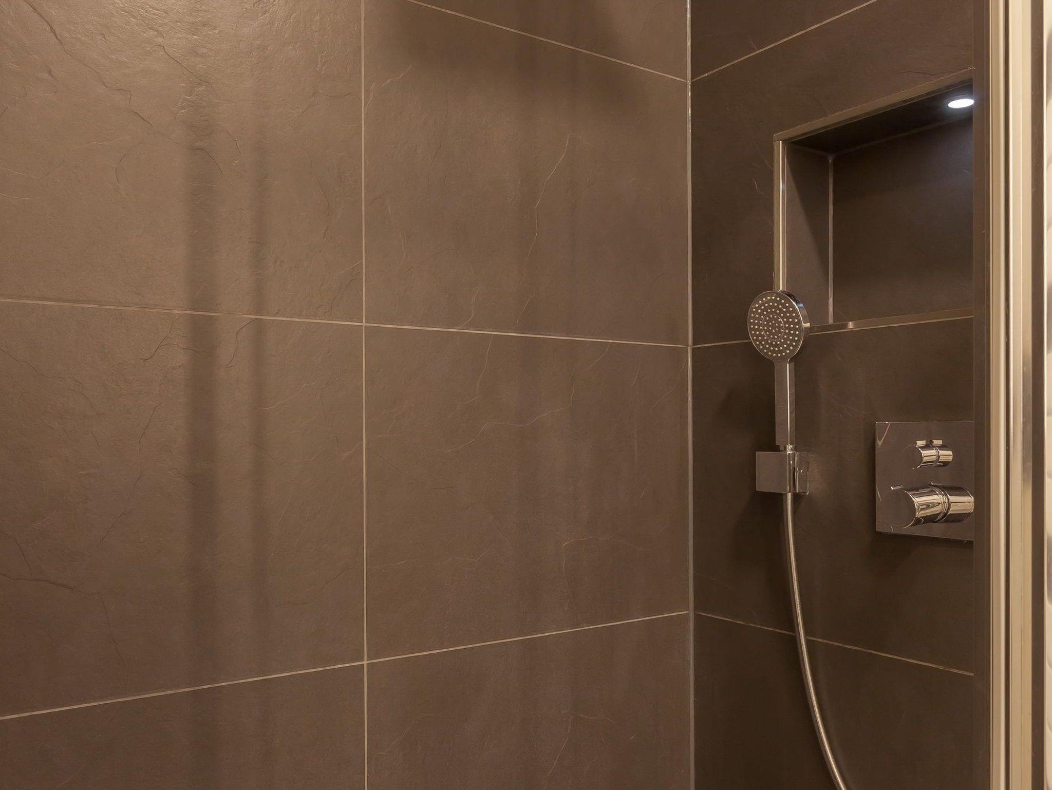 Das stilvoll geflieste Badezimmer Ihrer Fewo ist mit einer großen bodentiefen Dusche, Waschtisch und WC ausgestattet. Ein zusätzliches Gäste-WC sorgt für entspannten Komfort.