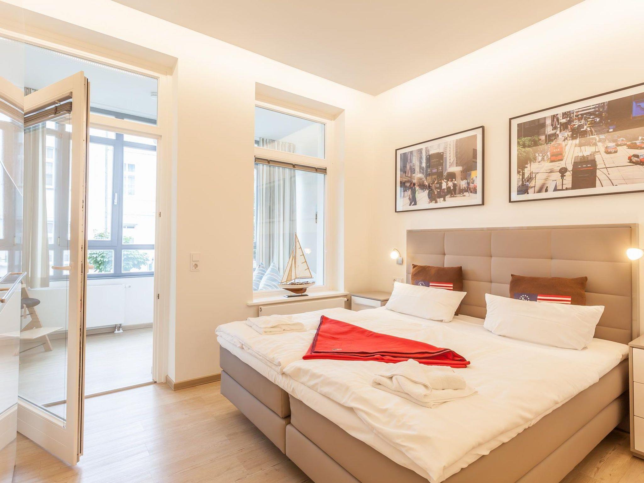 Auch beim Schlafkomfort müssen Sie keine Kompromisse eingehen. Das größere der beiden Schlafzimmer ist mit einem eleganten Doppelbett (180x200 cm), einem zweiten Fernseher und einem geräumigen Kleiderschrank ausgestattet. Auf der direkt angrenzenden, geschlossenen Veranda gibt es ein separates Einzelbett (100x200 cm). Das kleine Schlafzimmer wartet mit einem weiteren Doppelbett (140x200 cm) nebst Kleiderschrank auf und hat Zugang zur überdachten West-Loggia mit Blick auf die Wilhelmstraße.