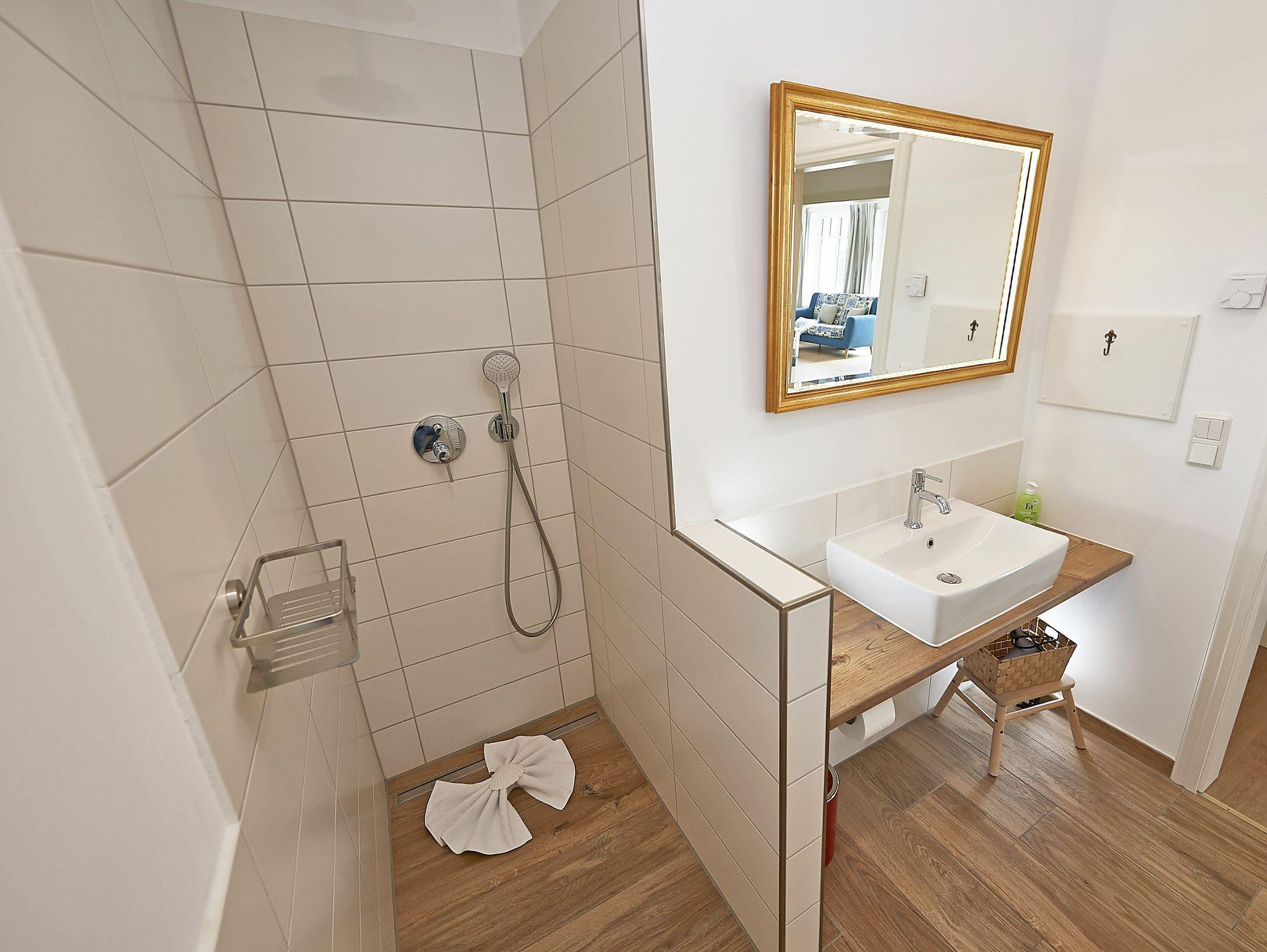 Der große Wohnraum mit dem Küchen- und Essbereich bildet das Herzstück des Hauses. Weiterhin gibt es im Erdgeschoss ein Schlafzimmer mit 2 Einzelbetten, die sich nach Wunsch arrangieren lassen, sowie ein Badezimmer mit Rain-Shower-Dusche, WC und Waschtisch. Das Erdgeschoss wird durch eine Fußbodenheizung beheizt.