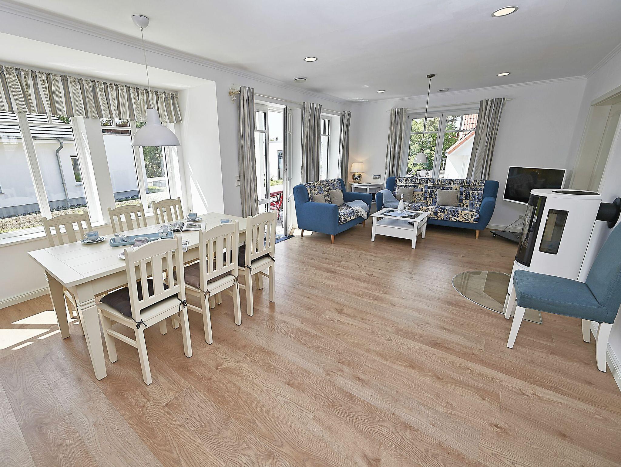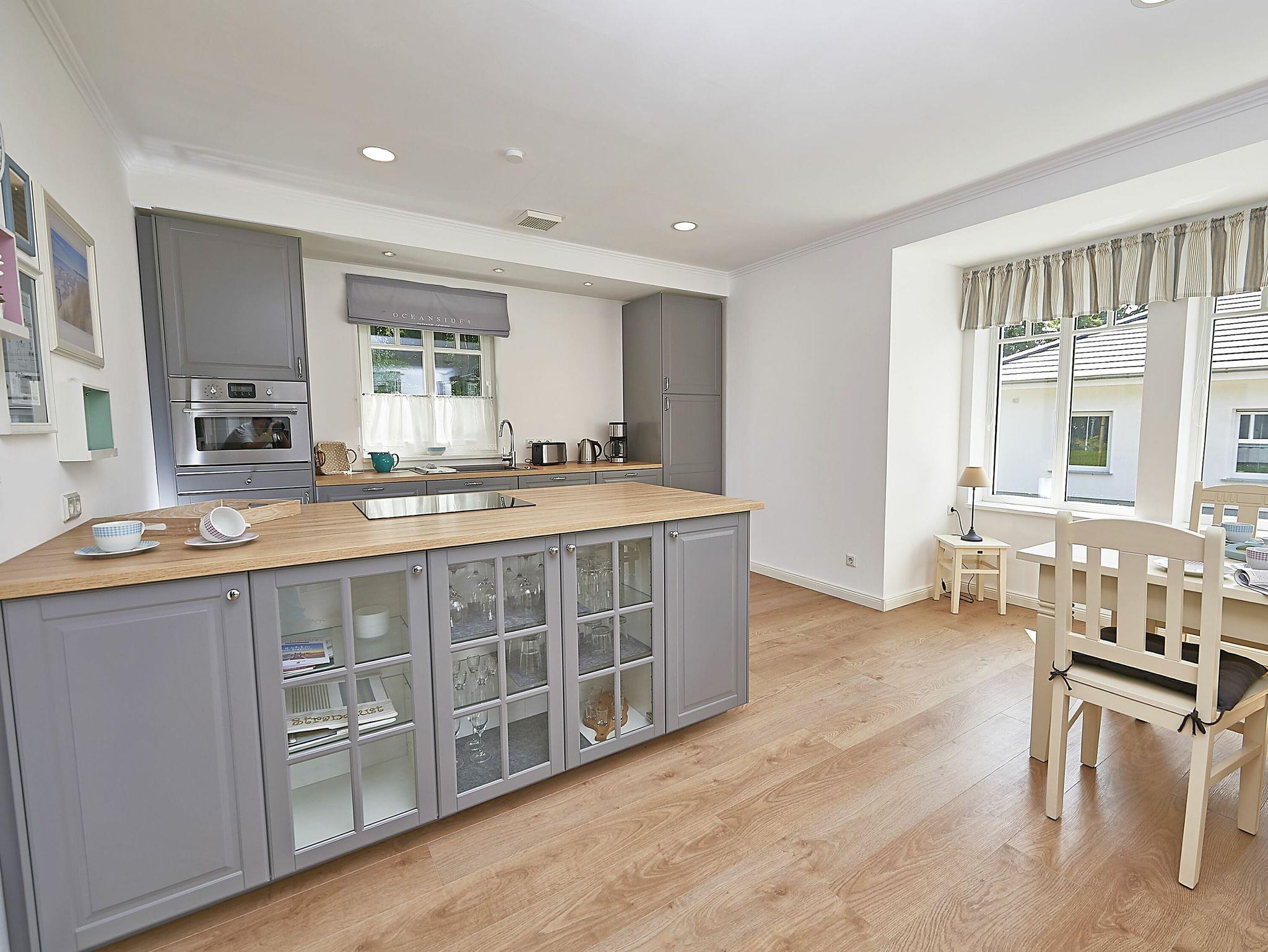 Die Wohnfläche beträgt mehr als 120 Quadratmeter und der großzügige Wohnraum, inklusive Küche und Essbereich garantiert einen entspannten Aufenthalt mit der Familie oder mit Freunden. Die Einrichtung besteht aus hochwertigen Möbeln im Landhausstil, die dazu passende Farbpalette findet sich vor allem in den Tönen weiß, grau, mauve und meerblau wieder.