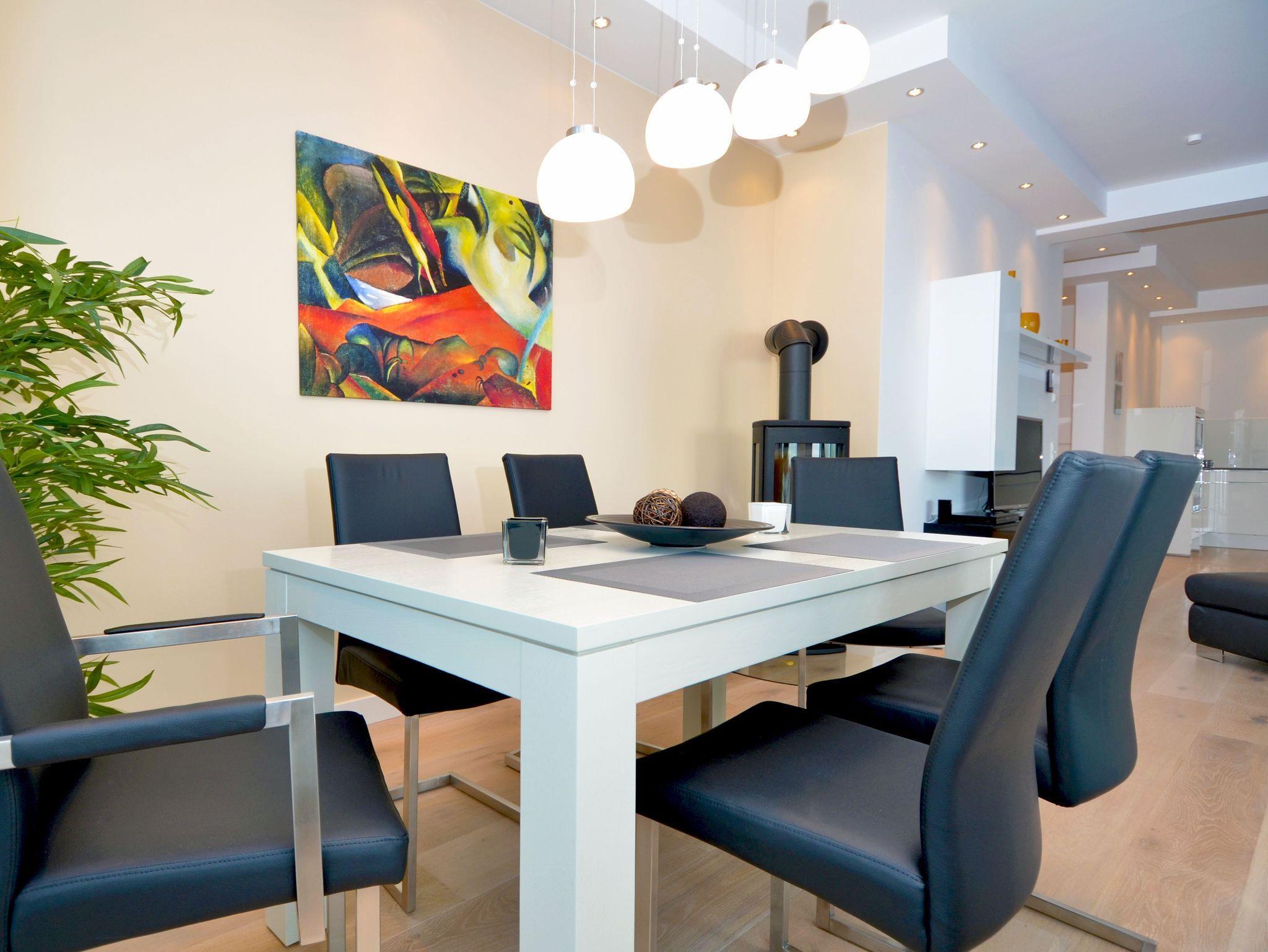 Vom Eingangsbereich aus betreten Sie den großzügigen Wohnbereich. Hochwertige Lederpolstermöbel, ein Heimkino-System, DVD-Player und ein großformatiger LCD-Fernseher laden zum Ausspannen nach einem erlebnisreichen Tag ein. An kühleren Tagen sorgt das prasselnde Feuer des Kaminofens für behagliche Stimmung. Der offene Essbereich mit großem Tisch bietet ausreichend Platz für ein gemütliches Zusammensein auch mit Gästen.