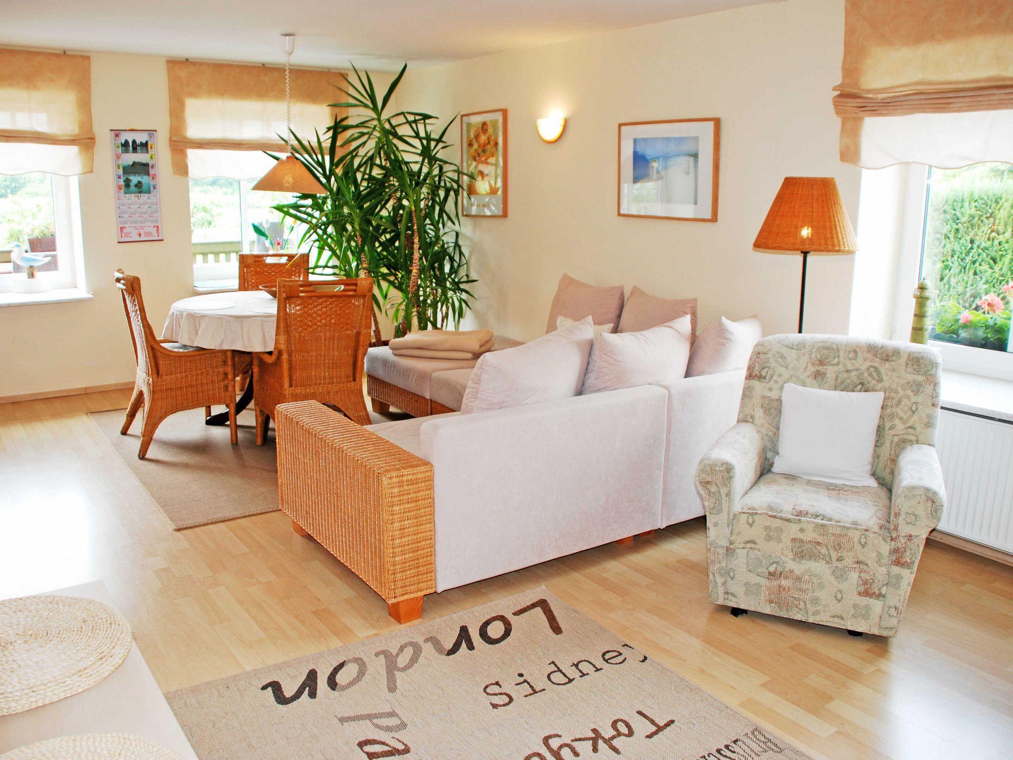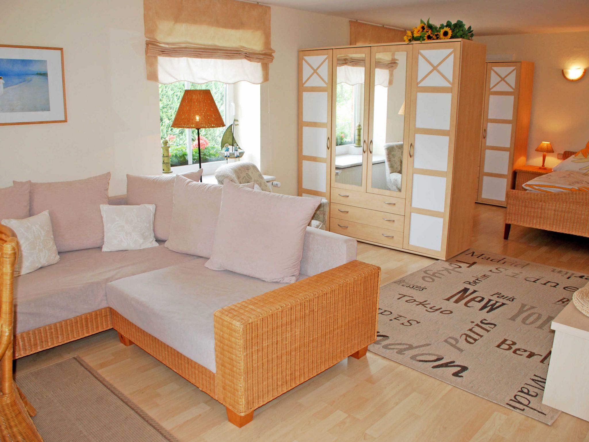 Das Appartement verfügt über einen separaten Eingang. Es ist modern ausgestattet und bietet einen großen kombinierten Wohn- und Schlafraum mit Doppelbett, Nachttischen und Leselampen. Im Wohnbereich steht eine große Couch die für zwei Gäste aufgebettet werden kann. Weiterhin gehören zur Ausstattung ein Tisch mit Rattanstühlen sowie TV und CD-Player, eine Küchenzeile mit Herd, Kühlschrank, Mikrowelle, Spüle, Kaffeemaschine, Wasserkocher und ein Esstisch mit Stühlen. Ein großer Kaminofen sorgt besonders in der kälteren Jahreszeit nach einem Strandspaziergang für Wärme und Gemütlichkeit. Das moderne Bad verfügt über Dusche, Waschbecken und WC. Bei Ihrer Anreise liegen frische Handtücher bereit und die Betten sind