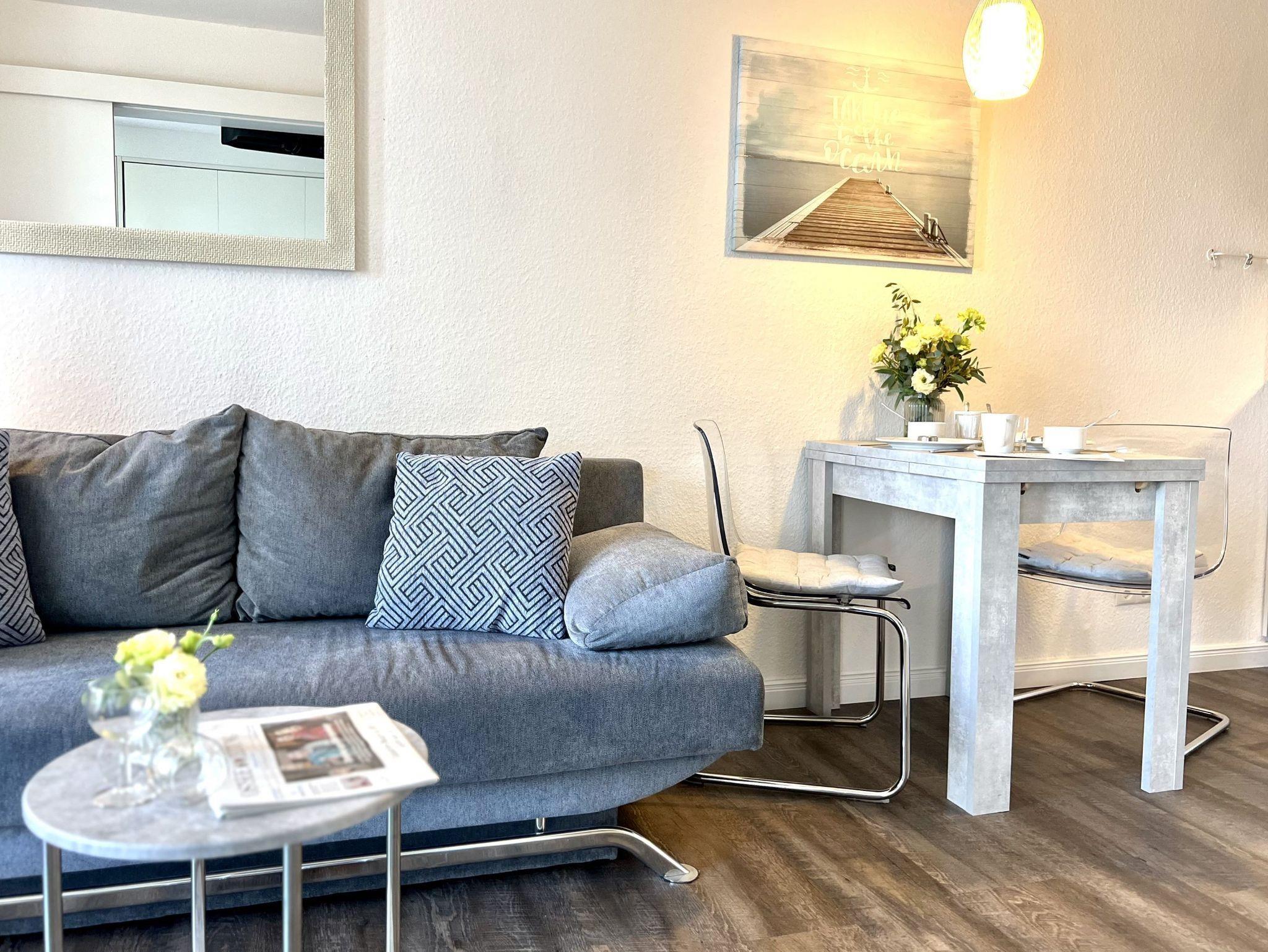 Die Ausstattung der Ferienwohnung umfasst kostenloses WLAN und eine Erstausstattung an Bettwäsche. Im Schlafzimmer befindet sich ein Doppelbett in Form eines Schrankbetts und bietet die Annehmlichkeit eines TV und im Wohnzimmer steht eine Doppelschlafcouch zur Verfügung. Das Badezimmer ist mit einer Dusche, einem WC, einem Föhn und einem Kosmetikspiegel ausgestattet. In der offenen Küche gibt es eine Mikrowelle mit Grillfunktion, eine Kaffeemaschine und einen Toaster. Zur Unterhaltung steht ein Fernseher mit 3 Sky-Sendern bereit. Auf dem Balkon mit Nordwestlage können Sie den Ausblick genießen und auf der Sitzgruppe entspannen. Die Ferienwohnung ist ein Nichtraucher-Apartment und Haustiere sind nicht gestattet.