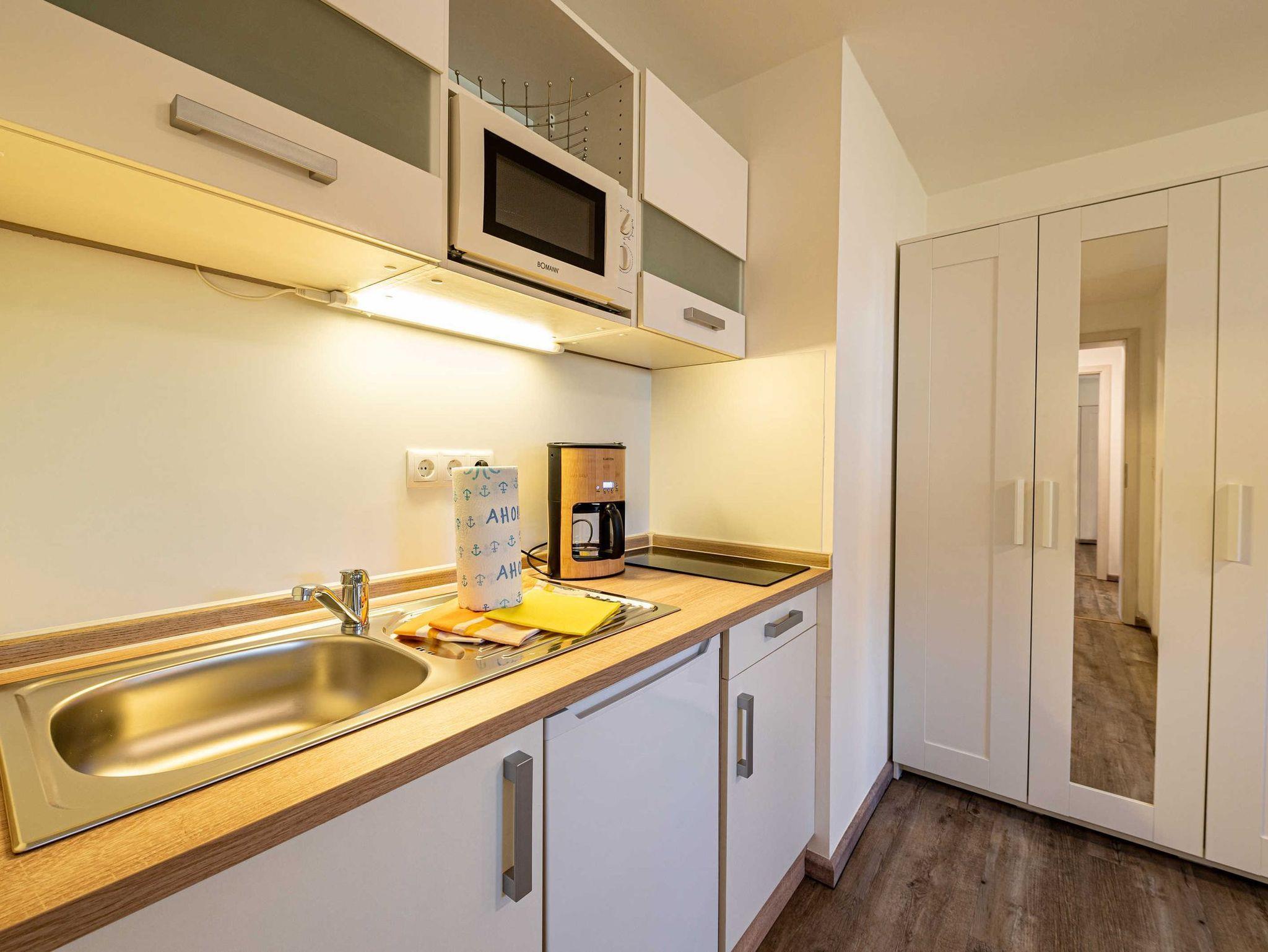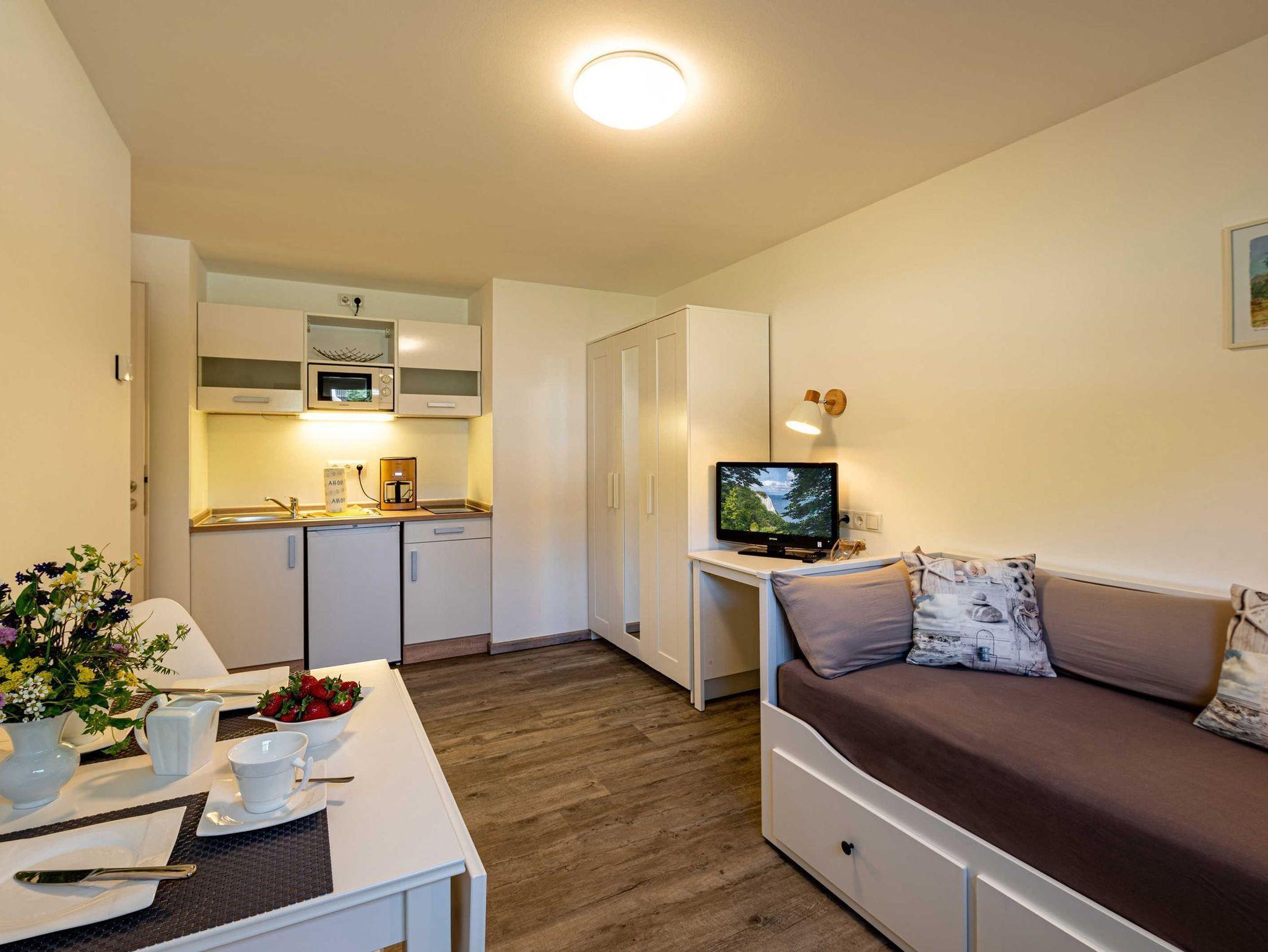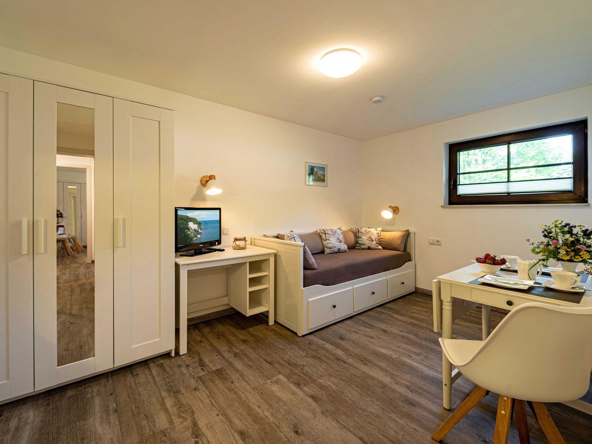 Im großen Wohn-Schlafraum befinden sich ein bequemes Doppelbett mit Nachtschränken und Leselampen, Sitzgelegenheiten, ein Kleiderschrank sowie ein modernes Flachbild-TV-Gerät.Und verfügt über eine Fußbodenheizumg die eine angenehme Wohlfühlwärme ausstrahlt. Gegen Aufpreis je Gast liegen für Sie bei Ihre Anreise frische Handtücher bereit und die Betten bereits mit Bettwäsche bezogen. Die dritte Schlafmöglichkeit befindet sich im kombinierten Wohn/Schlafraum. Dieser ist ausgestattet mit einem Einzelbett und Leselampe sowie ein Kleiderschrank. Auch befindet sich hier ein Flachbild-TV-Gerät. Eine integrierte Miniküche ist hier ebenfalls vorhanden. Hier finden Sie alle Utensilien vor, um sich ein Essen bereiten zu können.