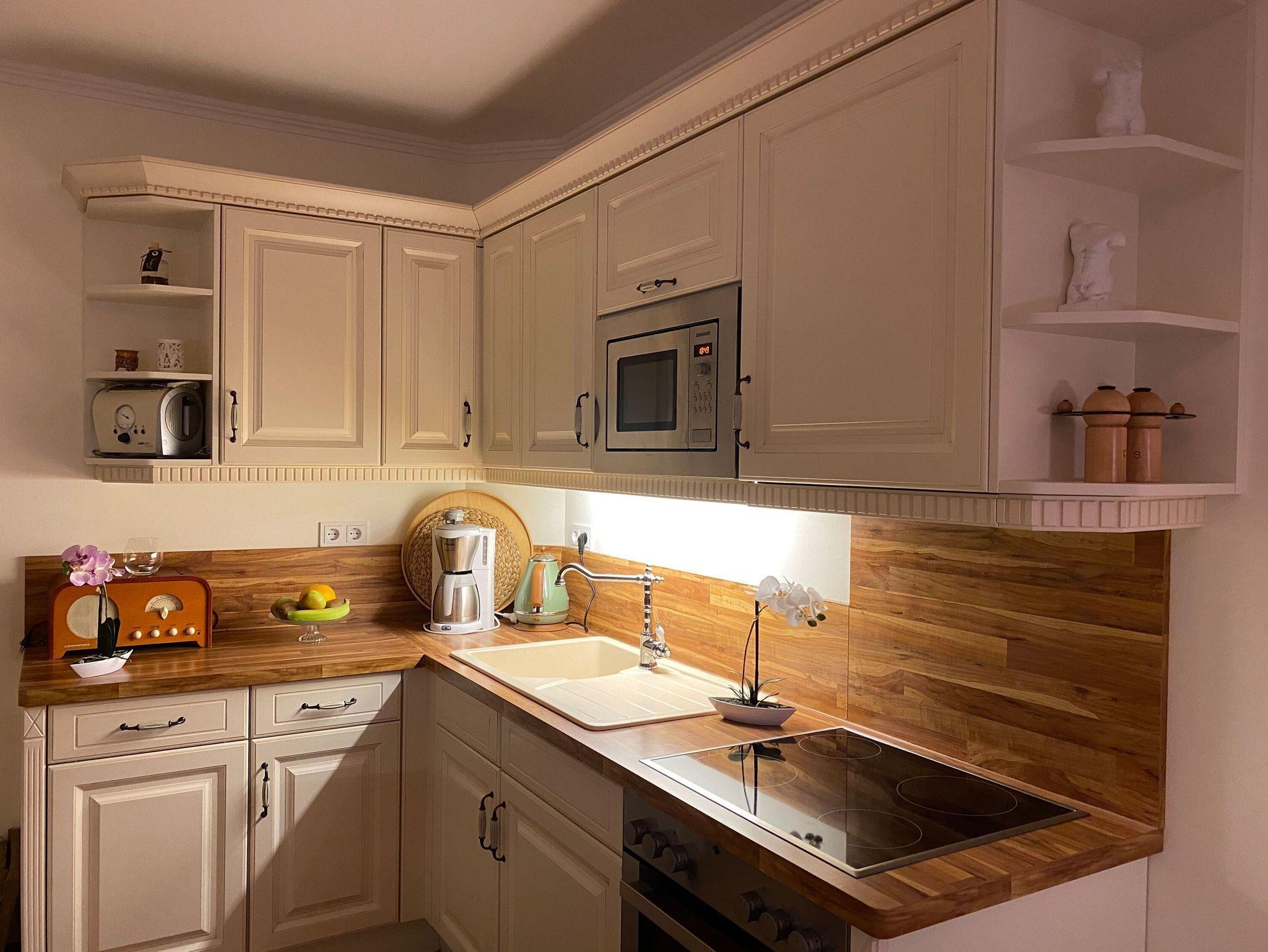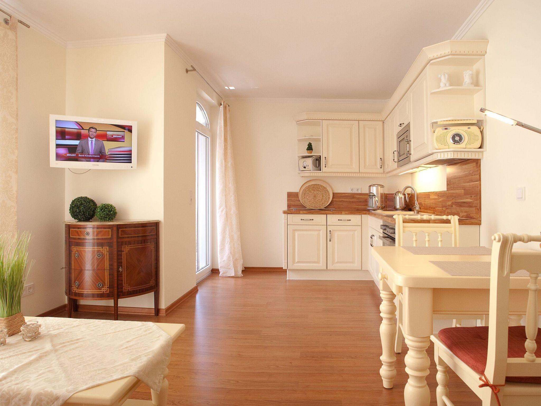 Die 42 qm große Ferienwohnung für 2 Personen ist in allen Räumen mit Stuck und dimmbaren Kronleuchtern ausgestattet. Der sonnige Südwest-Balkon liegt über der einmaligen Wilhelmstraße. Wohn- und Schlafzimmer besitzen weiße HD-Flachbildfernsehern an der Wand. Sie verfügen über Fußbodenheizung, W-Lan, Tiefgaragenparkplatz, von wo Sie direkt mit dem Fahrstuhl zur Wohnung fahren können. Das hochwertige Doppelbett verwöhnt Sie in einer Komforthöhe, das Schlafzimmer ist verdunkelbar. Der Duschbereich im Bad ist offen und auf Flusskieseln gebettet. Die Küche ist bestens ausgestattet.