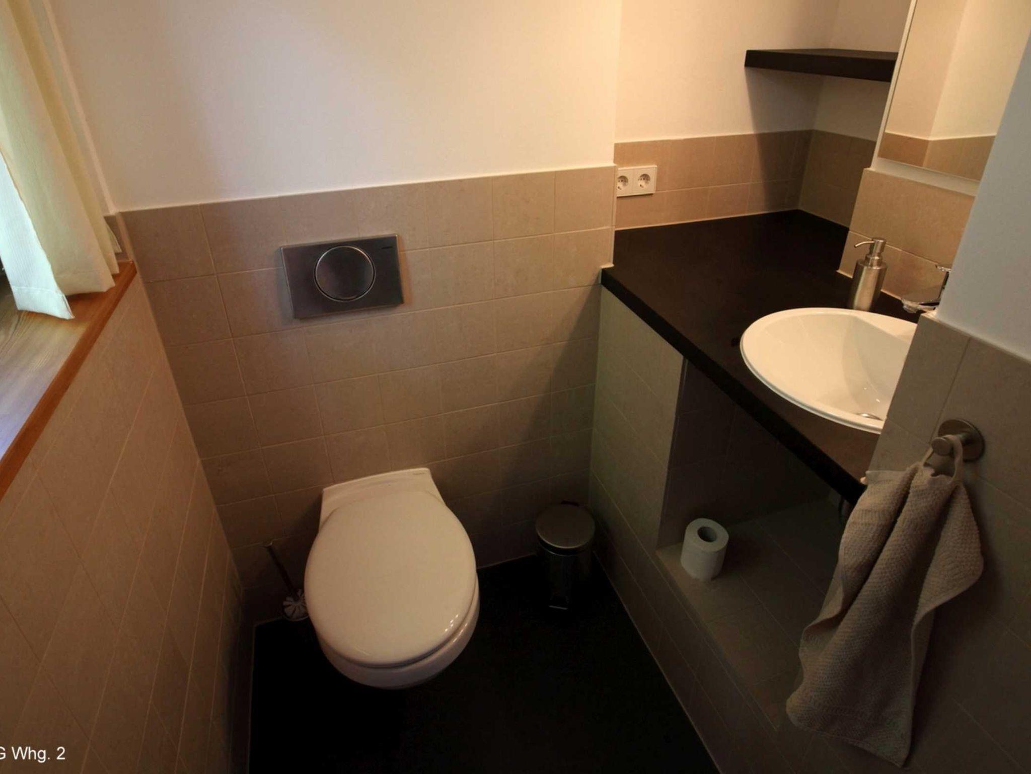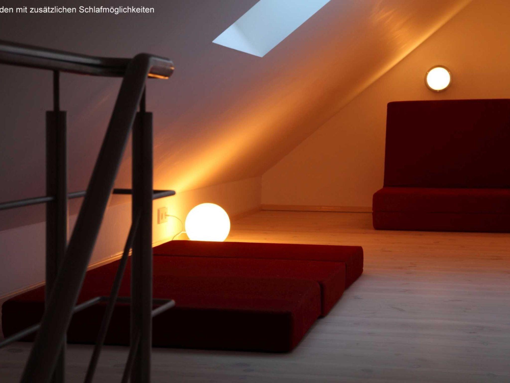 Ein Gäste-WC befindet sich neben dem Wohnbereich. Vom Wohnraum führt eine Treppe in den oberen Bereich, wo sich eine weitere Dusche/WC befindet. Ein Schlafzimmer ist mit einem Doppelbett und einem Schreibtisch mit Internetanschluss ausgestattet. Im zweiten Schlafzimmer befinden sich zwei Einzelbetten - von hieraus erreicht man über eine weitere bequeme Treppe den galerieartigen Spitzboden mit zwei zusätzlichen Schlafmöglichkeiten. Für kleinere Kinder stellen wir Hochstuhl und Kinderbett bereit. Die Betten sind bei Ihrer Anreise bezogen und die Handtücher liegen für Sie bereit.
