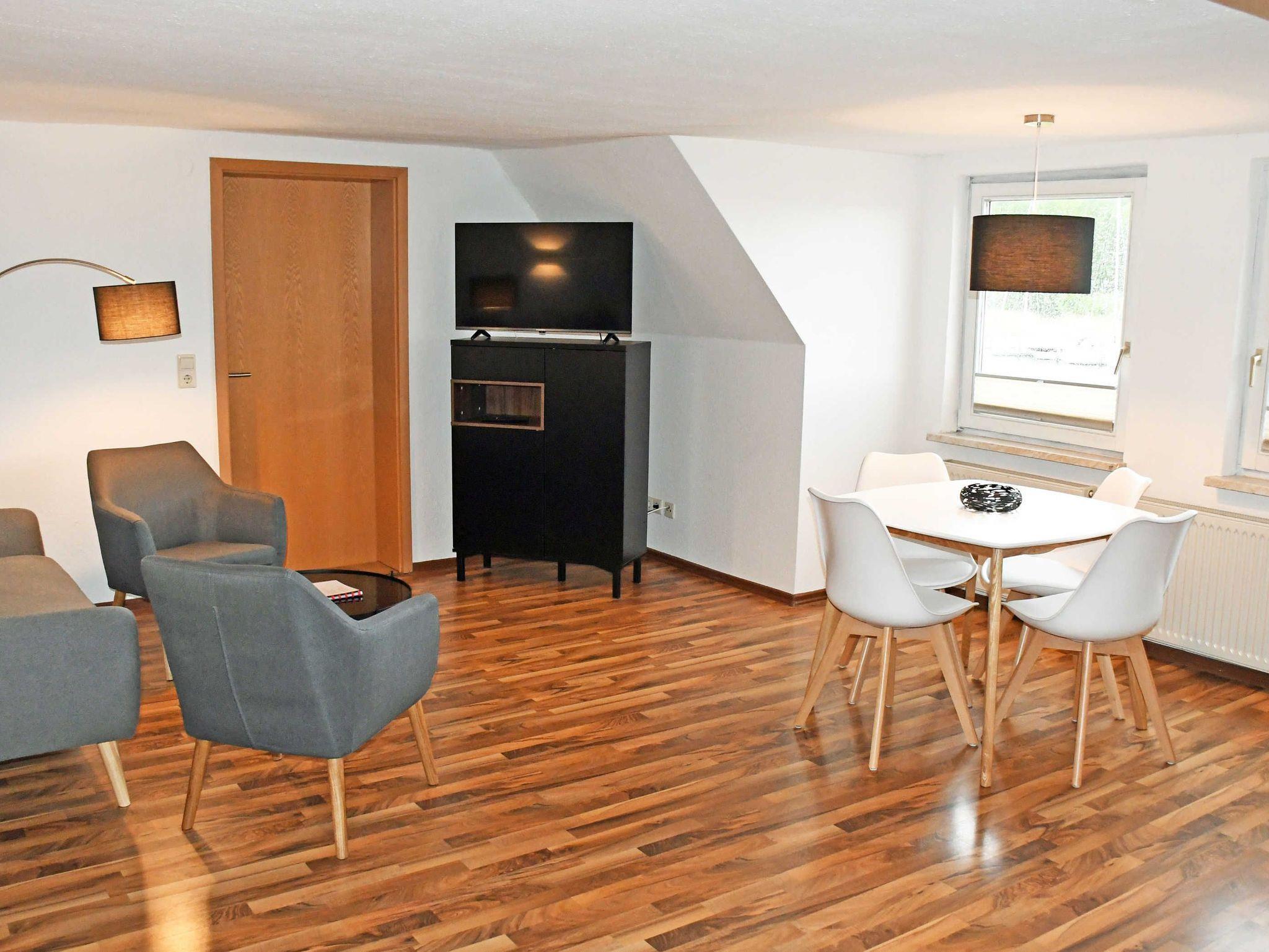 Über einen Flur kommen Sie in den Wohnraum. Hier stehen eine Couch, ein Tisch mit Sesseln und ein modernes Flachbild-TV-Gerät. Die Küchenzeile im Wohnbereich, ist mit Elektroherd mit Ceranfeld, Backofen, Kühlschrank mit Gefrierfach, Kaffeemaschine, Wasserkocher, Toaster komplett ausgestattet. Hier steht auch ein Esstisch mit Stühlen.