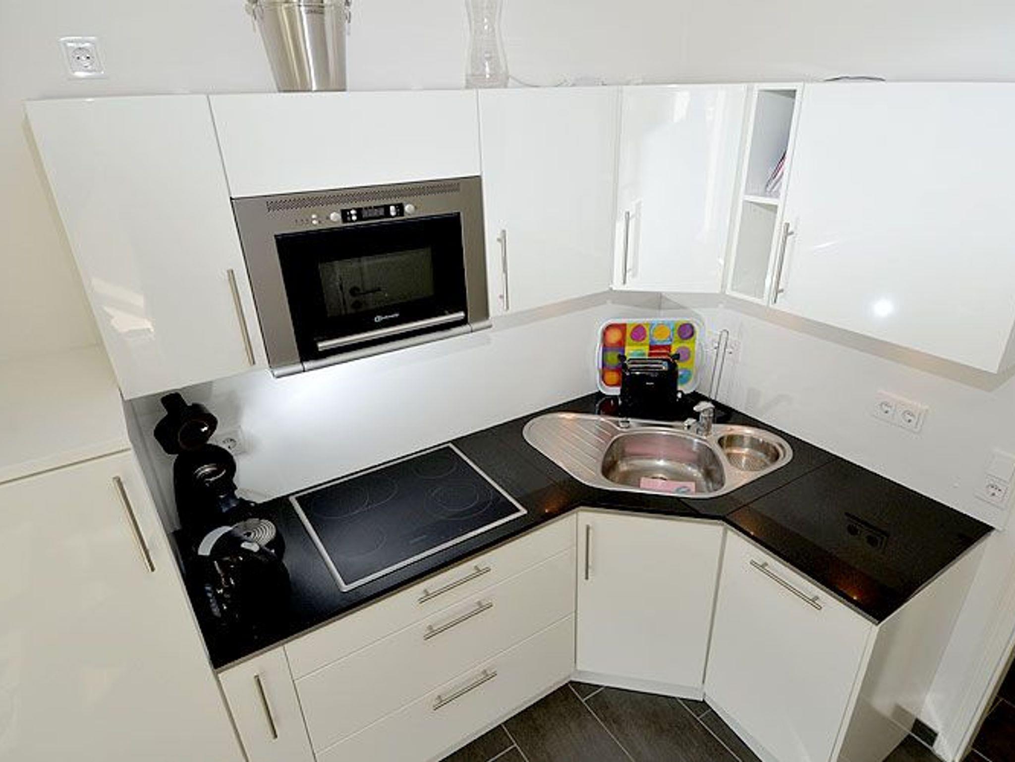 Das Wohnzimmer ist mit einem hochwertigen Ledersofa, Sitzgelegenheiten, Flachbildschirm-TV mit TV/Radio-Kabelanschluss, einem Bose Wave-Musiksystem mit Radio/CD Player, kostenfreiem W-LAN und einem Esstisch für 4 Personen ausgestattet. Die integrierte Küche mit alt-weiß-glänzenden Fronten und schwarzer Granitarbeitsplatte verfügt über 4-Zonen-Glas-Kochfeld, Mikrowelle mit Grillfunktion, Kühlschrank mit Gefrierfach, Geschirrspüler, Toaster und weitere Utensilien, so dass keine Wünsche offen bleiben.