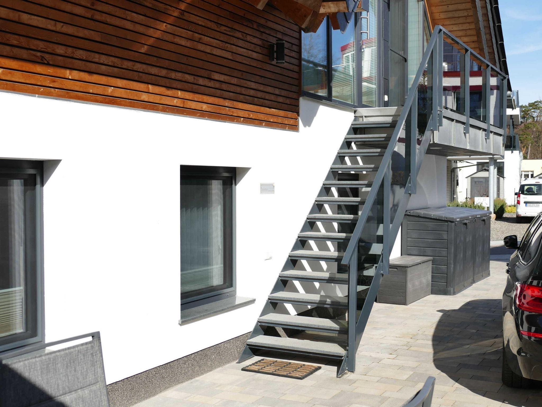 Die Ferienwohnung Möwenglück im Obergeschoss ist durch ihre drei Glasgiebel lichtdurchflutet und beeindruckt durch ihre großzügige, offene Bauweise. Sie ist über eine Außentreppe erreichbar. Die 3 Balkone sind nach Osten, Süden und Westen ausgerichtet.