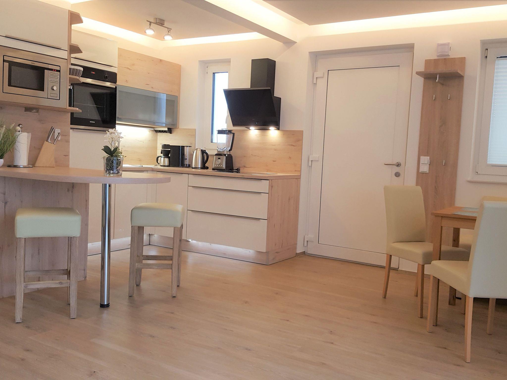 Fühlen Sie sich in dem rund 70 m² Wohn-, Dielen- und Küchenbereich wohl und nehmen Sie auf bequemen Sitzgelegenheiten Platz. Im angrenzenden Essbereich haben bis zu 8 Personen auf bequemen Schwingstühlen ausreichend Platz. Auch ein Hund ist in der großen Ferienwohnung auf dem mitgebrachten Schlafplatz erlaubt.