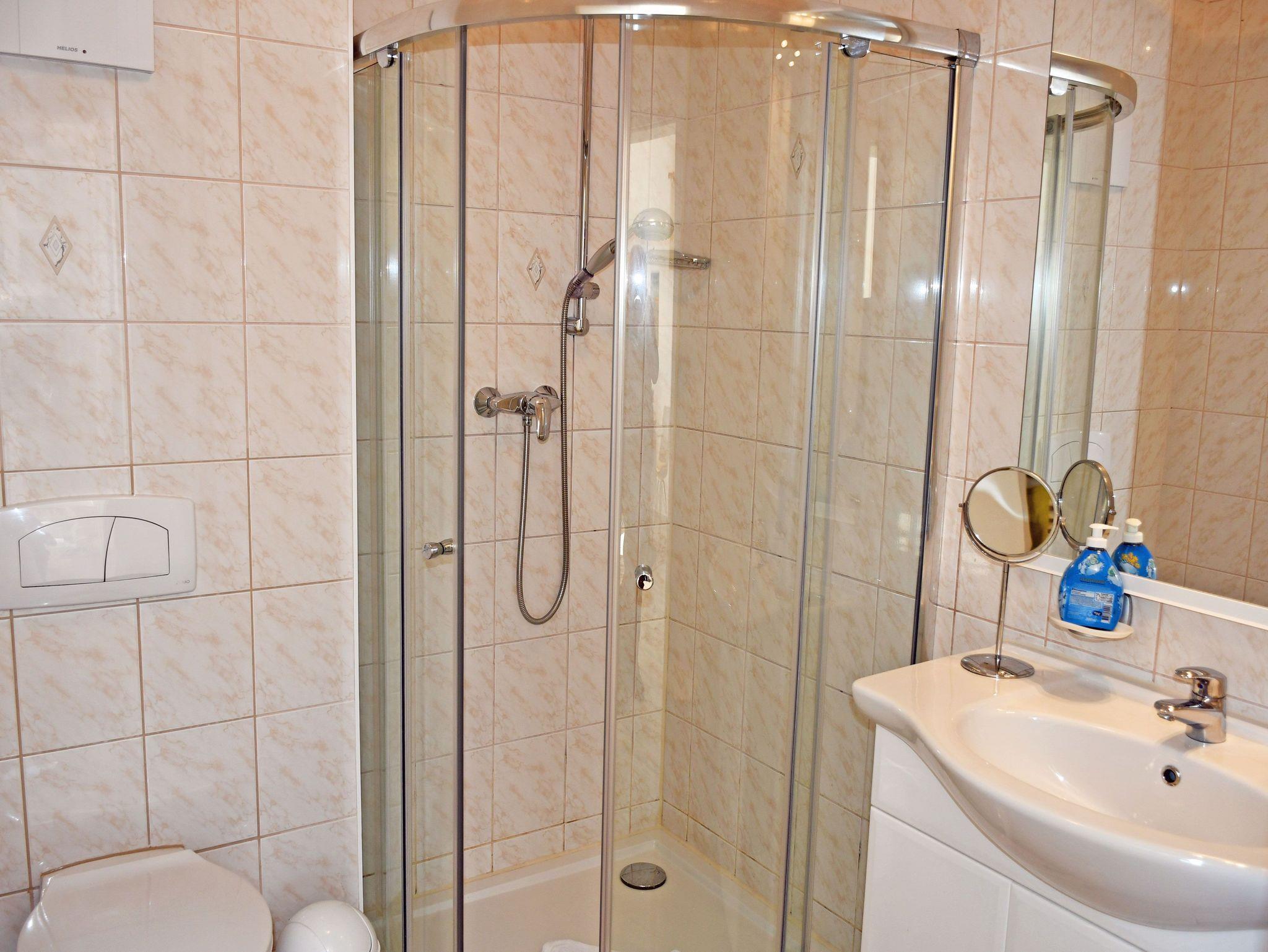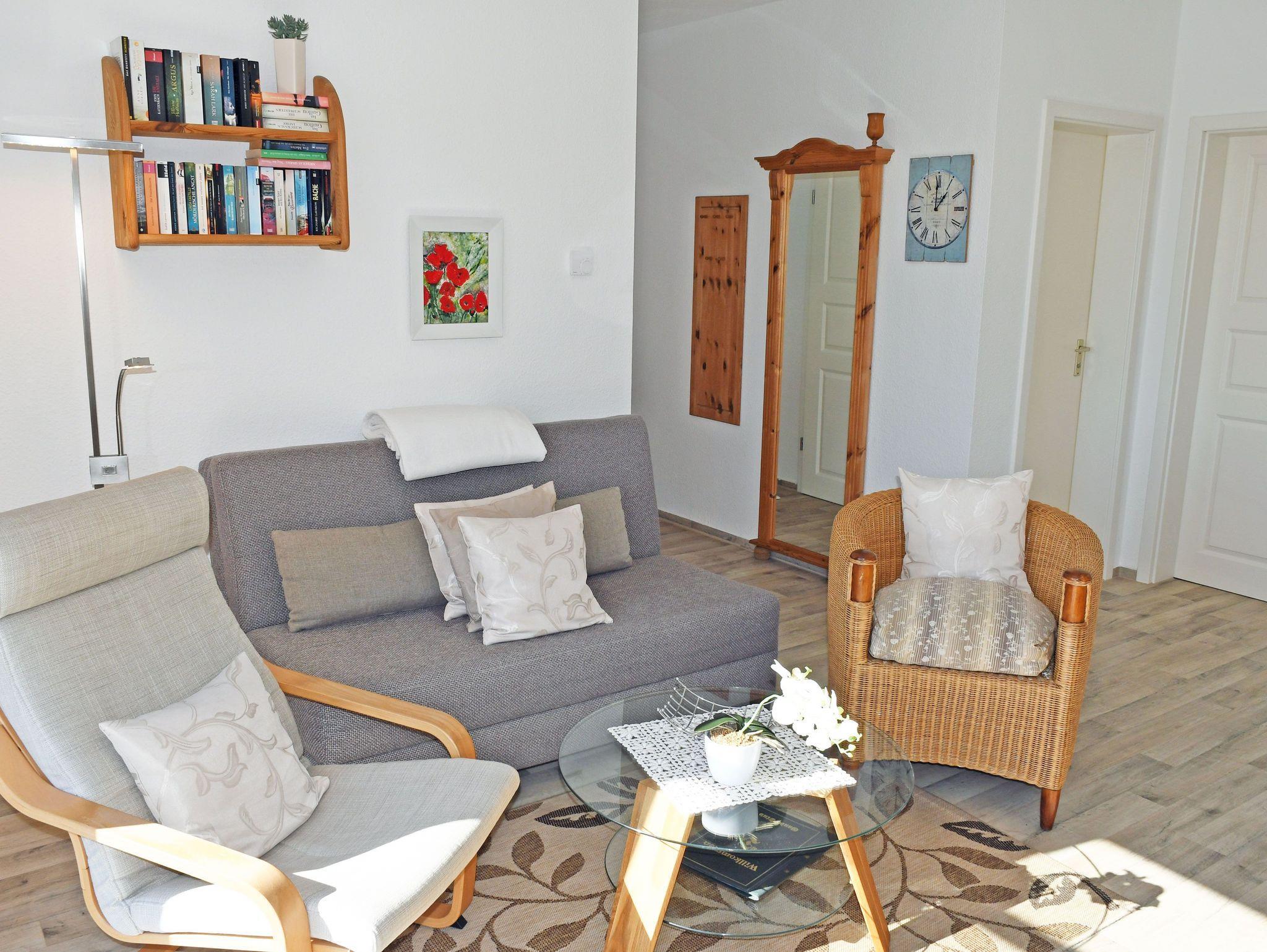 Das 2-Zimmerappartement betreten Sie über einen geräumigen Vorflur. Die durchgehende Fußbodenheizung garantiert an kalten Tagen ein angenehmes Wohngefühl. Die Wohnungen sind mit Komplettküchen ( Cerankochfeld, Kühlschrank, Mikrowelle, Kaffemaschine, Toaster, Wasserkocher etc.) ausgestattet. Der Essbereich geht in das Wohnzimmer über. An einen großen Spiegel mit Garderobe haben wir in unserer angedeuteten Diele für Sie gedacht. In den Wohnzimmern befinden sich jeweils eine bequeme Sitzecke mit Sessel, ein TV-Bereich (Sat-TV) sowie eine kleine Zimmerbibliothek mit Anrichte + Eckvitrine. Von hier haben Sie auch einen Zugang zur Balkonterrasse, die für Sie selbstverständlich Sitzgarnituren mit Polstern und einen Sonnenschirm bereithält. Das Schlafzimmer verfügt über ein Doppelbett, Schränken und Nachtschränkchen sowie einer kleinen zusätzlichen Garderobe. Die hochwertigen Matratzen garantieren Ihnen gepaart mit der ruhigen Lage des Hauses ein gut Durchschlafen. Im Wäschepaket enthalten sind, pro Person zwei Handtücher, ein Duschbadetuch sowie ein Geschirrtuch und eine Duschvorlage (Grundausstattung). Eine DU/WC erwarten Sie etwas geräumiger mit einem Handtuchtrockner und einem Fön. Abschließbare Fahrradunterstellmöglichkeiten stehen bereit. Außerdem können Sie gern Gebrauch von unserem Wäschetrockenplatz machen. Im Wohnbereich ist das Rauchen nicht erwünscht.
