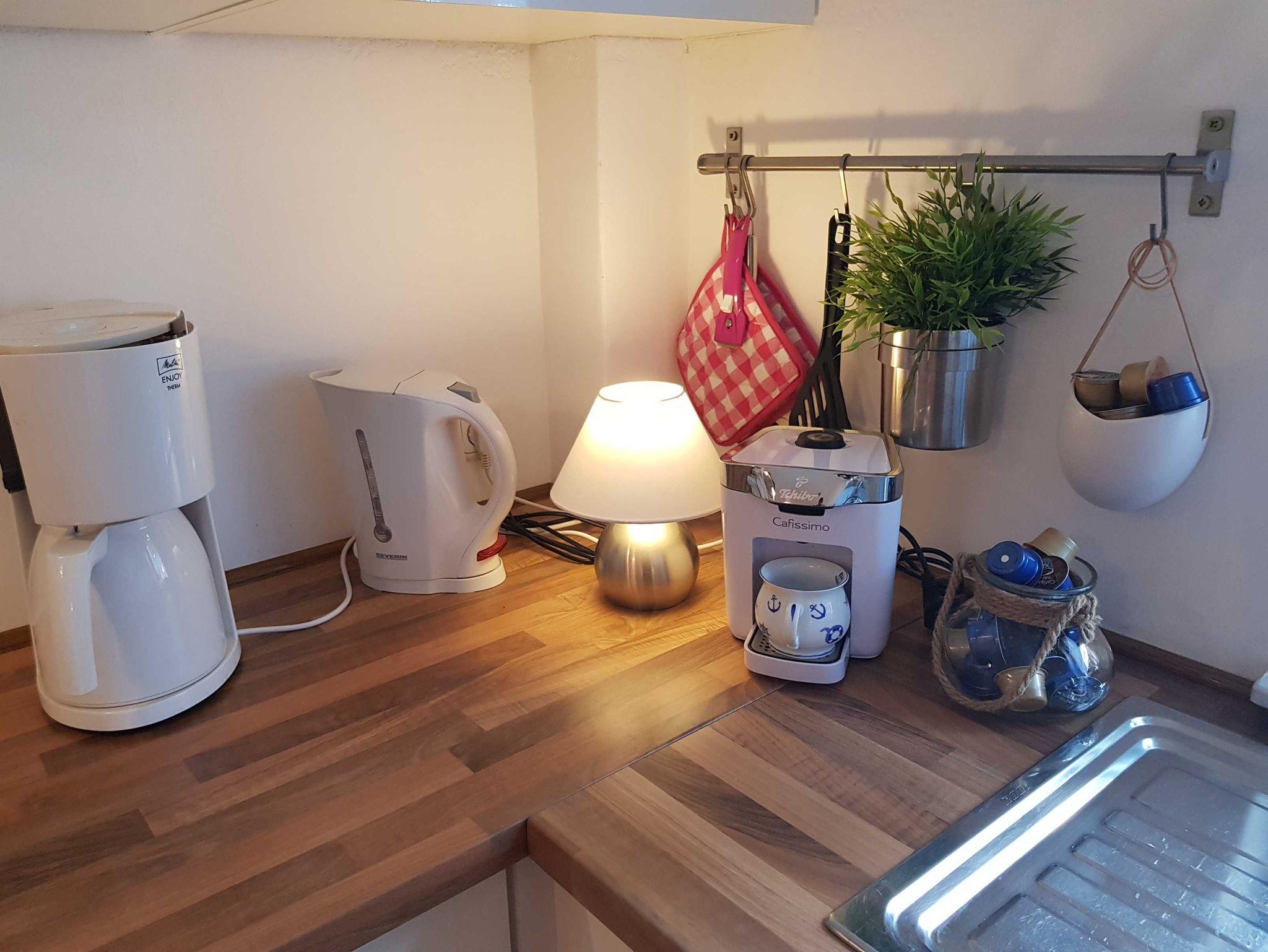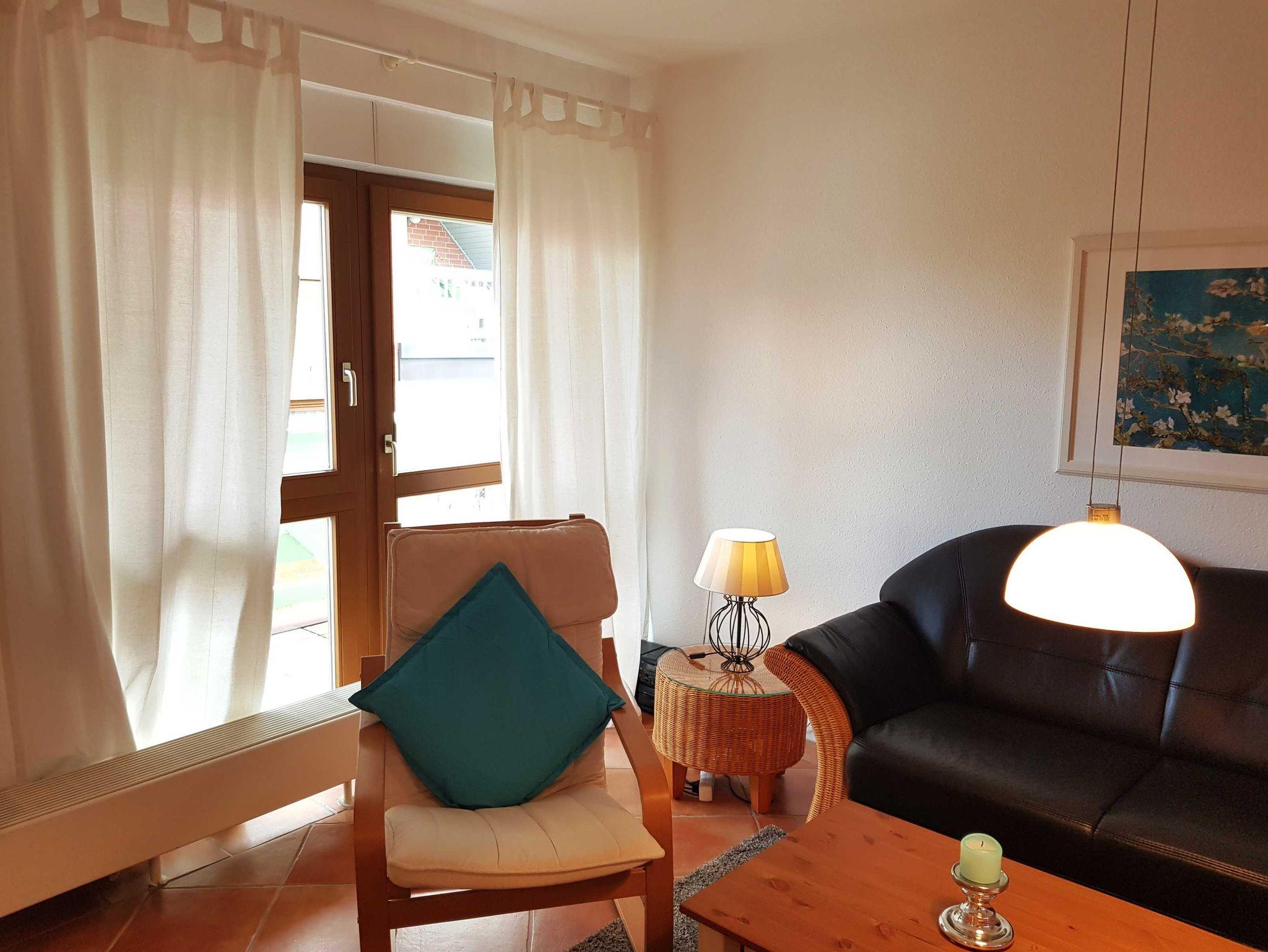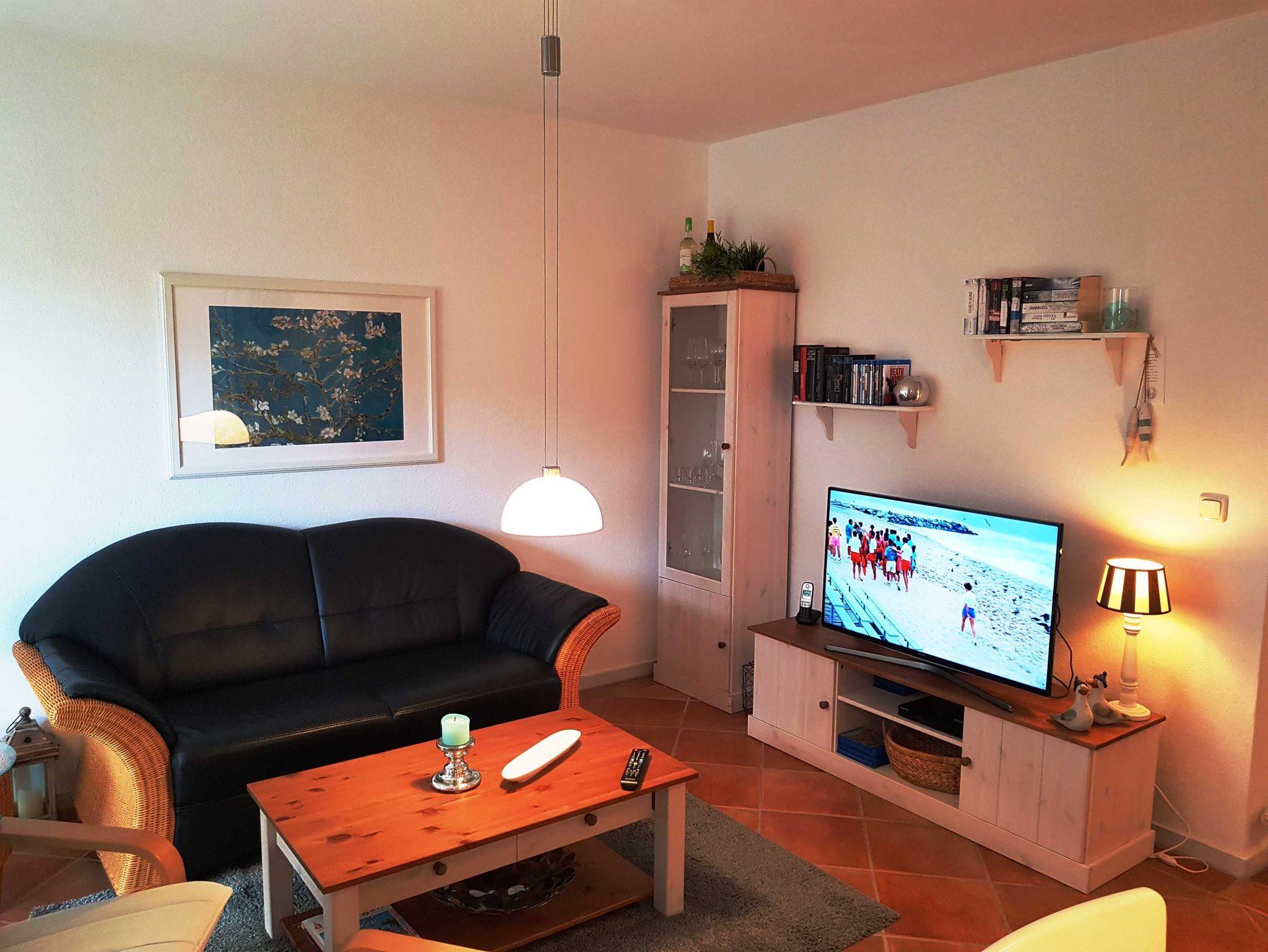 • Wohnzimmer mit Doppelcouch. Geräumige Eßecke, Küchenzeile mit Ceranherd, Mikrowelle, Kühhlschrank, Tiefkühlfach, Kaffeemaschine, Toaster, Wasserkocher, reichlich Geschirr und Gläser