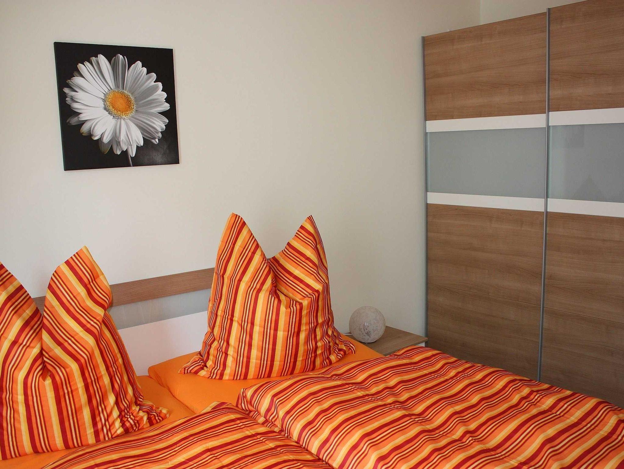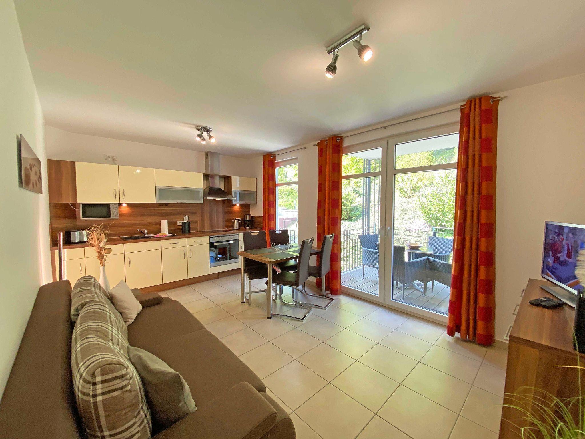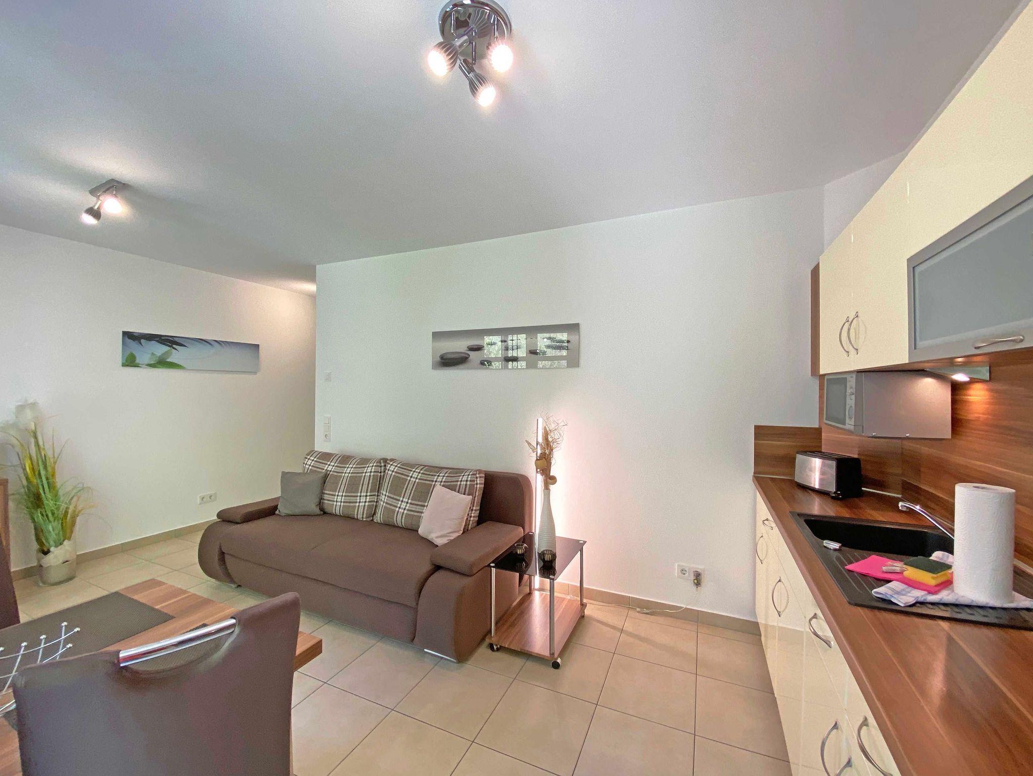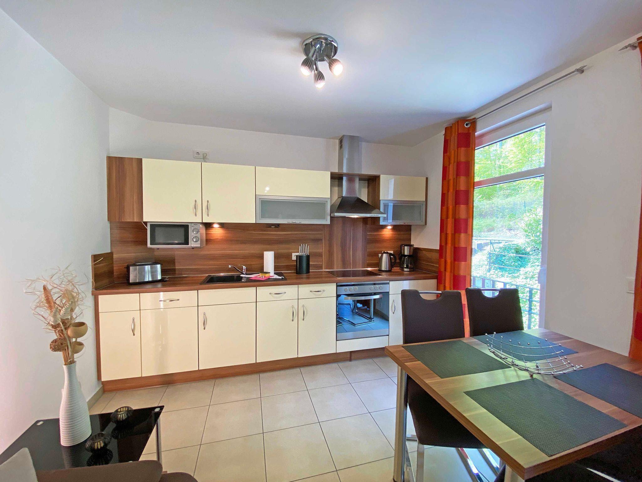 Die Nichtraucherwohnung Nr. 09 in der Villa Lena befindet sich im 1. Obergeschoss des Hauses und ist bequem mit dem Fahrstuhl zu erreichen. Die Wohnung hat eine Größe von ca. 45qm und bietet Ihnen Platz für max. 2 bis 4 Personen. Vom Eingangsbereich mit Garderobe erreichen Sie alle Räumlichkeiten. Der helle Wohnbereich verfügt über eine Schlafcouch (Aufbettungsmöglichkeit für 3./4. Person mit einer Maße von 1,55m x 2,00m), einer Stehlampe und einem Sideboard mit einem Smart-TV, Mini-Stereo-Anlage und WLAN-Anschluss. Die angrenzende Küchenzeile ist mit allem, was Sie zum Kochen benötigen, ausgestattet wie einem Backofen, einem Kühlschrank mit Gefrierfach, einem Geschirrspüler, einer Mikrowelle, einer Kaffeemaschine, einem Toaster, einem Wasserkocher und diversen Küchenutensilien. Ein Essplatz am Fenster rundet den Raum ab. Von hier gelangen Sie auf Ihren bestuhlten Balkon (Süd/West) wo Sie den Tag ganz in Ruhe mit Blickrichtung zum Friedensberg ausklingen lassen können. Das separate Schlafzimmer ist mit einem Doppelbett (1,80m x 2,00m), Nachtischablagen mit Beleuchtung, einem großen Kleiderschrank und einer Verdunklungsmöglichkeit sowie einem Insektenschutzgitter bestückt. Das geflieste Tageslicht-Bad verfügt über eine ebenerdige Dusche, ein WC, einem Waschtisch, einen Kosmetikspiegel sowie einem Handtuchheizkörper. Im kleinen Abstellraum befindet sich Reinigungsutensilien sowie ein Wäscheständer und ein Staubsauger. Für eine angenehme Wärme sorgt in allen Räumlichkeiten eine Fußbodenheizung. Ein Haustier ist gegen einen Aufpreis ein gern gesehener Gast. Im Untergeschoss des Hauses können Sie gegen eine Extragebühr eine Waschmaschine sowie einen Trockner nutzen. Ihre mitgebrachten oder geliehenen Fahrräder können Sie im separatem Fahrradunterstand auf dem hinteren Grundstück, welche Sie durch einen kleinen Fußweg erreichen, abstellen. Ihr PKW- Stellplatz Nr.09 (Einfahrtshöhe 2,00m) befindet sich in der Tiefgarage. Es handelt sich um einen Doppelparker, für eine max. Auto Maße von 5,00m Länge, 1,80m Höhe und einem Gewicht bis 2 Tonnen geeignet ist. Die Erstausstattung eines Wäschepaketes (komplette Bettwäsche, 1 Duschhandtuch, 1 kleines Handtuch) können Sie bis 14 Tage vor Anreise gegen einen Aufpreis dazu buchen oder durch eigenes Ergänzen. Ab 2 gebuchten Paketen erhalten Sie einmalig 1 Geschirrhandtuch und 1 Duschvorleger hinzu.