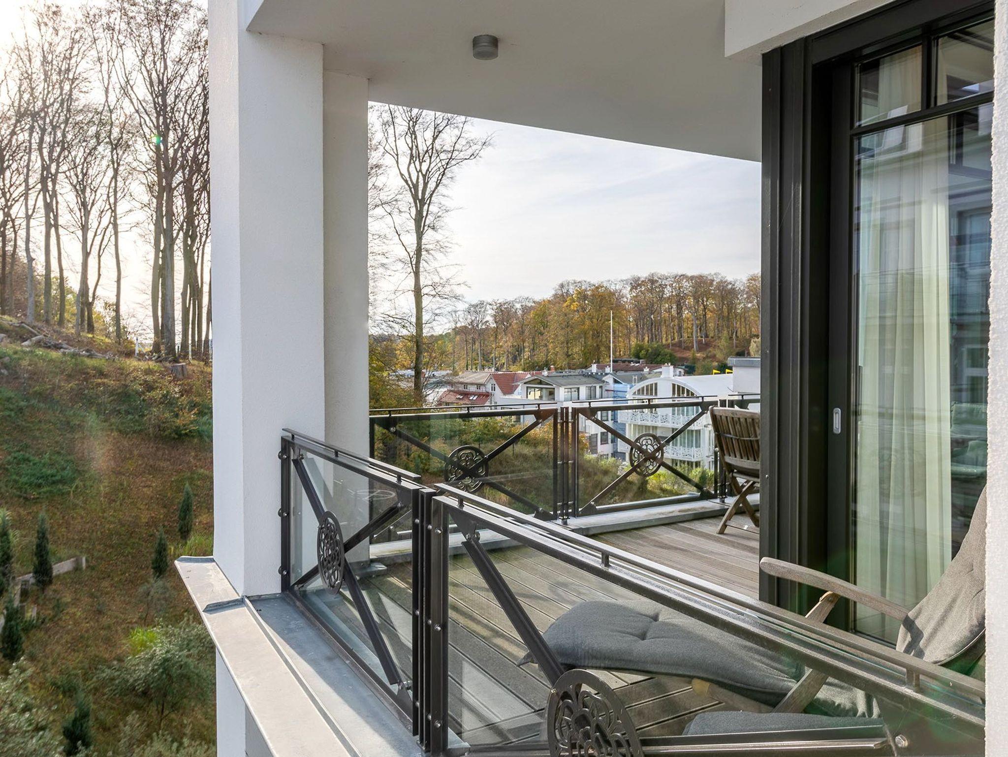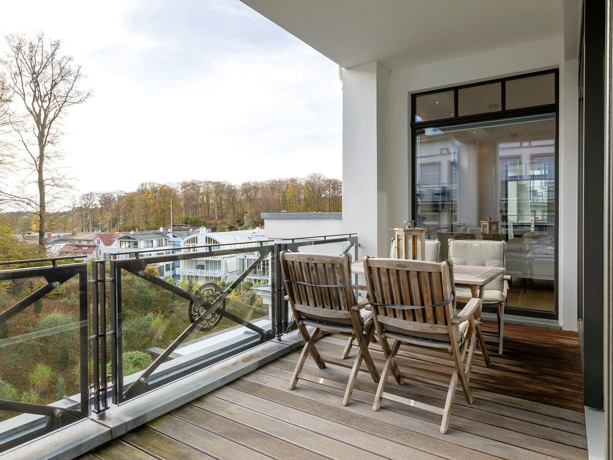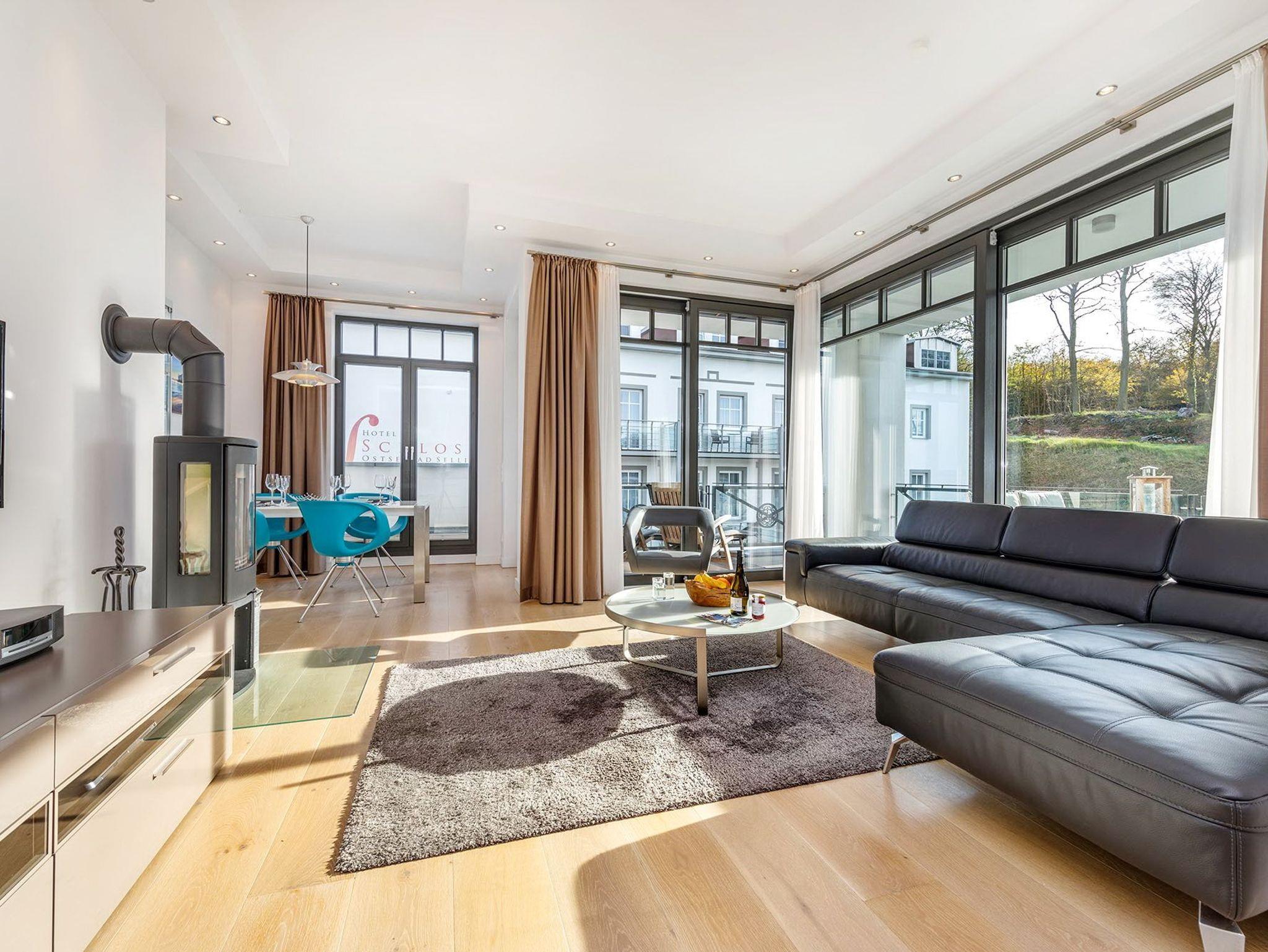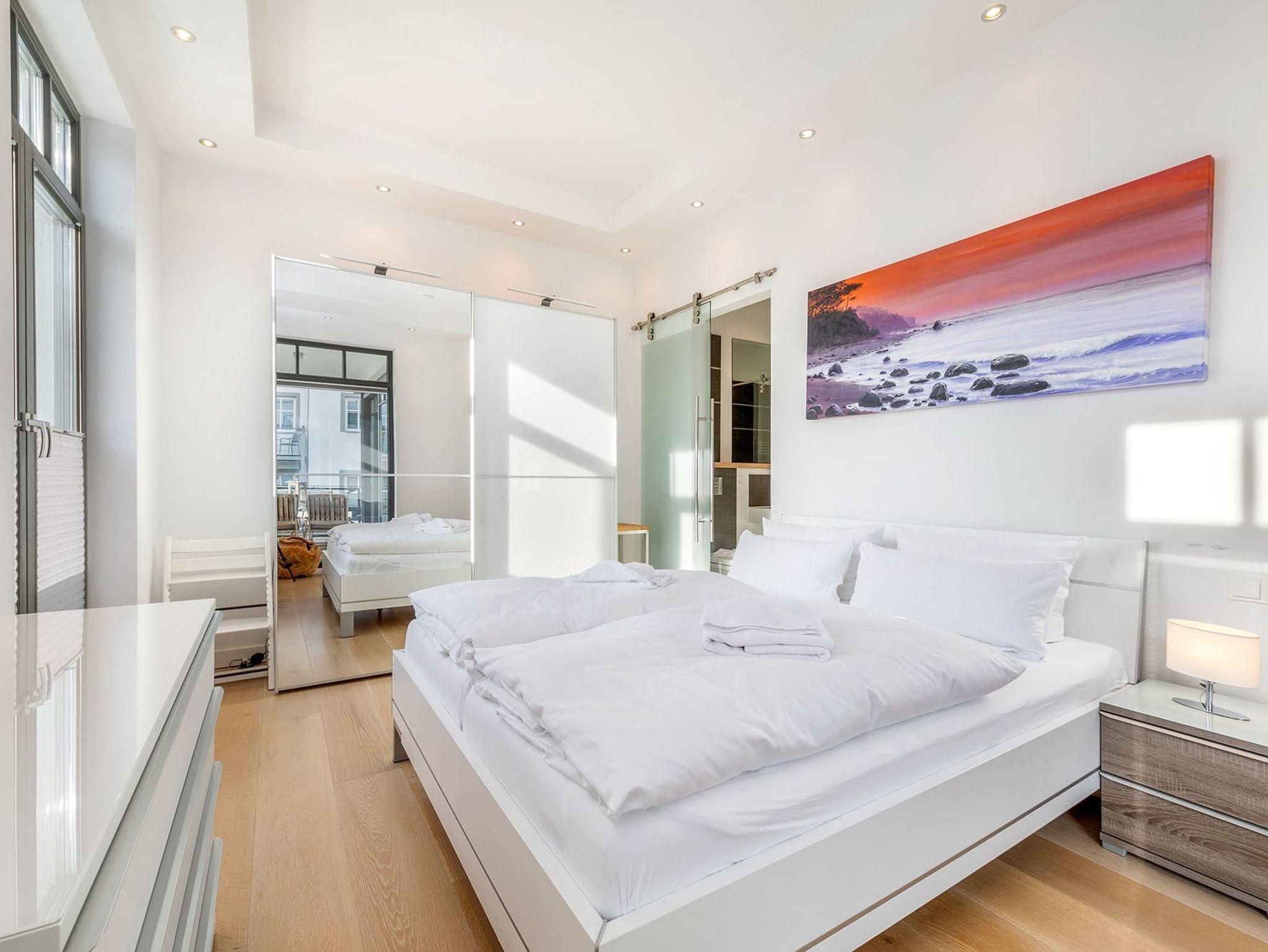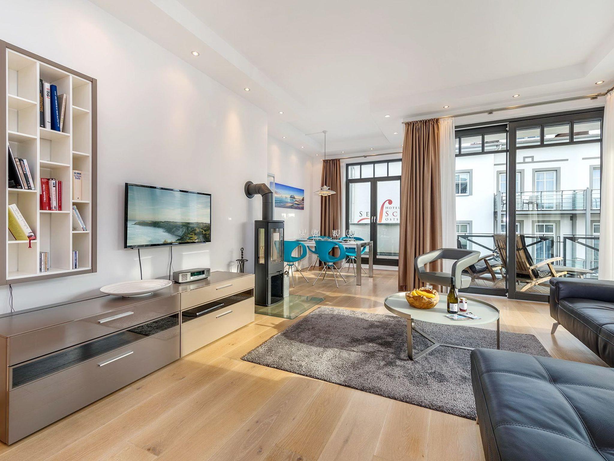 Herrlich lichtdurchflutet dank der bodentiefen Fenster lädt der kombinierte Wohn- und Essbereich zum Entspannen und Genießen ein. Das sorgfältig ausgewählte und äußerst hochwertige Mobiliar besticht durch funktionale Eleganz. Ein Kamin sorgt für zünftige Romantik, die flächendeckende Fußbodenheizung für ein angenehmes Raumklima zu jeder Jahreszeit. Schnell ist auch der großzügige Süd-Balkon entdeckt. Lassen Sie sich die frische Ostseebrise um die Nase wehen und genießen Sie den seitlichen Blick aufs Meer sowie auf den Pool auf der windgeschützten Landseite. Zwei große Schlafzimmer mit bequemen Doppelbetten und eleganten Ensuite-Bädern stehen Ihnen zur Verfügung. Die geräumigen Duschen sind ebenerdig.