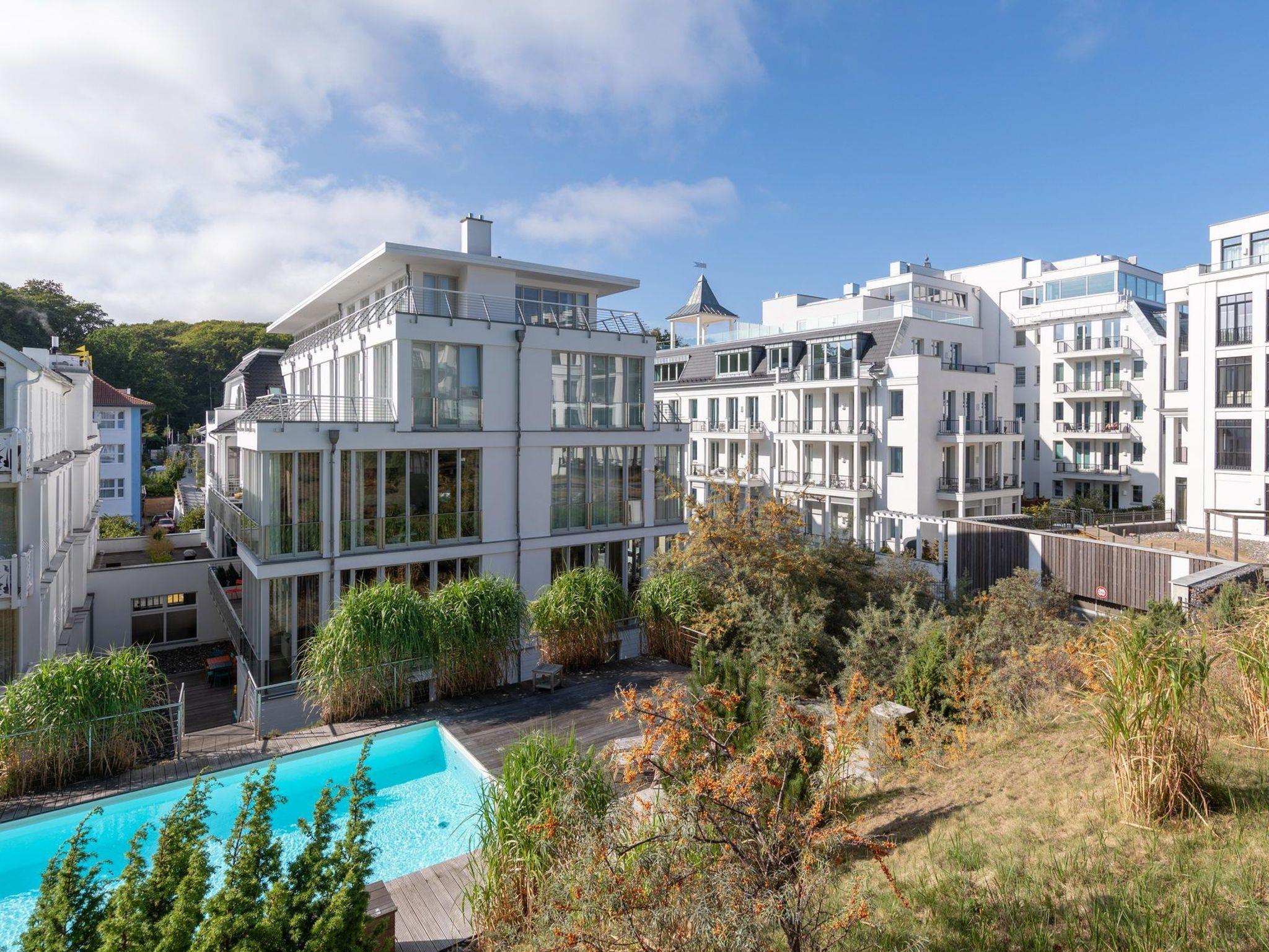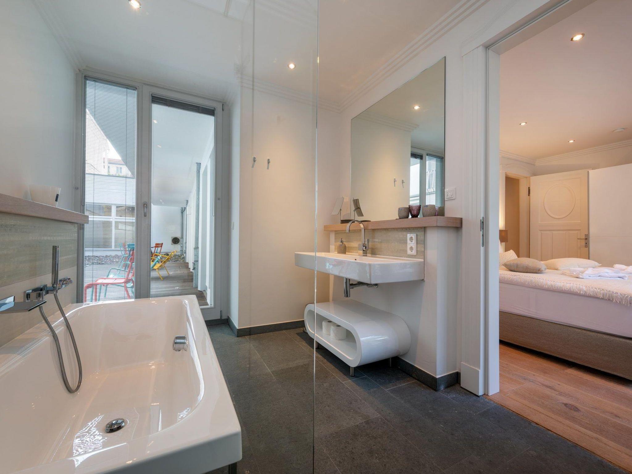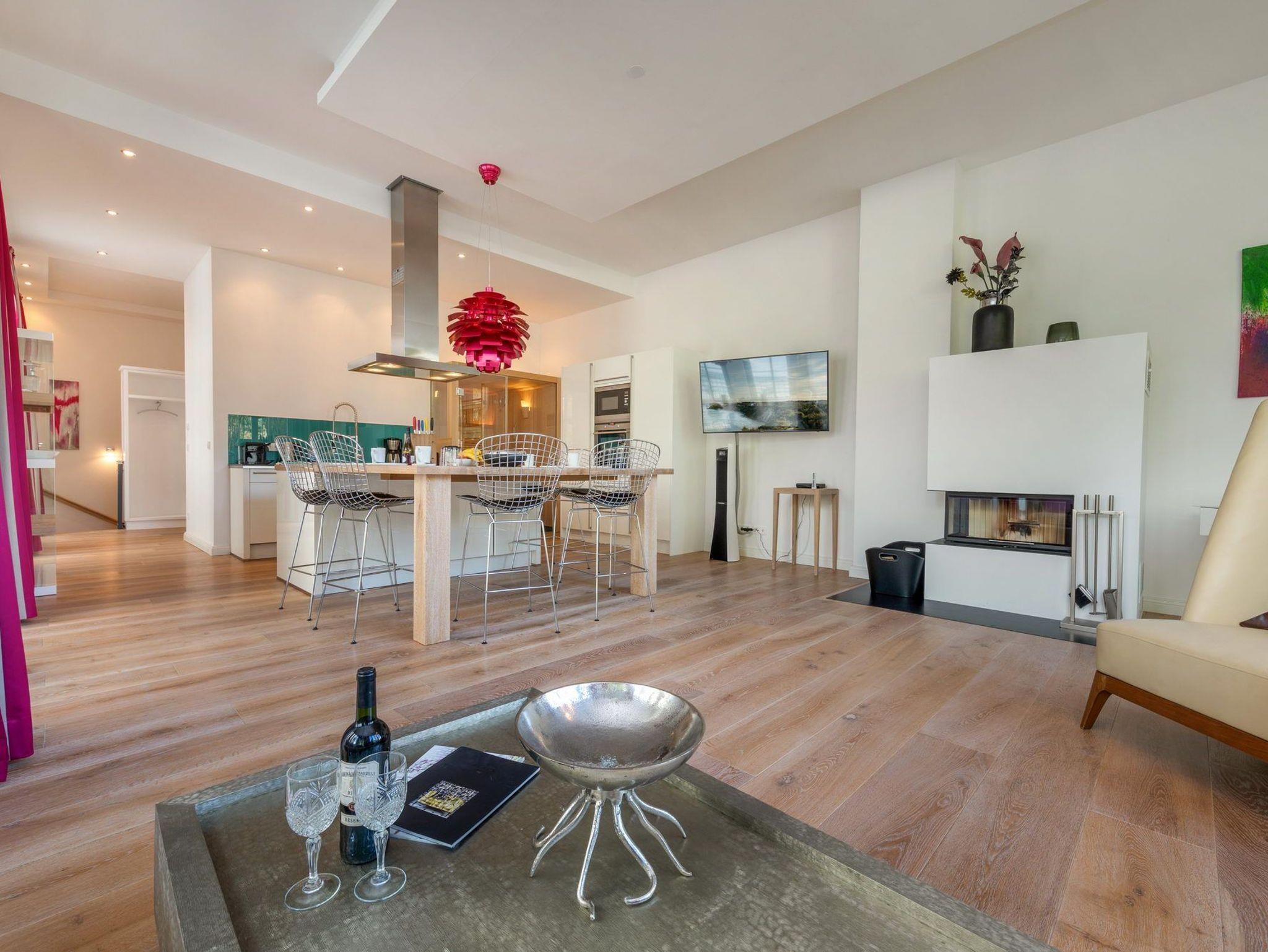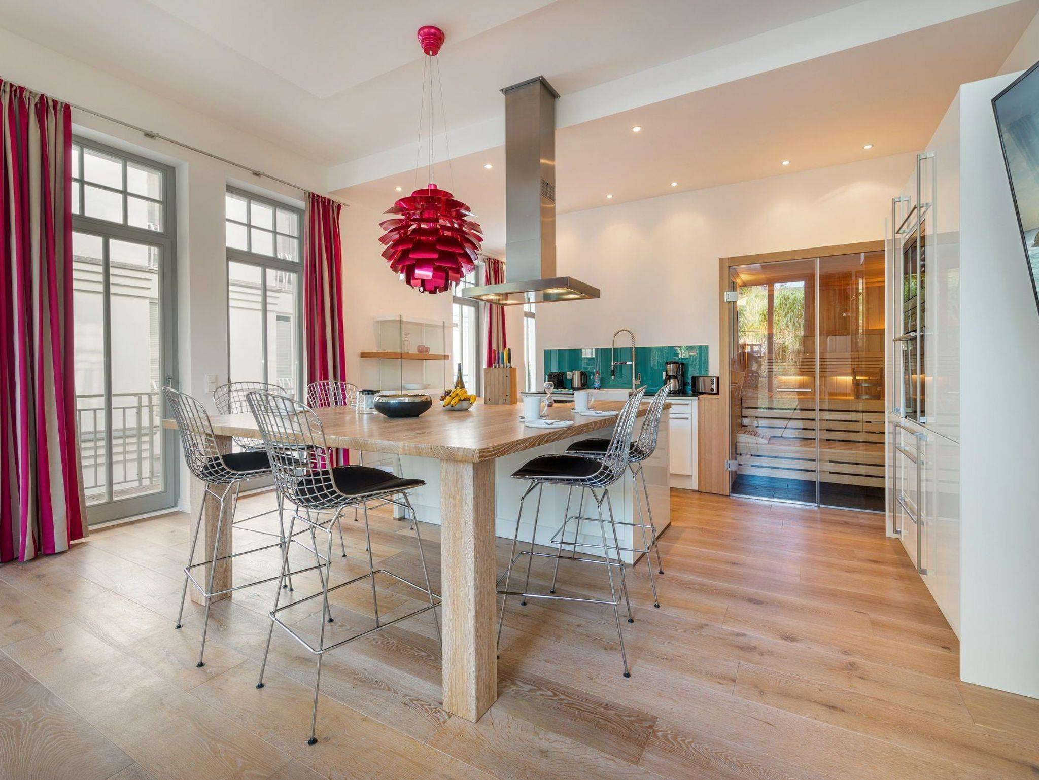 Sie betreten Ihr Urlaubsdomizil im zweiten Obergeschoss, bequem zu erreichen mit dem hauseigenen Lift. Lassen Sie sich von der angenehmen Helligkeit, der exklusiven Dielung aus gekälkter Eiche und dem stylischen Interieur begeistern. Durch die raumhohen Fenster und von der Terrasse aus können Sie zwar nicht das Meer sehen, dafür eröffnet sich Ihnen aber ein schöner Blick auf das Grün des Buchenhains hinter dem Haus mit dem Zugang zum hauseigenen Außenpool, der in der Sommersaison zum erfrischenden Bad einlädt. Gerade das großzügige Wohnzimmer mit der integrierten Luxusküche, dem repräsentativen Kamin, den bequemen Couchmöbeln und dem großformatigen Flatscreen-TV ist ein Highlight. Ungewöhnlich und dabei höchst interessant auch die Lösung der Innenarchitekten, von der wohnungseigenen Sauna einen Blick ins Wohnzimmer zu ermöglichen.