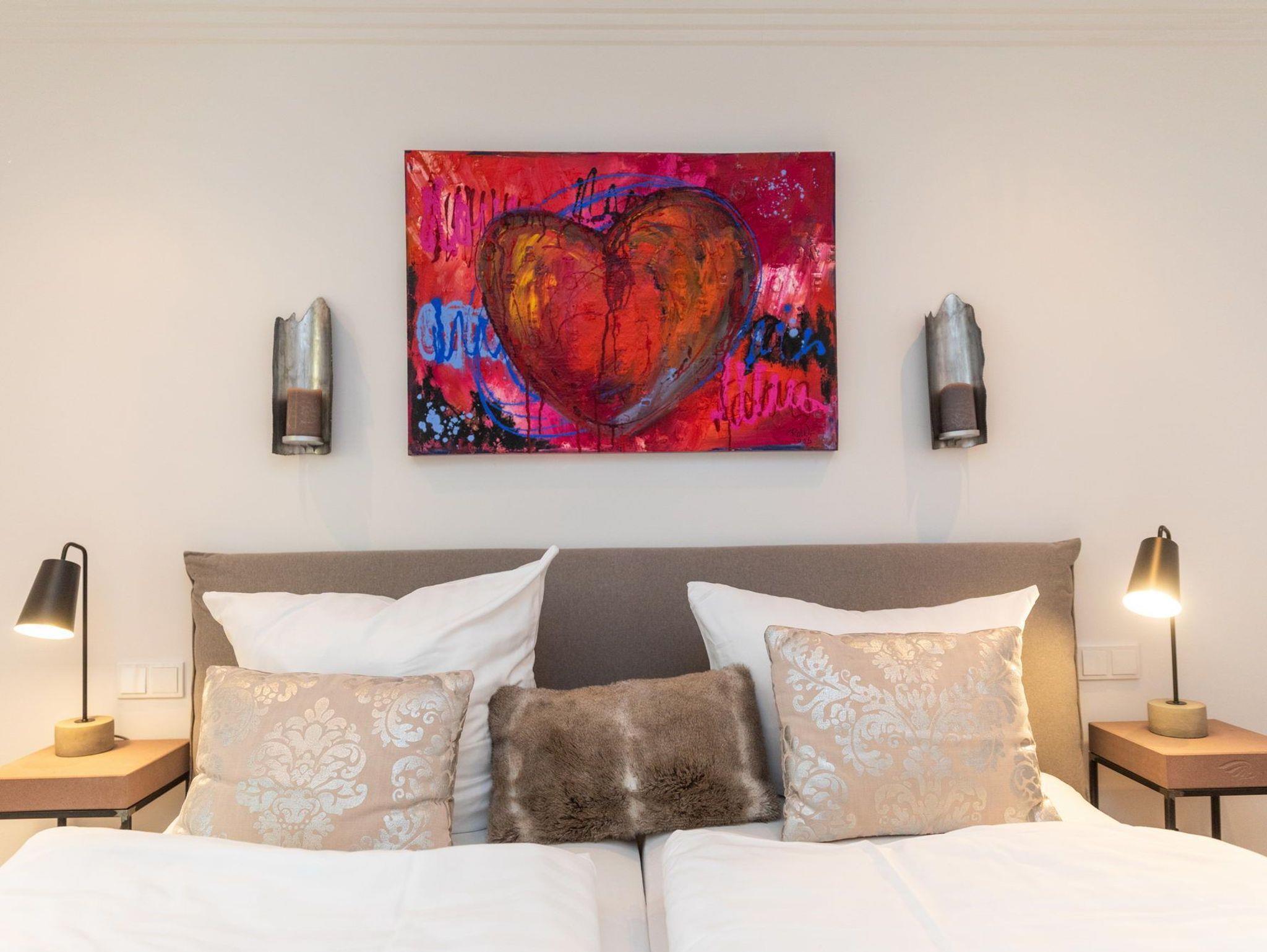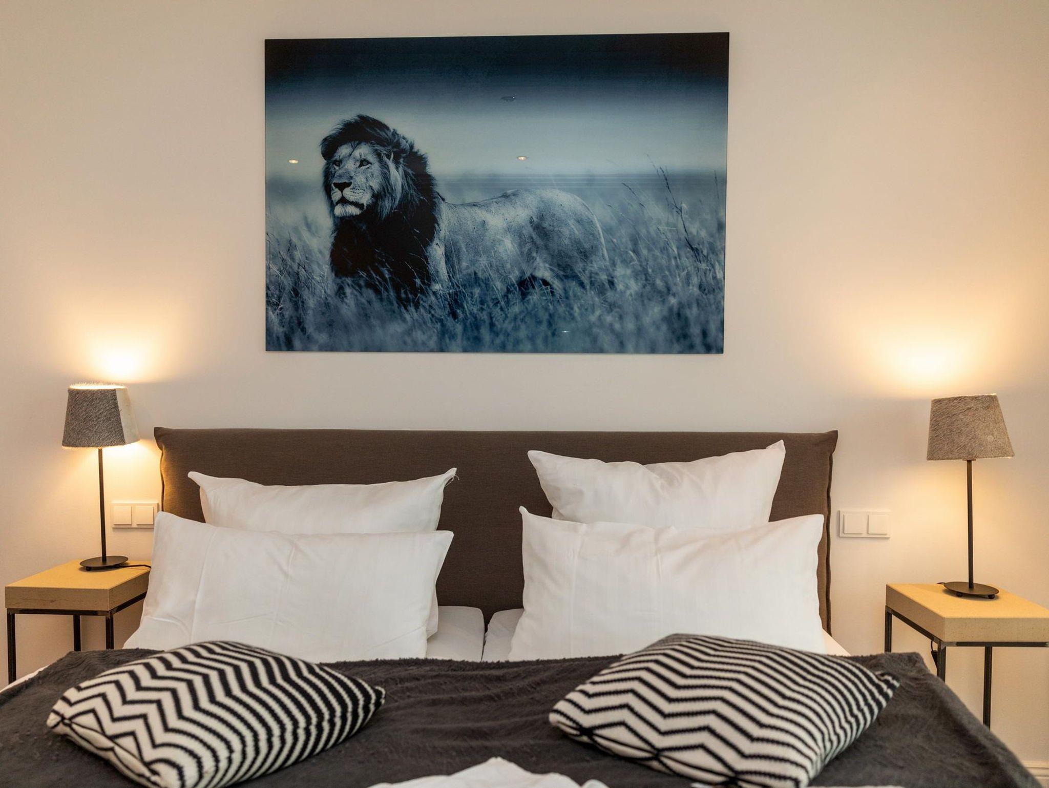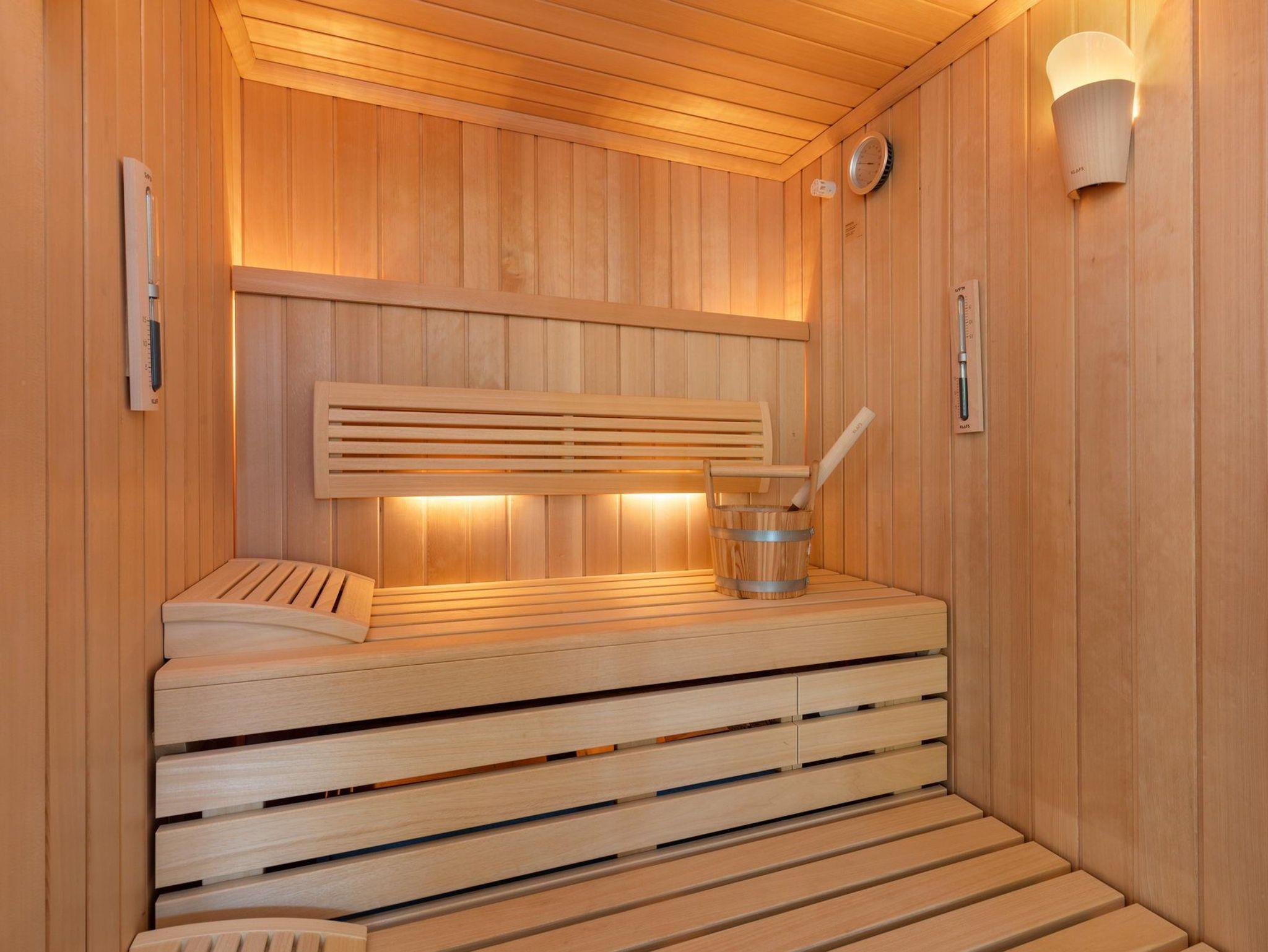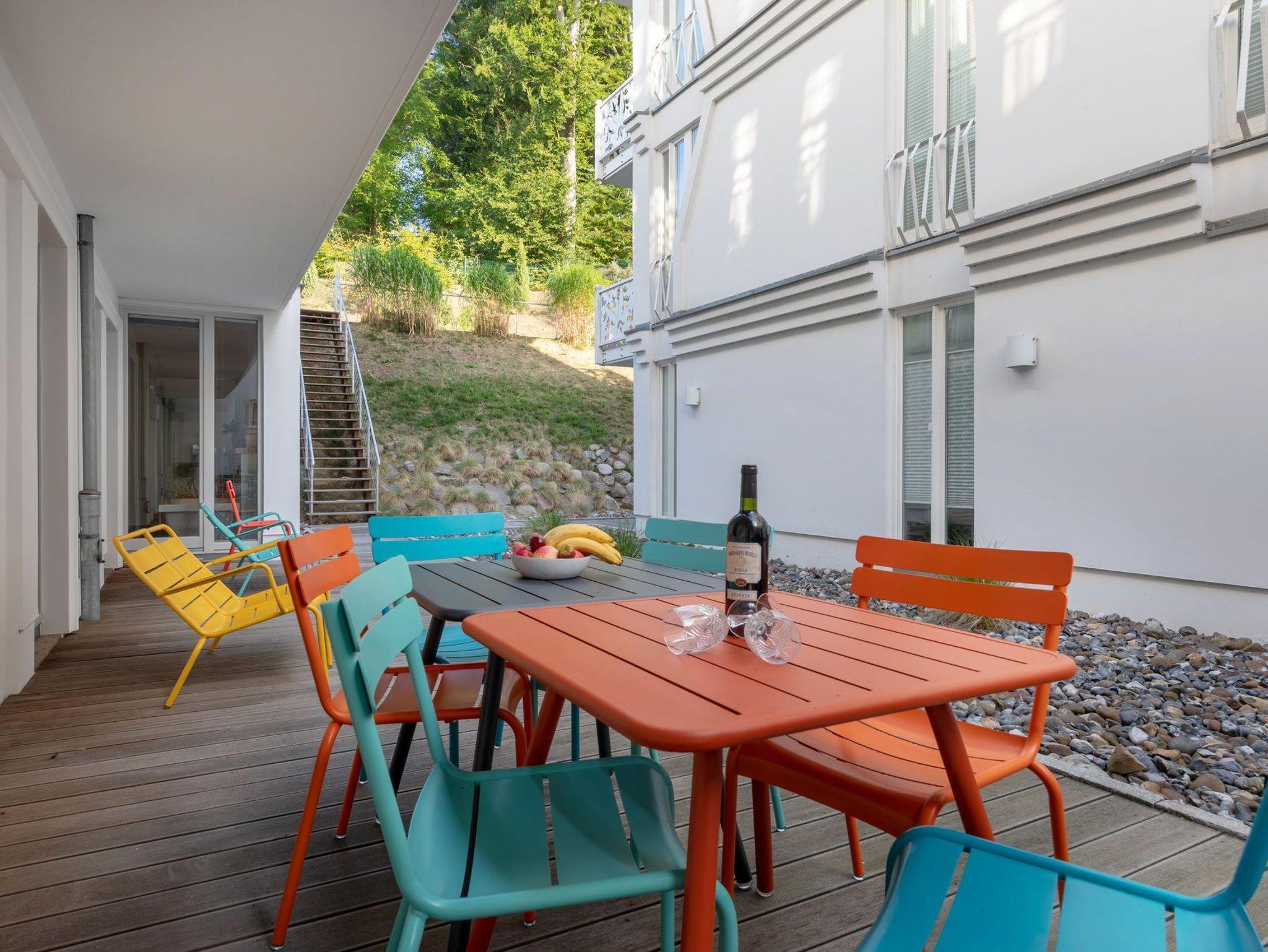 Sie betreten Ihr Urlaubsdomizil im zweiten Obergeschoss, bequem zu erreichen mit dem hauseigenen Lift. Lassen Sie sich von der angenehmen Helligkeit, der exklusiven Dielung aus gekälkter Eiche und dem stylischen Interieur begeistern. Durch die raumhohen Fenster und von der Terrasse aus können Sie zwar nicht das Meer sehen, dafür eröffnet sich Ihnen aber ein schöner Blick auf das Grün des Buchenhains hinter dem Haus mit dem Zugang zum hauseigenen Außenpool, der in der Sommersaison zum erfrischenden Bad einlädt. Gerade das großzügige Wohnzimmer mit der integrierten Luxusküche, dem repräsentativen Kamin, den bequemen Couchmöbeln und dem großformatigen Flatscreen-TV ist ein Highlight. Ungewöhnlich und dabei höchst interessant auch die Lösung der Innenarchitekten, von der wohnungseigenen Sauna einen Blick ins Wohnzimmer zu ermöglichen.
