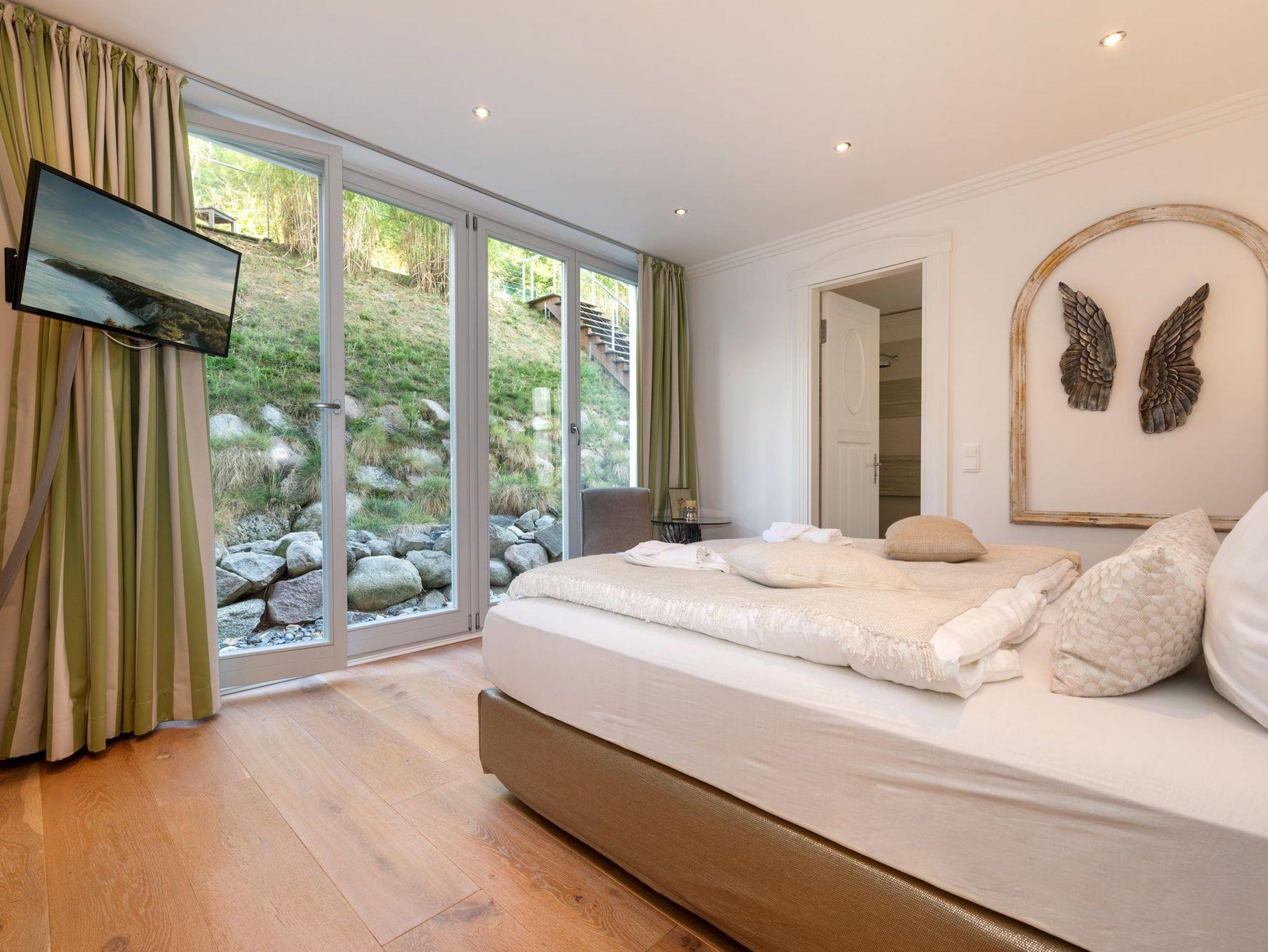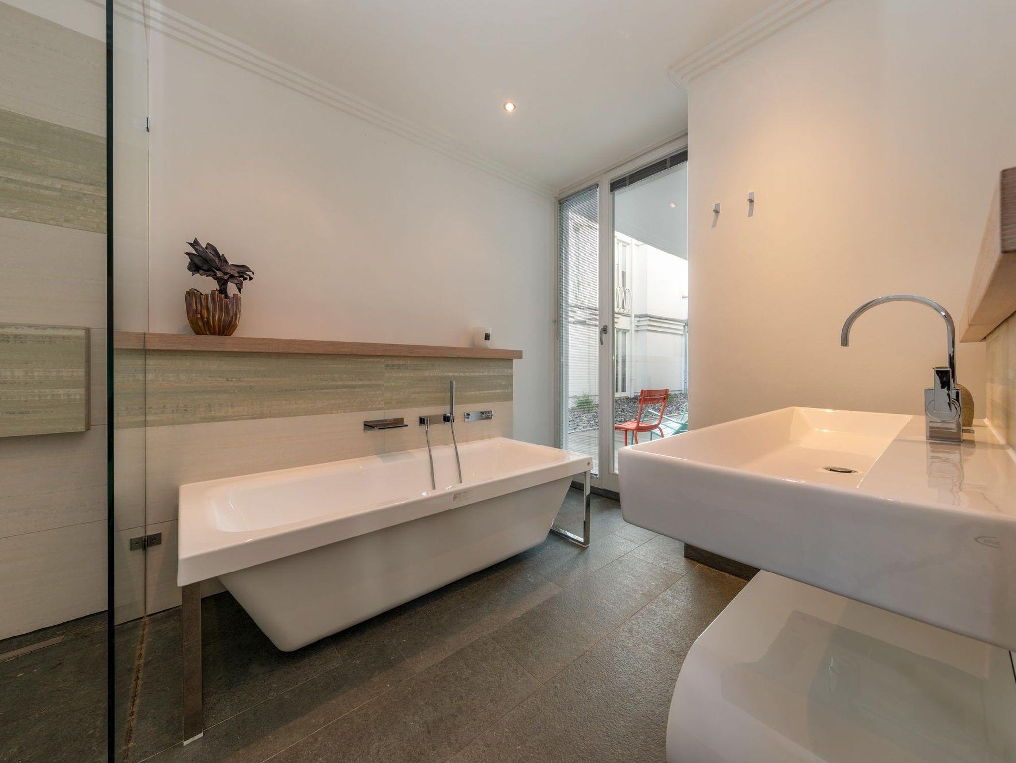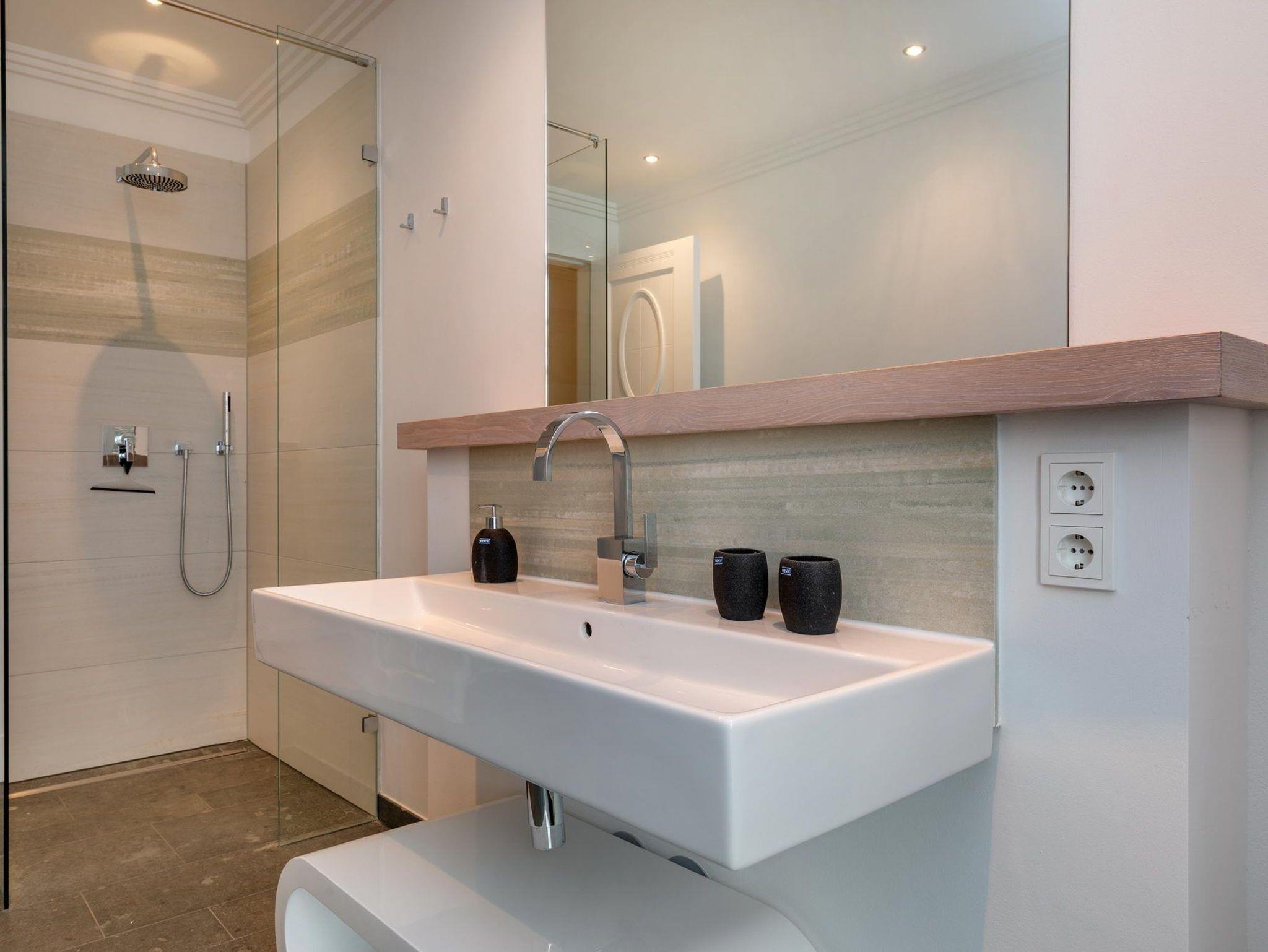 Eine Treppe tiefer strahlen gleich drei Schlafzimmer mit luxuriösen Boxspring-Doppelbetten, Kleiderschrank und Flat-TV elegante Behaglichkeit aus. Die bodentiefen Fenster können aber selbstverständlich verdunkelt werden, damit Sie stets erholsamen Schlaf finden. Genießen Sie Luxus pur in den Bädern mit Villeroy [&] Boch- Waschbecken mit Dornbracht Armaturen, WC und großzügiger, ebenerdiger Dusche bzw. Badewanne. Ein separates Gäste-WC im Eingangsbereich ist ebenfalls vorhanden.