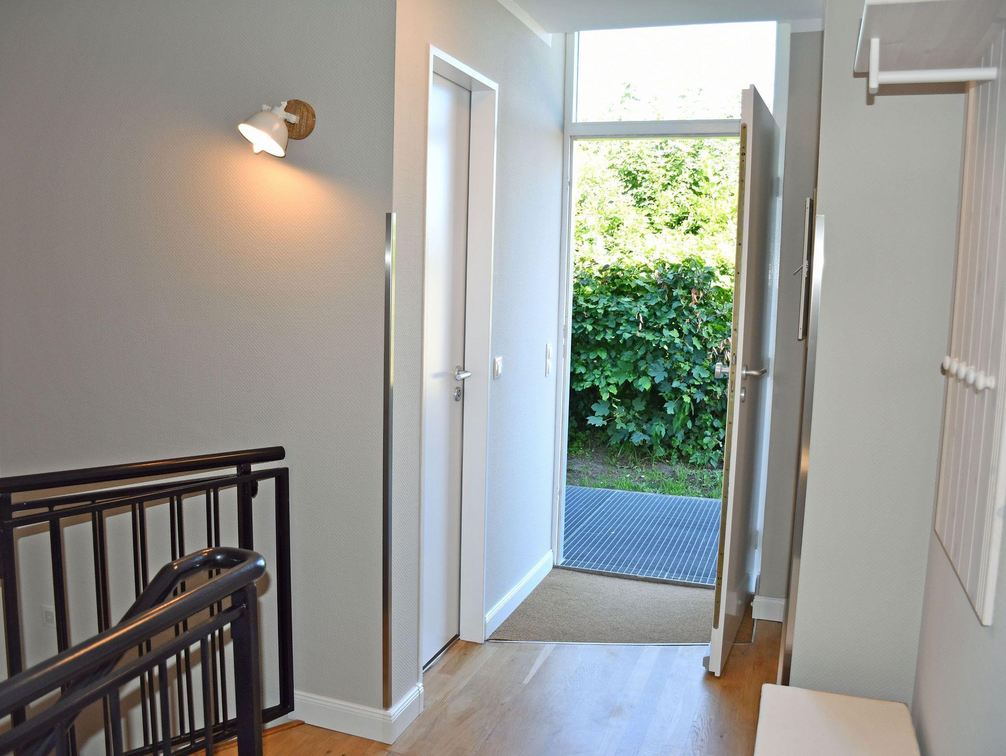 Jede der Wohnungen wird ebenerdig über die Eingangstür betreten. Hier erstreckt sich gleich rechtsseitig ein kleines Duschbad, sowie dem Flur folgend ein großzügiger langgezogener Schlafraum. Ein bequemes Boxspringbett (1,80m) mit Nachttischen und Leselampen sorgt hier für hohen Komfort und erholsamen Schlaf der Gäste und bildet den zentralen Punkt des Raumes. Ein 3- türiger Kleiderschrank und eine Kommode bieten ausreichend Stauraum für Kleider, das Schlafsofa im gradlinigen nordischen Stil bietet die Möglichkeit einer zusätzlichen Aufbettung für einen Gast in dem großen Schlafraum. Der große Bettkasten bietet Stauraum für die zur Aufbettung zusätzlich benötigten Bettdecken. Die Fenster können bei Bedarf zum Schlafen verdunkelt werden.