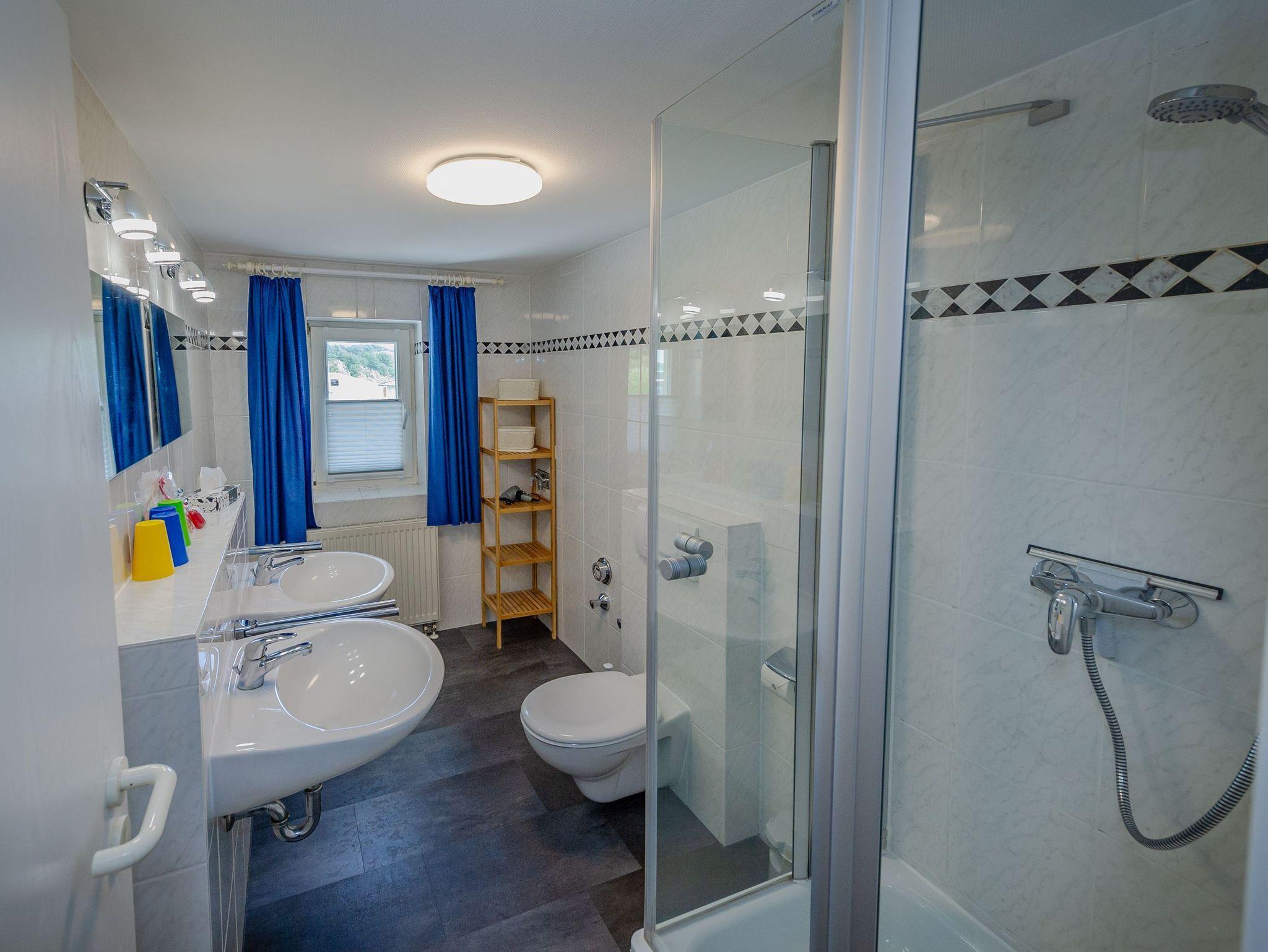 Auch das Tageslichtbad Ihrer Wohnung, ausgestattet mit Dusche/WC, zwei Waschbecken und Haartrockner, weiß zu überzeugen.
