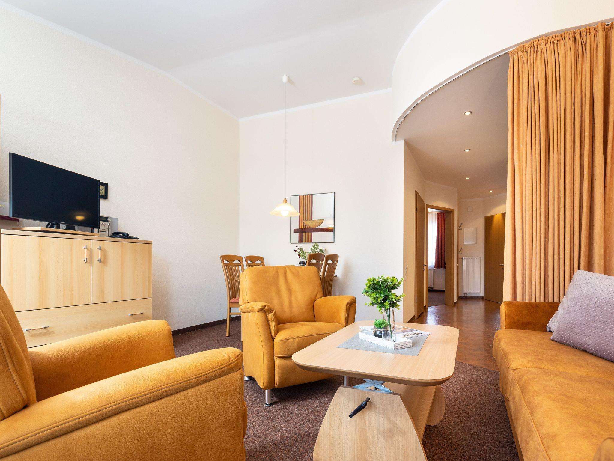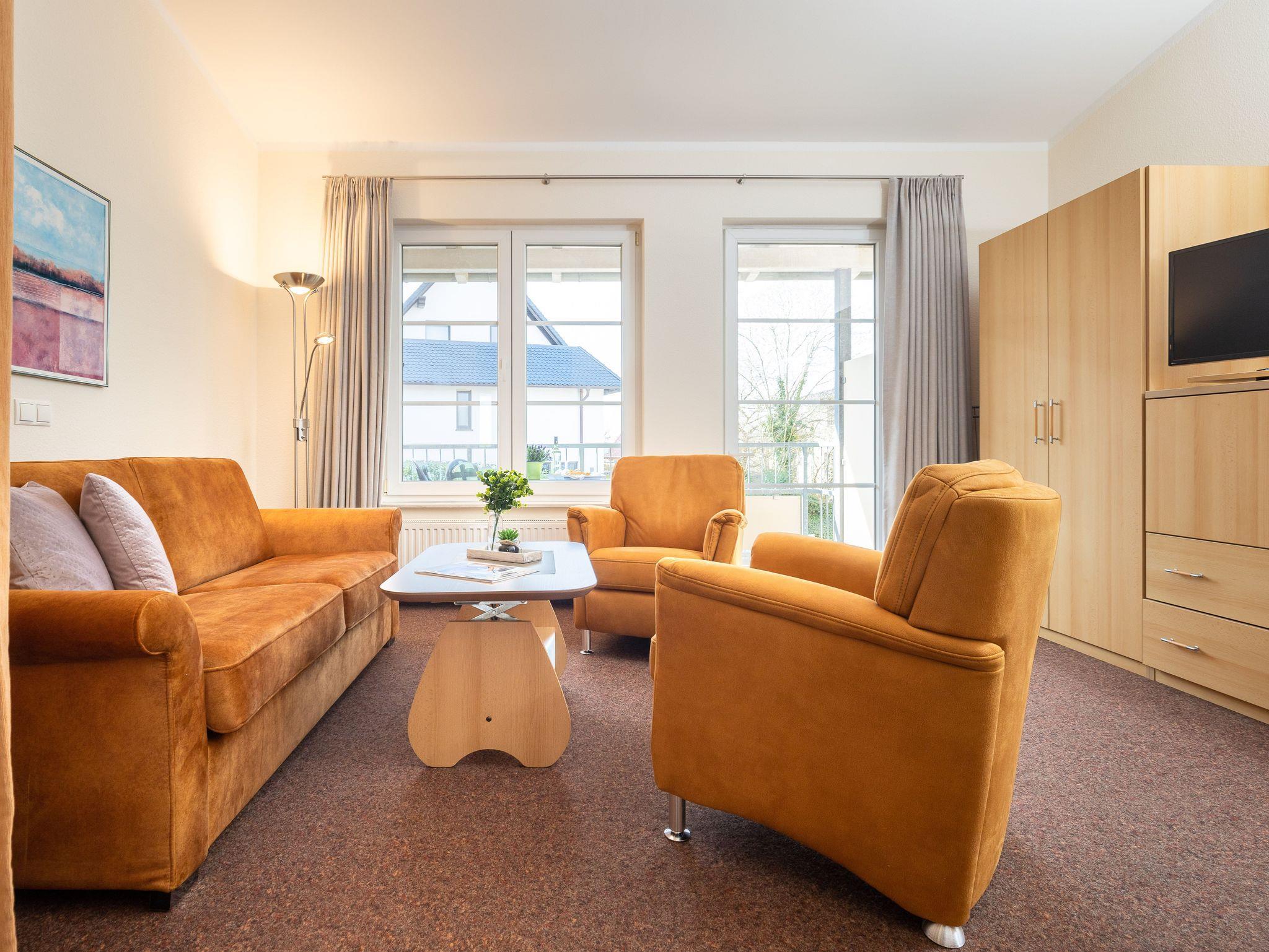 Das helle Wohnzimmer verfügt über eine Couchgarnitur, welche ebenso eine Aufbettung für 2 weitere Personen darstellt. Neben einem TV und einem kostenfreien WLAN-Zugang erreichen Sie von hier aus den sonnigen Balkon inkl. Balkonmöbel.
