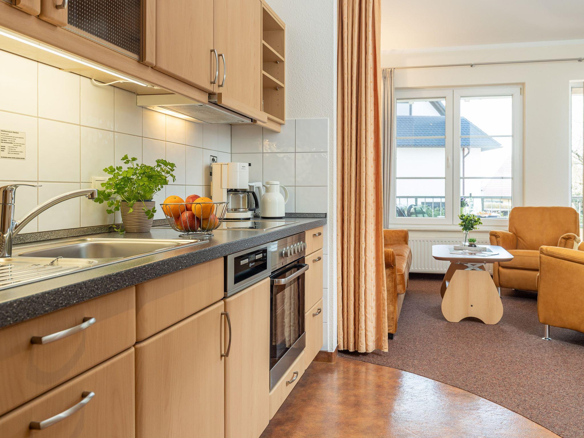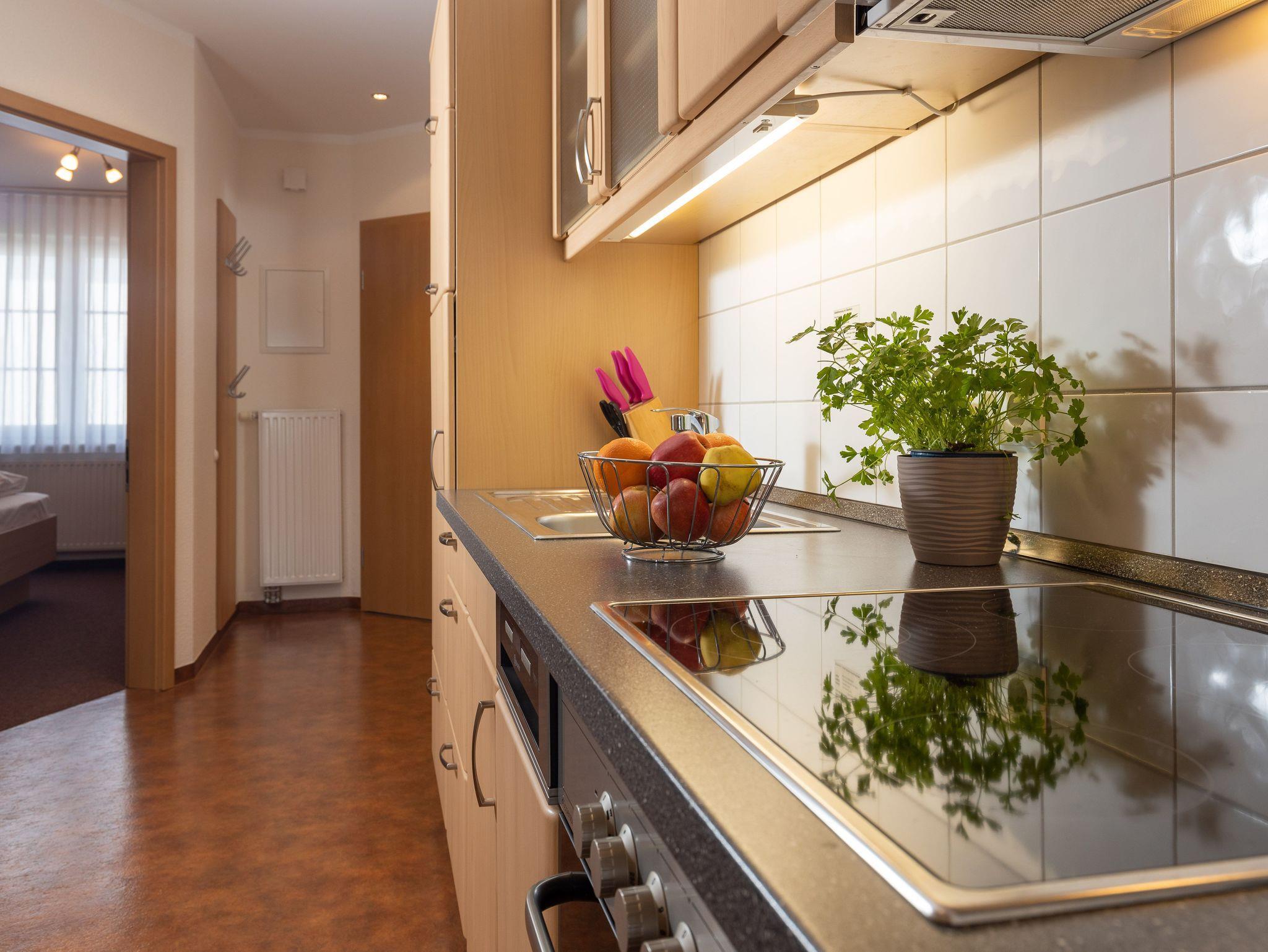 Die Küchenzeile ist mit einem Kühlschrank, einem Ceranfeld mit Backofen, einer Spülmaschine und einer Mikrowelle ausgestattet. Ebenso finden sich hier alle nötigen Küchenkleingeräte (Wasserkocher, Kaffeemaschine, Toaster..).
