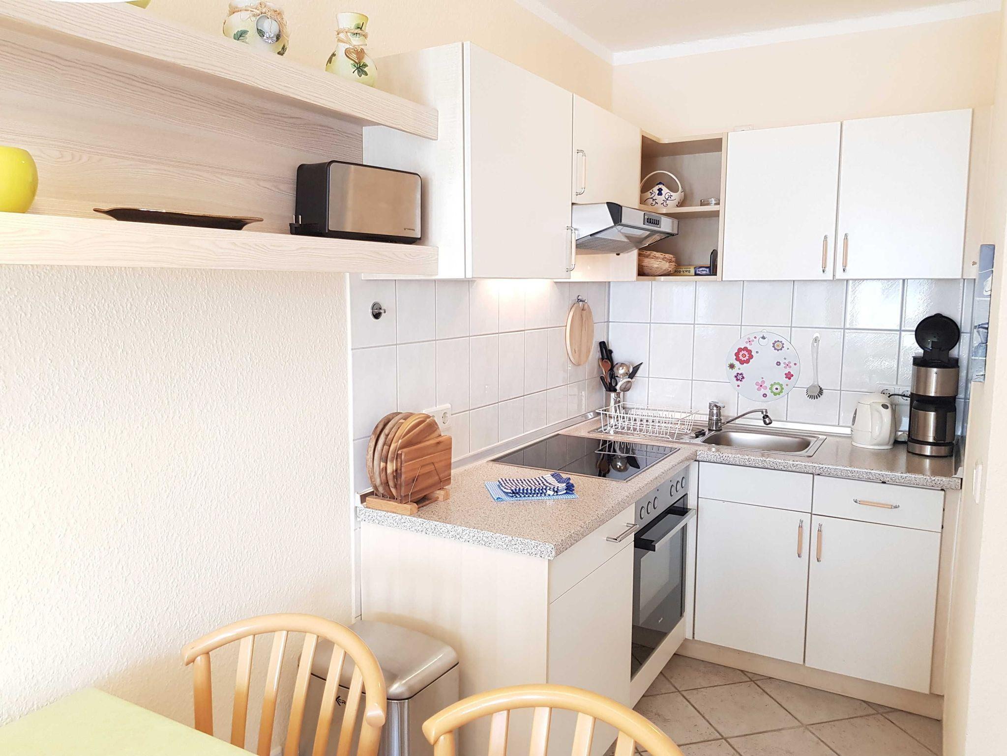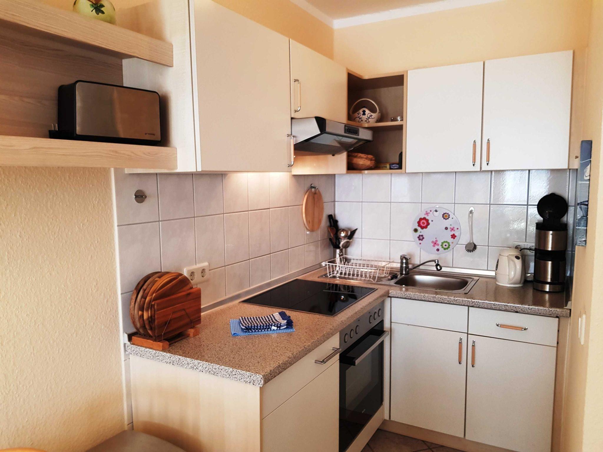 • komplette Küchenzeile im Essbereich (4 Herdplatten, Backofen, diverse Küchenutensilien, Kühlschrank)
