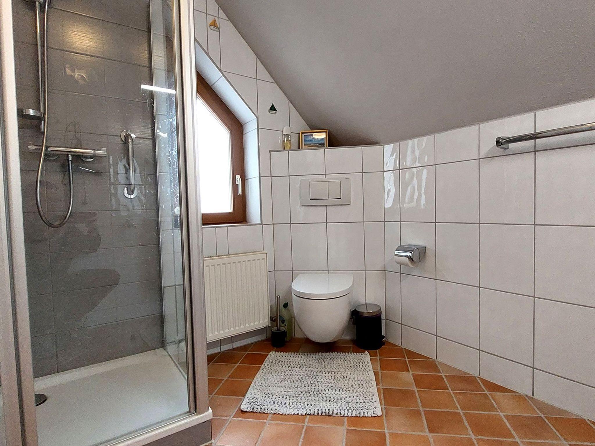 Vom Flurbereich samt Garderobe gelangen Sie ins Tageslichtbad, welches über WC, Dusche, Kosmetikspiegel und Fön verfügt.