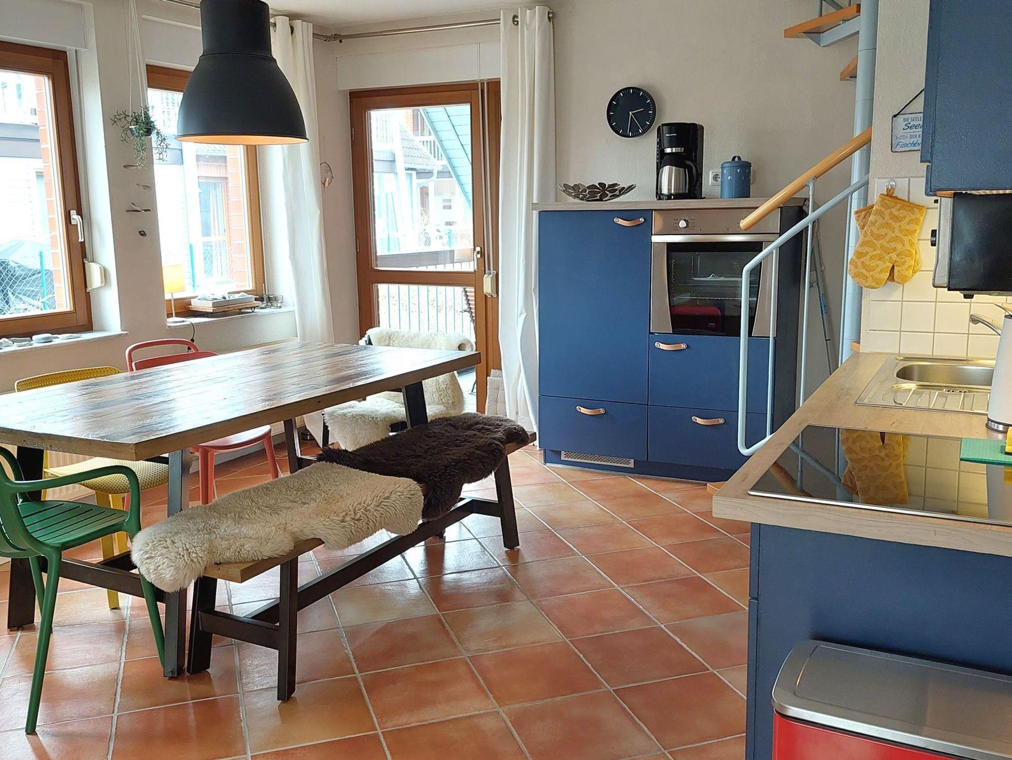 Der geräumige Wohn- und Essbereich beinhaltet eine moderne Küchenzeile mit Cerankochfeld, Mikrowelle, Geschirrspüler und Kühlschrank (samt Gefrierfach). Backofen, Raclette, Elektrogrill und viele weitere Küchenhelfer sorgen dafür, das man sich auch im Urlaub bequem selbst verpflegen kann. Der Esstisch bietet Sitzgelegenheiten für bis zu 6 Personen.