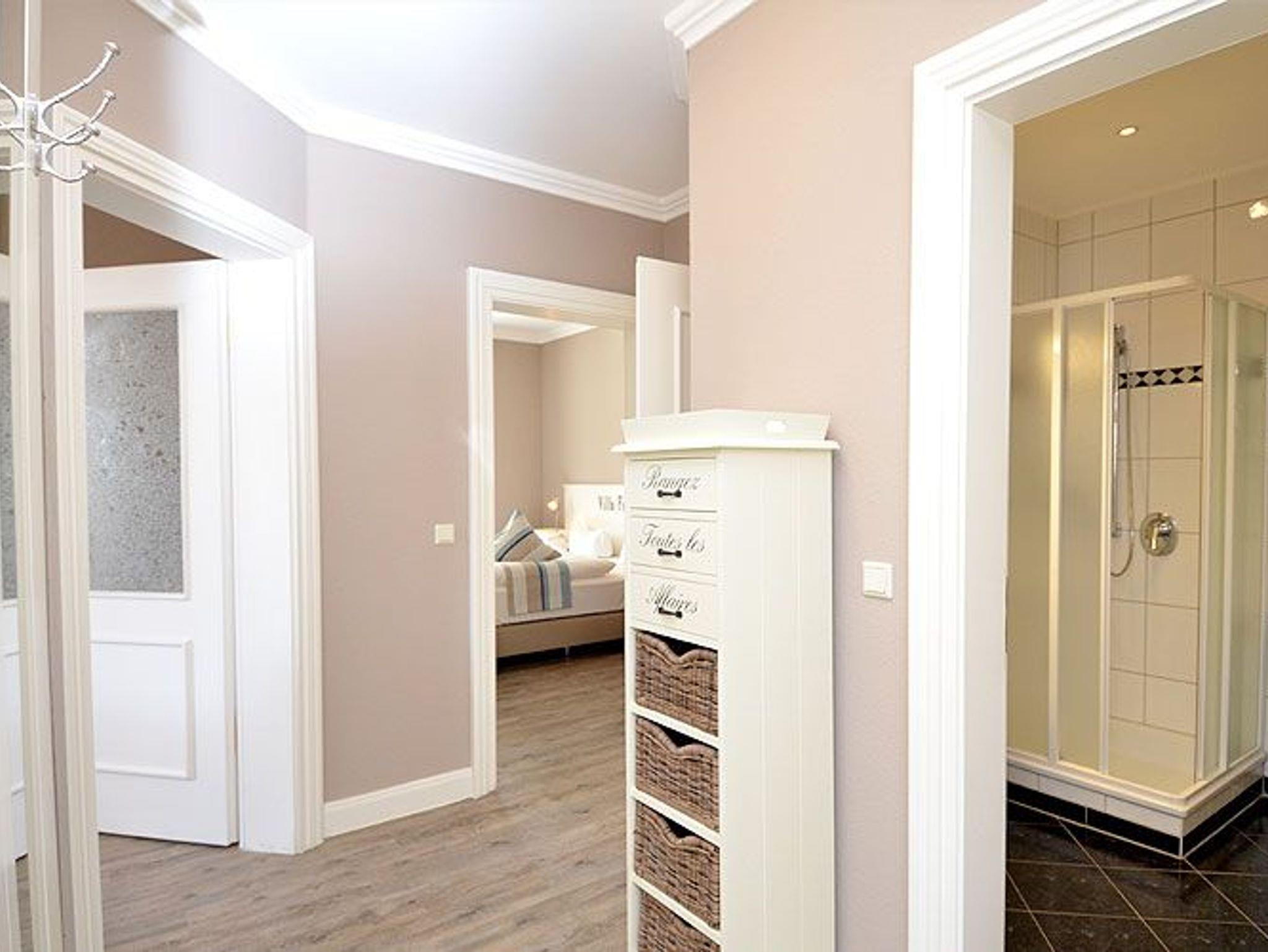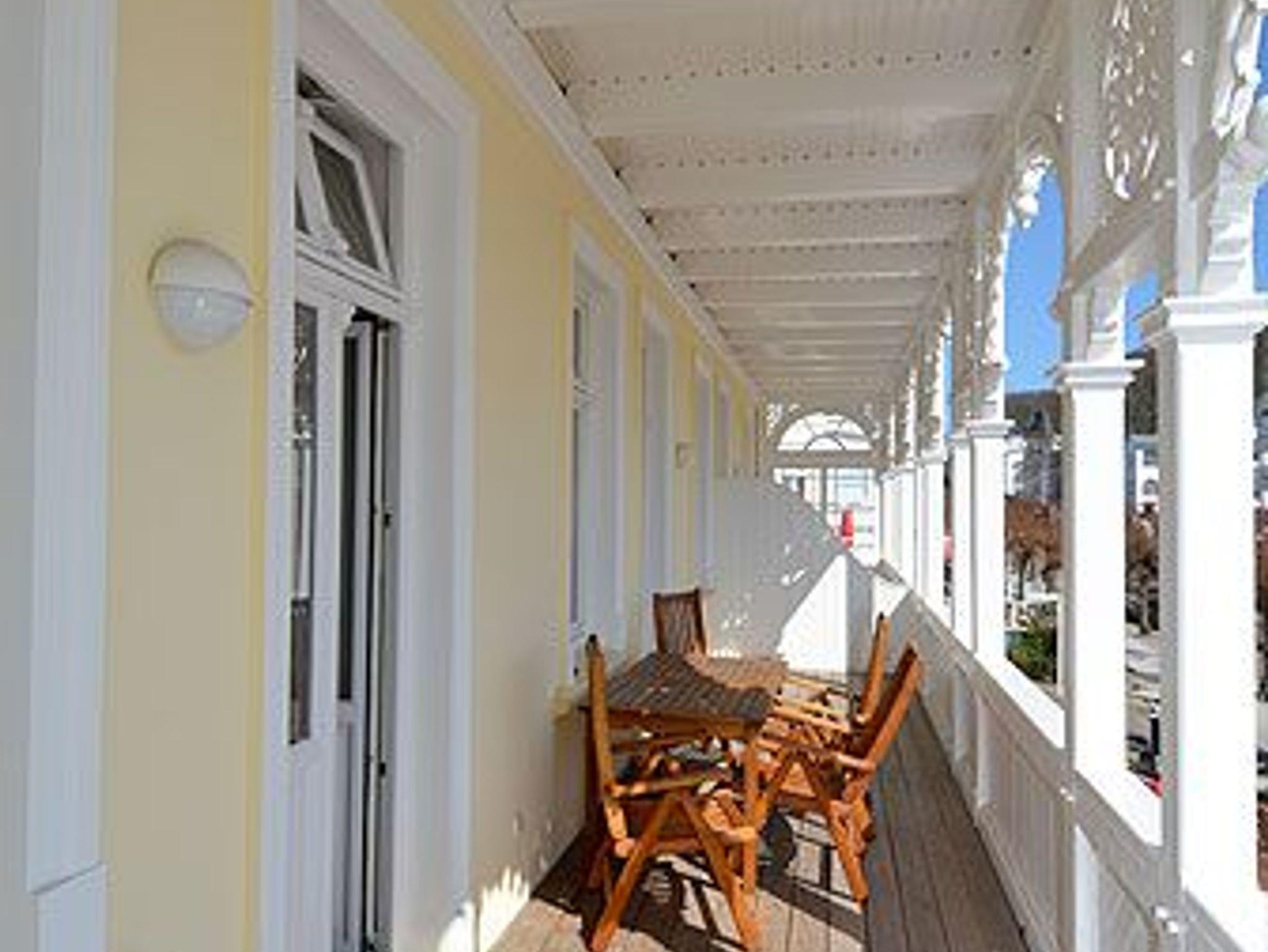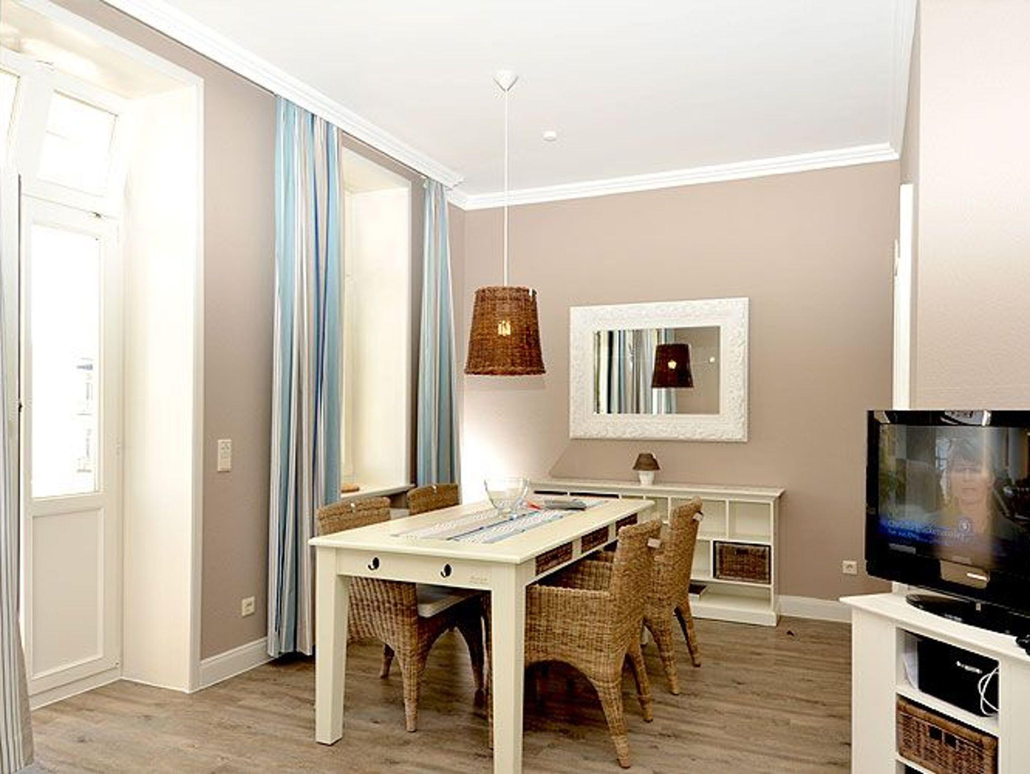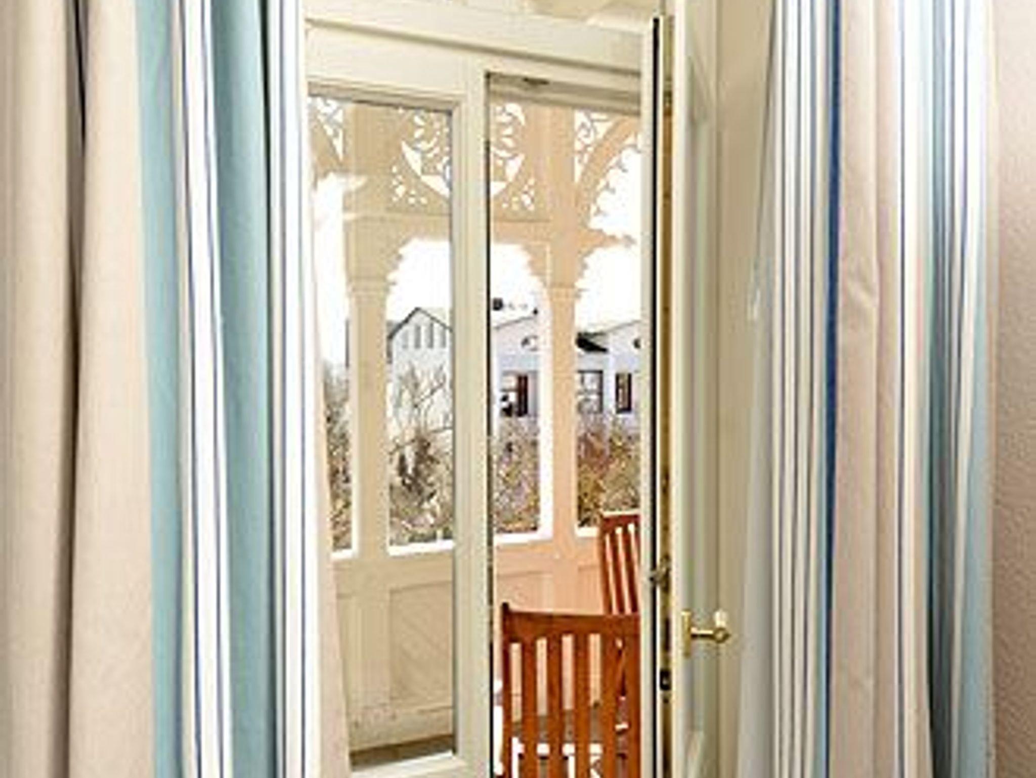 Dieses ca. 70 m² große und sehr stilvoll eingerichtete 3-Raum-Appartement erwartet Sie im 1. Obergeschoss und hat zusätzlich einen ca. 20 m² möblierten Holzbalkon im Bäderstil zur Morgensonne mit Blick auf die Wilhelmstrasse. Dieser Balkon mit Teakholz-Möblierung ist sowohl vom Wohnzimmer als auch vom Schlafzimmer aus zu betreten. Die wunderschönen Landhausmöbel, ausgesuchte Stoffe und die warmen Erdtöne schaffen mit den leicht maritimen Akzenten ein ganz einzigartiges Wohlfühlambiente.