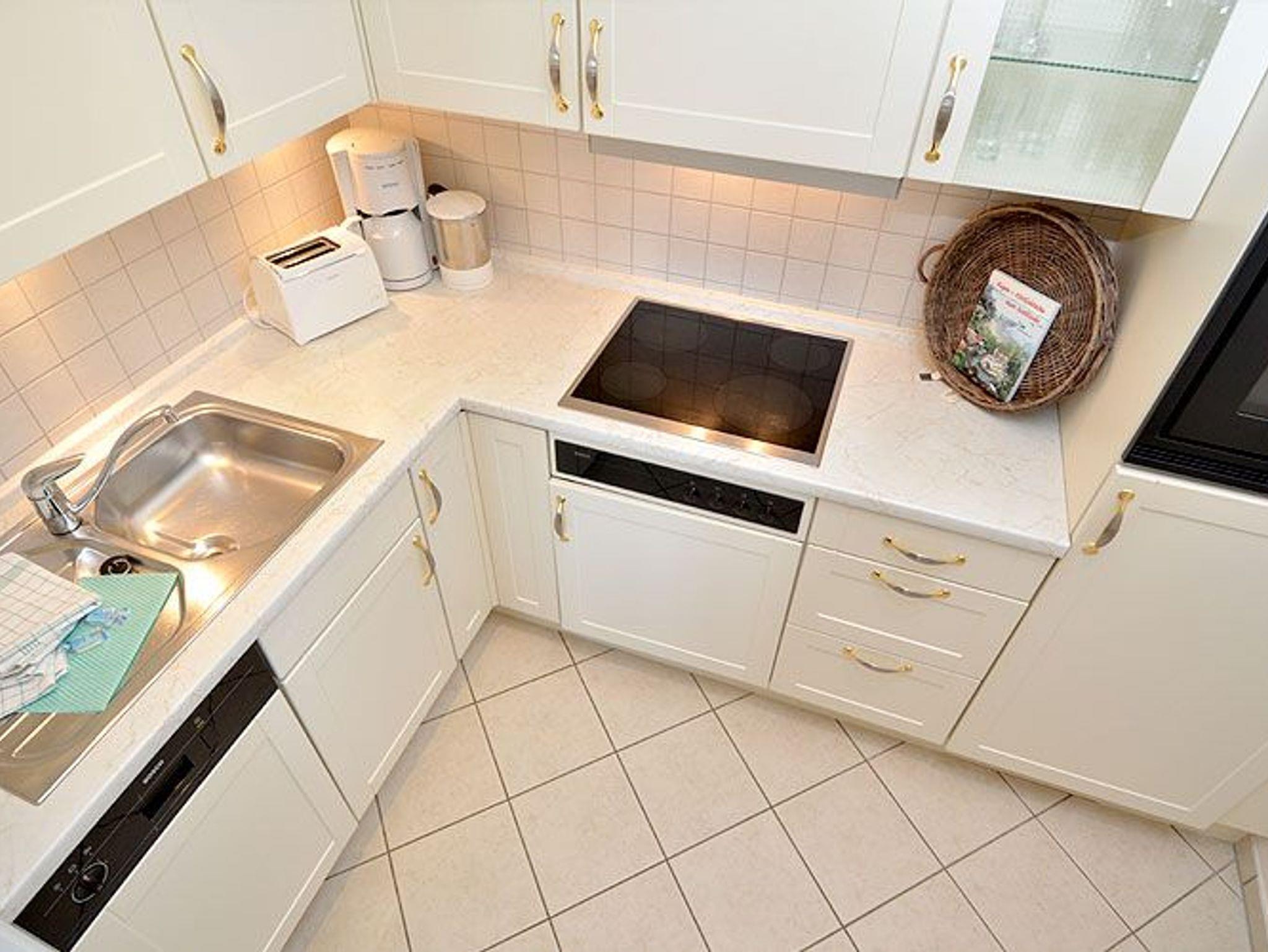 Die separate Küche ist ausgestattet mit einem Kühlschrank mit Gefrierfach, einem 4-Platten-Ceranfeld, einer Spülmaschine, einer Mikrowelle mit Grillfunktion und diversem Kleininventar, das die Küchenausstattung komplettiert.