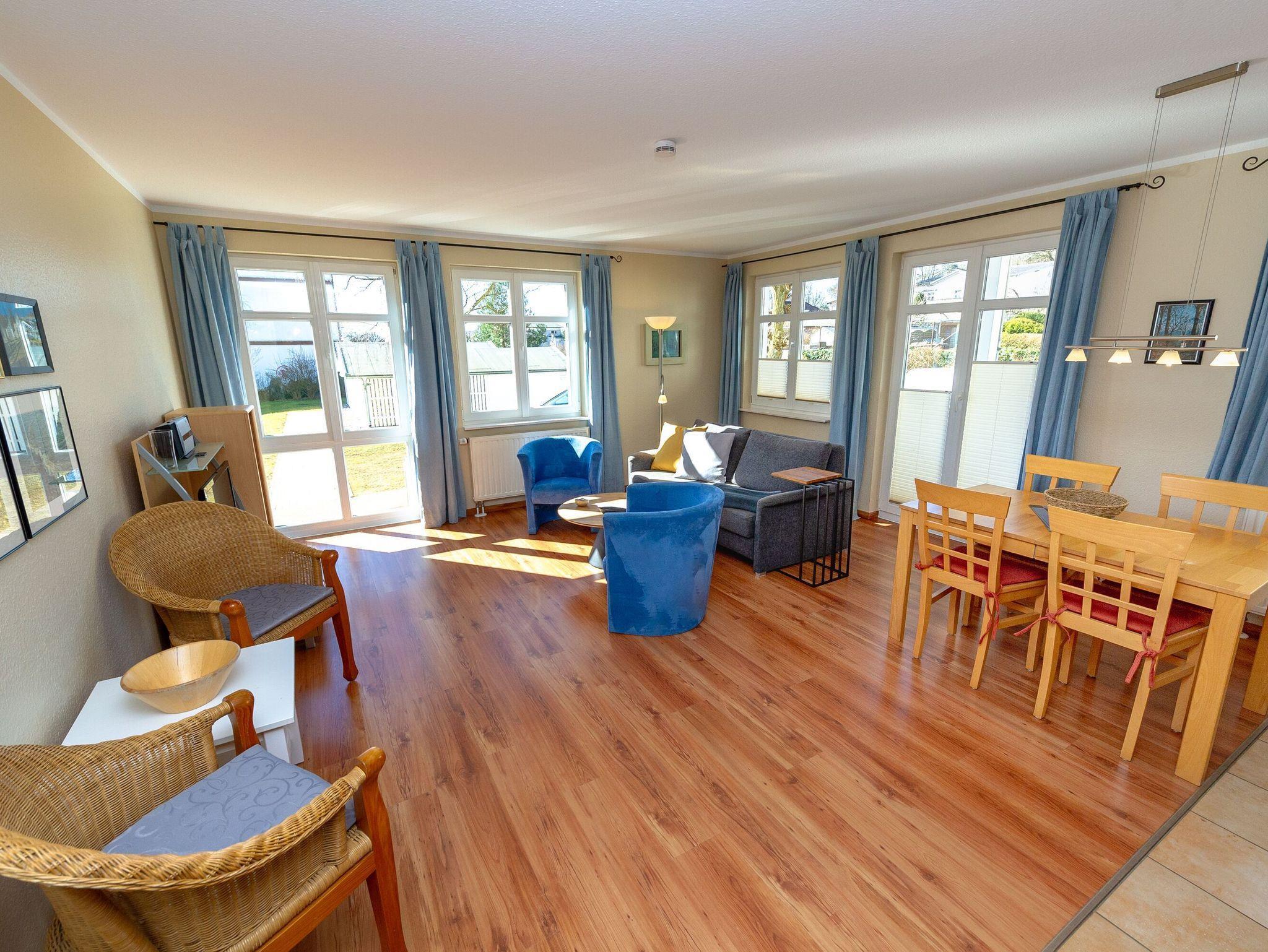 Der helle, freundliche Wohnraum ist mit einer bequemen Schlafcouch (Aufbettungsmöglichkeit für 2 Personen), zwei Sesseln, einem Flachbild-TV, einer Mini-Stereoanlage mit CD-Player und einem Esstisch ausgestattet. Internet per W-LAN steht kostenfrei zur Verfügung.