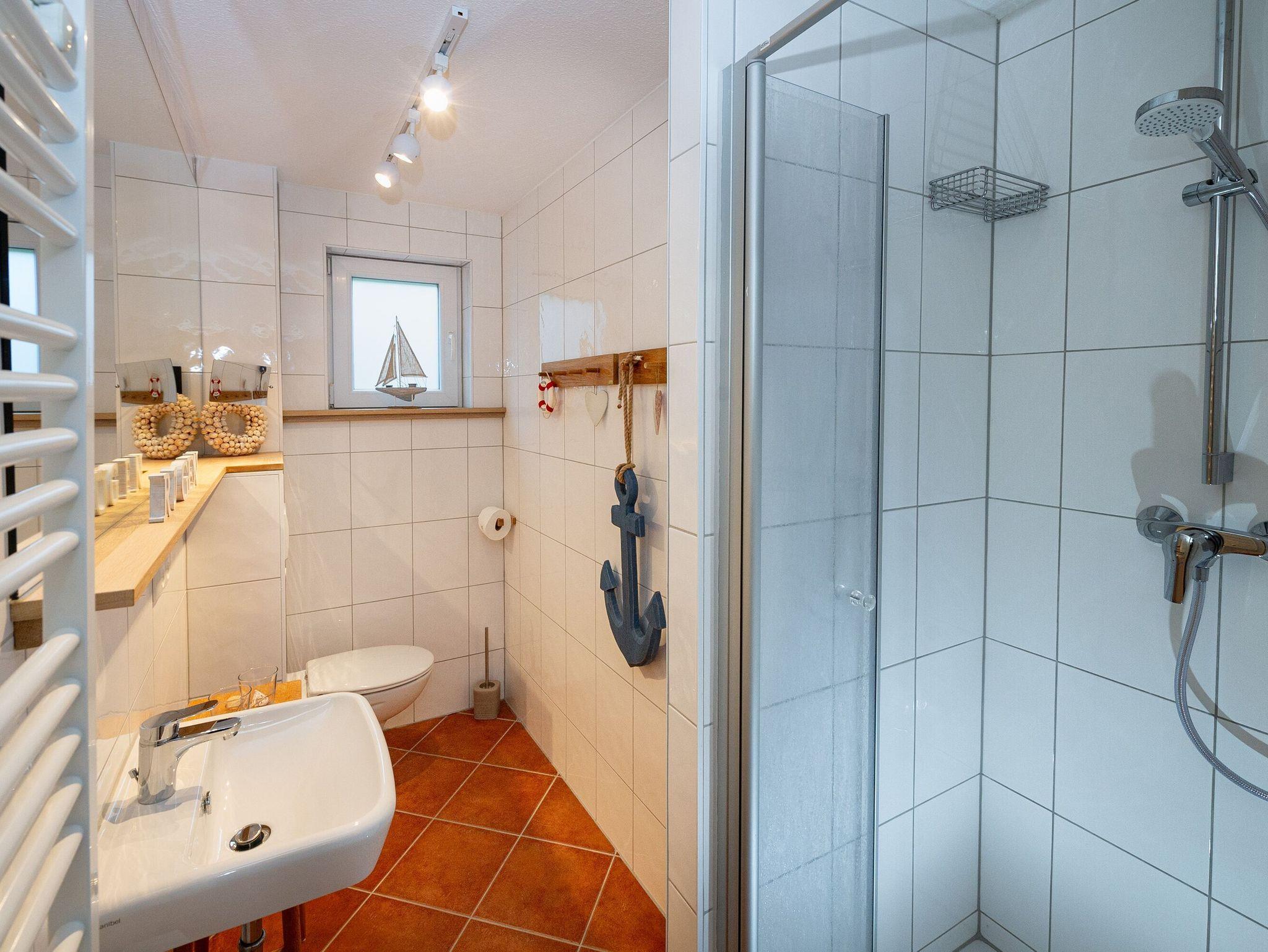 Weiterhin verfügt die Wohnung CLAUDIUS über ein Tageslichtbad mit Dusche/WC, Waschtisch, Fön und beheizbarem Handtuchtrockner, eine eigene Waschmaschine sowie ein Schlafzimmer mit einem komfortablen Doppelbett und einer Arbeitsecke für HomeOffice/WLAN-Anschluss und einem weiteren SMART-TV.