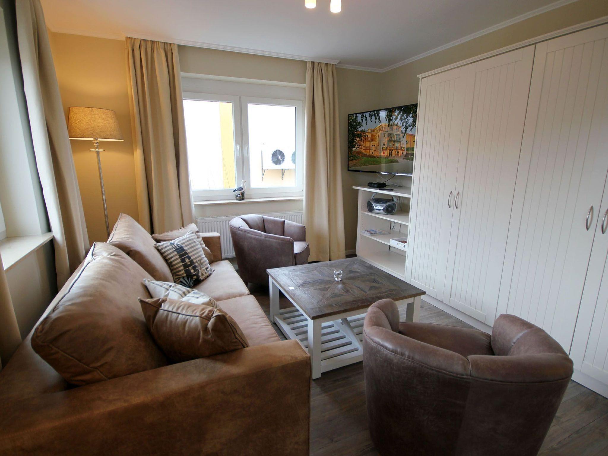 Ihre 2-Zimmer Ferienwohnung 65RB8 Seestern befindet sich im 1. Obergeschoss und ist ca. 48 qm groß. Die Nichtraucherwohnung verfügt über einen Balkon in Richtung Osten und ist für bis zu 4 Personen gut geeignet. Neben dem gemütlichen Wohnbereich mit Zugang zum Balkon, gehört eine Sitzecke mit Schlaffunktion, ein Essbereich, Flachbild TV sowie WLAN. Im Schlafzimmer erwartet Sie ein Doppelbett, ein zusätzlicher TV sowie ein Kleiderschrank. Zudem können Sie eine voll ausgestattete und im Wohnbereich integrierte Küchenzeile mit Geschirrspüler, Backofen, Wasserkocher, Toaster, Kaffeemaschine sowie umfangreiches Küchengeschirr nutzen. Das moderne Badezimmer erwartet Sie mit Waschtisch, WC und Dusche. Einen Parkplatz sowie eine Fahrradunterstellmöglichkeit befinden sich direkt am Objekt.