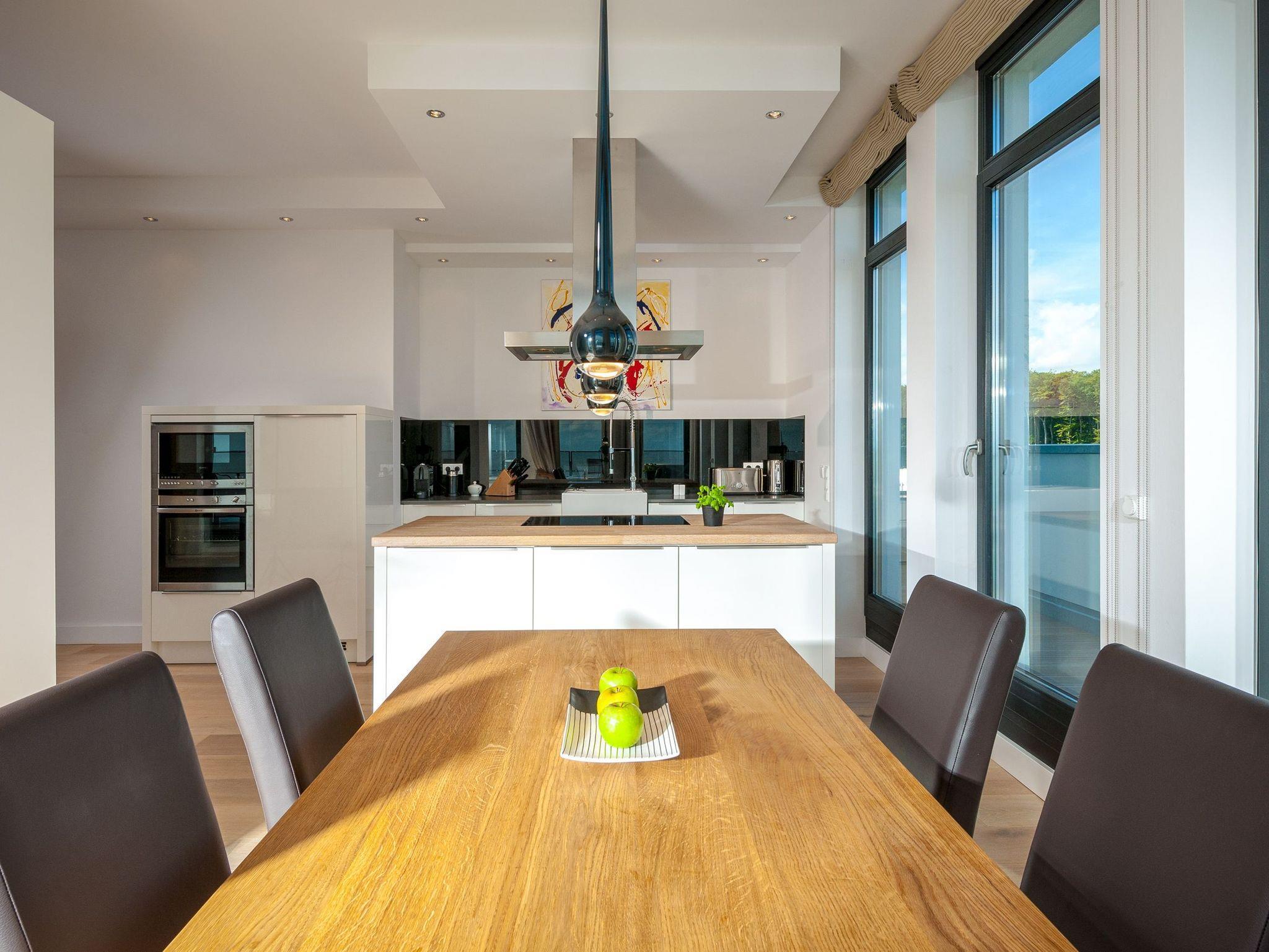 Die harmonisch in den Wohnbereich integrierte, offene Küche mit Marken-Einbaugeräten lässt das Herz eines jeden Hobbykochs höher schlagen. Eine freistehende Kücheninsel mit einem Induktionskochfeld, ein Backofen, eine Mikrowelle, diverse Küchengeräte und Kleininventar runden den hochwertigen Eindruck ab.