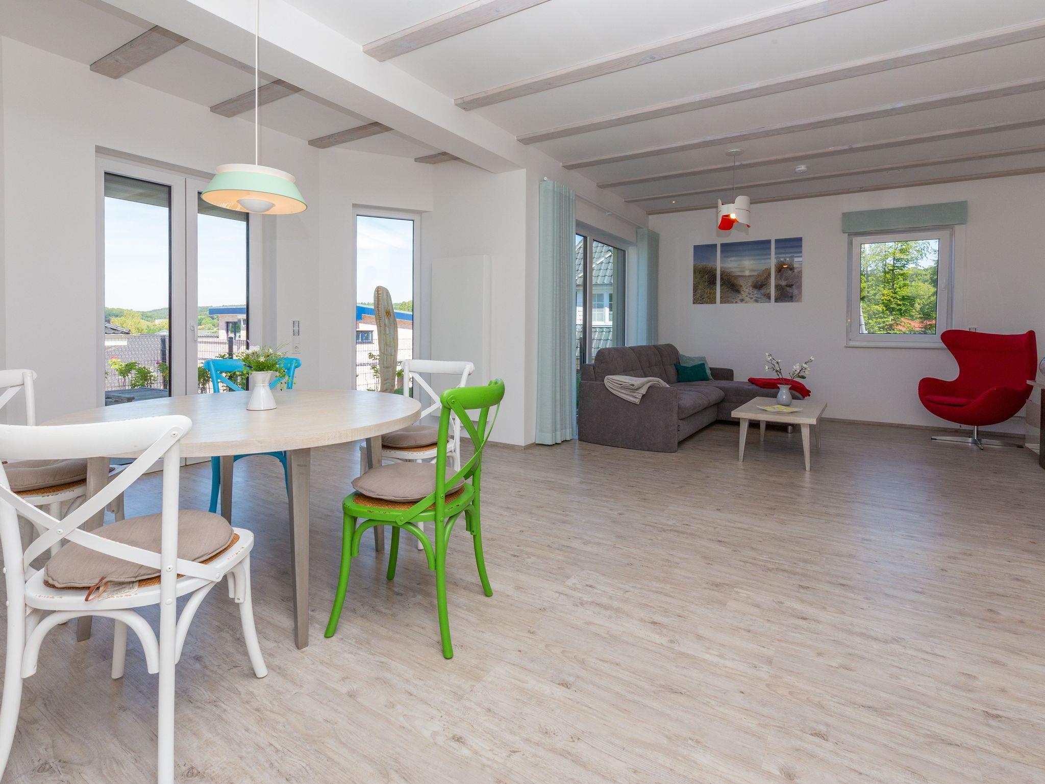 Die gemütlich eingerichtete Nichtraucher-Ferienwohnung Südstrand mit ca. 75 qm bietet Ihnen ausreichend Platz für max. 3 Erwachsene + 1 Kleinkind bis 3 Jahre im Kinderreisebett. Von dem großzügigen, lichtdurchfluteten Wohn- und Essbereich mit großen bodentiefen Fensterelementen werden Sie begeistert sein. Im Wohnbereich können Sie es sich auf einer gemütlichen Eckcouch (Aufbettungsmöglichkeit 3.Person/ 1,40m x 2,00m) oder einem Ohrensessel bequem machen. Zwei dimmbare Leseleuchten helfen beim Lesen eines spannenden Buches. Auf dem 65 Zoll Smart-TV in Full-HD- Qualität können Sie Ihre Lieblingssendungen anschauen oder im DAB-Radio hören. Auf einen kostenfreien Internetanschluss (WLAN) müssen Sie in Ihrem Urlaub nicht verzichten. Ein Kaminofen und bereitgestelltes Brennholz sorgen für Ihre Behaglichkeit an kühleren Tagen. Abgerundet wird der Wohnbereich durch einen Couchtisch sowie ein TV-Board mit Stauraum. Vom Wohn- und Küchenbereich gelangen Sie auf eine von 2 bestuhlten Terrassen (Süd/Ost und Ost/Süd) mit Sonnenschirm, Sonnenliegen, einem Grill und einen feststehenden Wäscheständer. Die moderne Küchenzeile, angrenzend zum Wohnbereich bietet Ihnen einen Kühl- und Gefrierschrank, ein Cerankochfeld, einen Backofen, einen Geschirrspüler, einen Espressokocher, eine Kaffeemaschine, eine Dolce Gusto Maschine, einen Toaster, einen Handmixer, einen Stabmixer sowie weitere alltägliche Küchenhelfer, mit denen das Zubereiten Ihres Lieblingsgerichtes ganz einfach und schnell möglich ist. Abgerundet wird diese durch einen runden Esstisch. Das Schlafzimmer verfügt über ein großes Doppelbett in Komforthöhe (2,00m x 2,00m), Nachttischablagen mit Leseleuchten, verstellbare Lattenroste, einen Safe, einen Kleiderschrank sowie einen Flachbild-TV (48 Zoll). Sämtliche Räumlichkeiten sind mit elektrischen Rollläden sowie Insektenschutzgitter (Wohnbereich/Schlafbereich) versehen. Das hochwertige Tageslichtbad ist ausgestattet mit einer bodentiefen Echtglasdusche mit Regenfunktion, beheizbarem Handtuchtrockner, einen Waschtisch mit großem Wandspiegel, einen Kosmetikspiegel, einem WC und einem Fön. Im Außenbereich finden Sie Ruhe und Abgeschlossenheit in einer Sauna. Ein zusätzlicher Abstellraum bietet Platz für Ihre Koffer, wo Sie unteranderem, aber auch diverse Reinigungsutensilien und einen Staubsauger finden. Für unsere kleinen Gäste steht ein Kinderreisebett (ohne Matratze) und ein Hochstuhl inklusive bereit. Haustiere sind nicht erlaubt. Ihre Fahrräder können Sie in einem verschließbaren Fahrradschuppen unterstellen, kostenfrei laden und sicher an einem Stahlbügel anschließen. Zwei PKW-Stellplätze befinden sich direkt am Haus. Die Erstausstattung eines Wäschepaketes (komplette Bettwäsche, 1 Duschhandtuch, 2 kleine Handtücher) können Sie bis 14 Tage vor der Anreise gegen einen Aufpreis dazu buchen oder durch eigenes Ergänzen. Ab 2 gebuchten Paketen erhalten Sie einmalig 1 Geschirrtuch und einen Duschvorleger dazu.