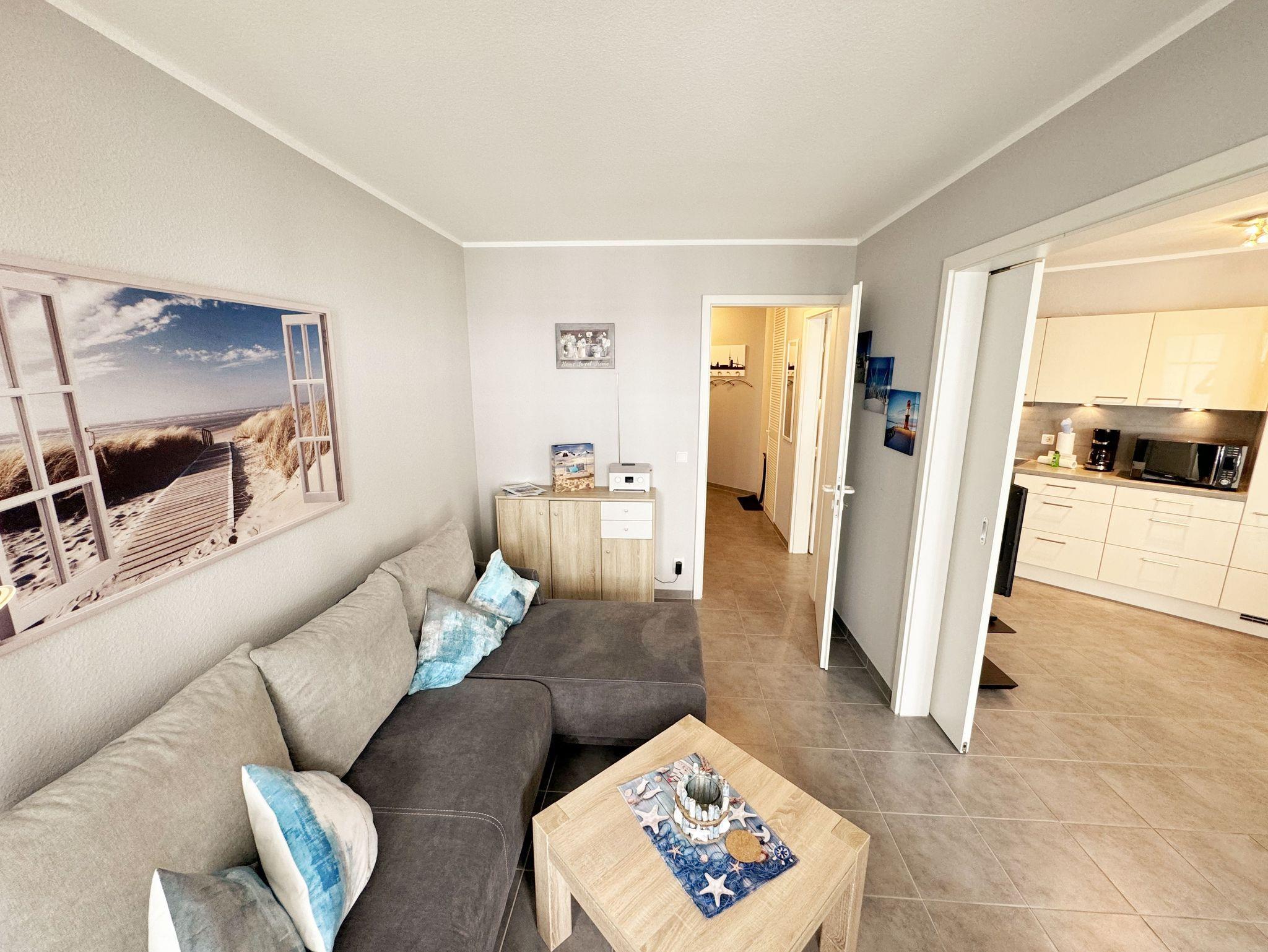 Das lichtdurchflutete Apartment ?Ostseetraum? mit vielen bodentiefen Fenstern ist eine Nichtraucherwohnung und befindet sich in der 1. Etage des Hauses Mönchgut (Haus 14 /Nr. 624). Sie ist mit ca. 52m² komfortabel und geräumig und bietet Platz für max. 2 Erwachsene und 1 Kind bis 16 Jahre. In der Wohnung finden Sie eine offene Küchenzeile mit kombinierten Koch- und Essbereich. Die integrierte, moderne Küchenzeile lässt mit einer Mikrowelle mit Grillfunktion, 4 Zonen-Cerankochfeld mit ausziehbarer Umlufthaube, Backofen mit Umluft und Grill, Kühlschrank mit Eisfach, Geschirrspüler, Kaffeemaschine, Senseo Pad-Kapselmaschine, Toaster, Wasserkocher, Küchenwaage, Handmixer und anderen praktischen Helfern keine kulinarischen Wünsche offen. Der Essplatz mit einem Glastisch zum Ausziehen und Schwingstühlen rundet diesen Bereich ab. Der angrenzende Wohnbereich ist mit einer Kommode, einer Stehlampe, einem Couchtisch und einer Couch mit Schlaffunktion (1,40m x 2,00m) eingerichtet. Abgerundet wird der Wohnbereich mit einem DAB - Internet Radio sowie ein flexiblen TV-Board mit Smart-TV. Erfreuen Sie sich an einer kleinen Auswahl an Gesellschaftsspielen. Auch auf einen Internetanschluss (W-LAN) müssen Sie im Urlaub nicht verzichten. Dieses ist inklusive. Der bestuhlte Balkon (Nordwest) mit Sonnenschirm und einem Weber Elektrogrill können Sie vom Wohn,- Essbereich sowie vom Schlafzimmer erreichen. Das Schlafzimmer ist mit einem Doppelbett (1,80m x 2,00m), Nachttischablage mit dazugehörigen Leselampen und einem geräumigen Kleiderschrank mit Safe ausgestattet. Ein kleines Highlight bietet das Schlafzimmer, welches über einen zweiten kleinen Balkon verfügt. Das Bad ist mit einer Badewanne mit Duschfunktion, einer Waschmaschine und einem Waschplatz mit Spiegelschrank und einem Fön ausgestattet. Das separate WC verfügt zusätzlich über einen kleinen Waschplatz. Im Apartment befindet sich im Flurbereich ein Einbauschrank. Darin befinden sich Staubsauger, Wäscheständer, Bügeleisen mit Bügelbrett und Reinigungsutensilien. Ein eigener PKW-Stellplatz (Nr. 20) befindet sich in der Tiefgarage (Einfahrtshöhe 1,80 m) des Hauses. Im Untergeschoss befindet sich der Kellerbereich (Nr. 624) er ist mit einer Steckdose 230 Volt ausgestattet, so das Sie Ihre eigenen E-Bikes und Fahrräder hier laden können. Maximal 2 Hunde sind bei uns gegen eine Gebühr Herzlich willkommen! Die Erstausstattung eines Wäschepaketes (komplette Bettwäsche, 1 Duschhandtuch, 2 kleine Handtücher) können Sie bis 14 Tage vor Anreise gegen einen Aufpreis dazu buchen oder durch eigenes Ergänzen. Ab 2 gebuchten Paketen erhalten Sie einmalig 1 Geschirrhandtuch und 1 Duschvorleger hinzu.
