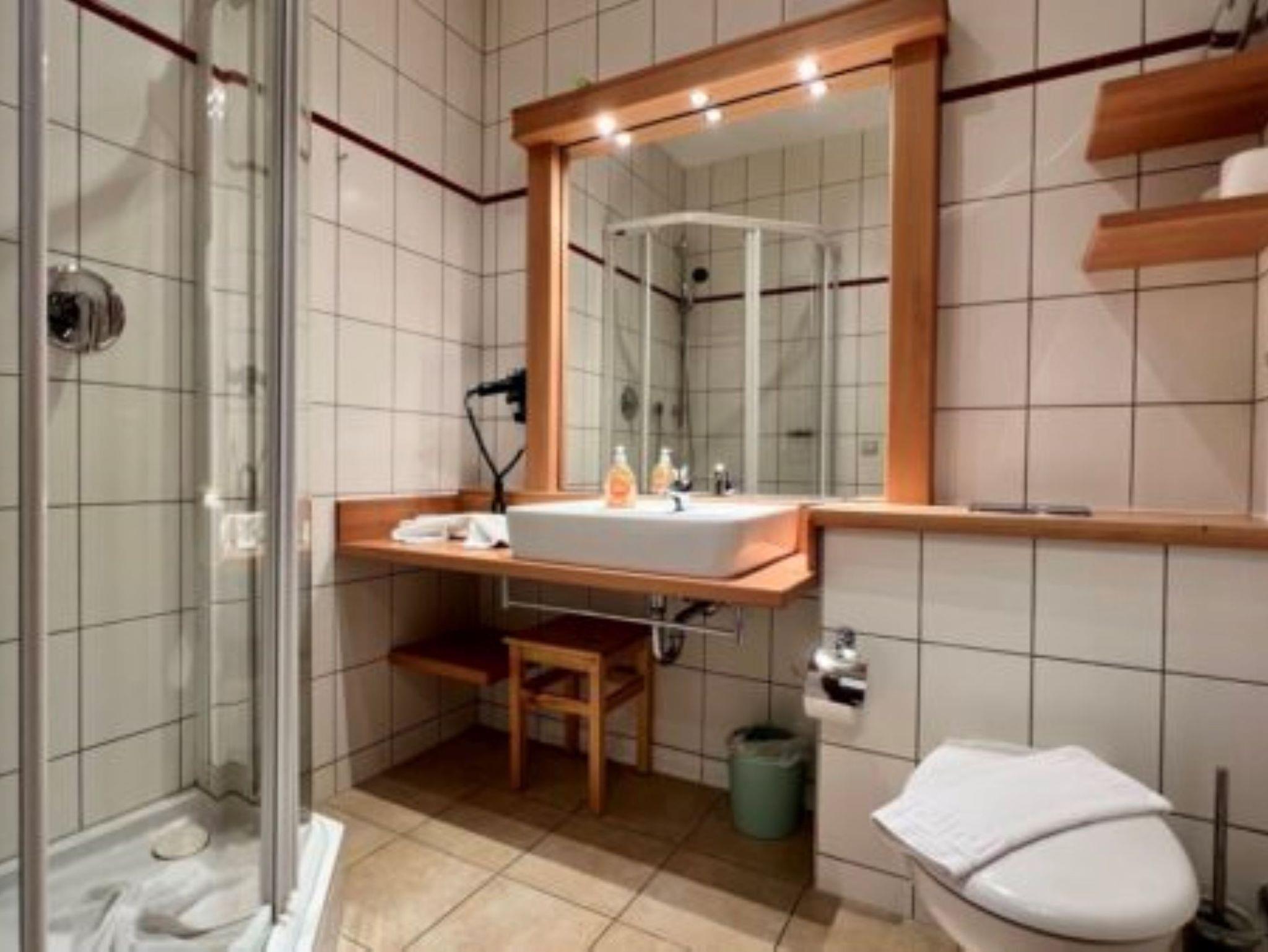 Die beiden Bäder bieten Ihnen jeweils eine Dusche, ein WC und einen Waschtisch mit Waschbecken und Spiegel.