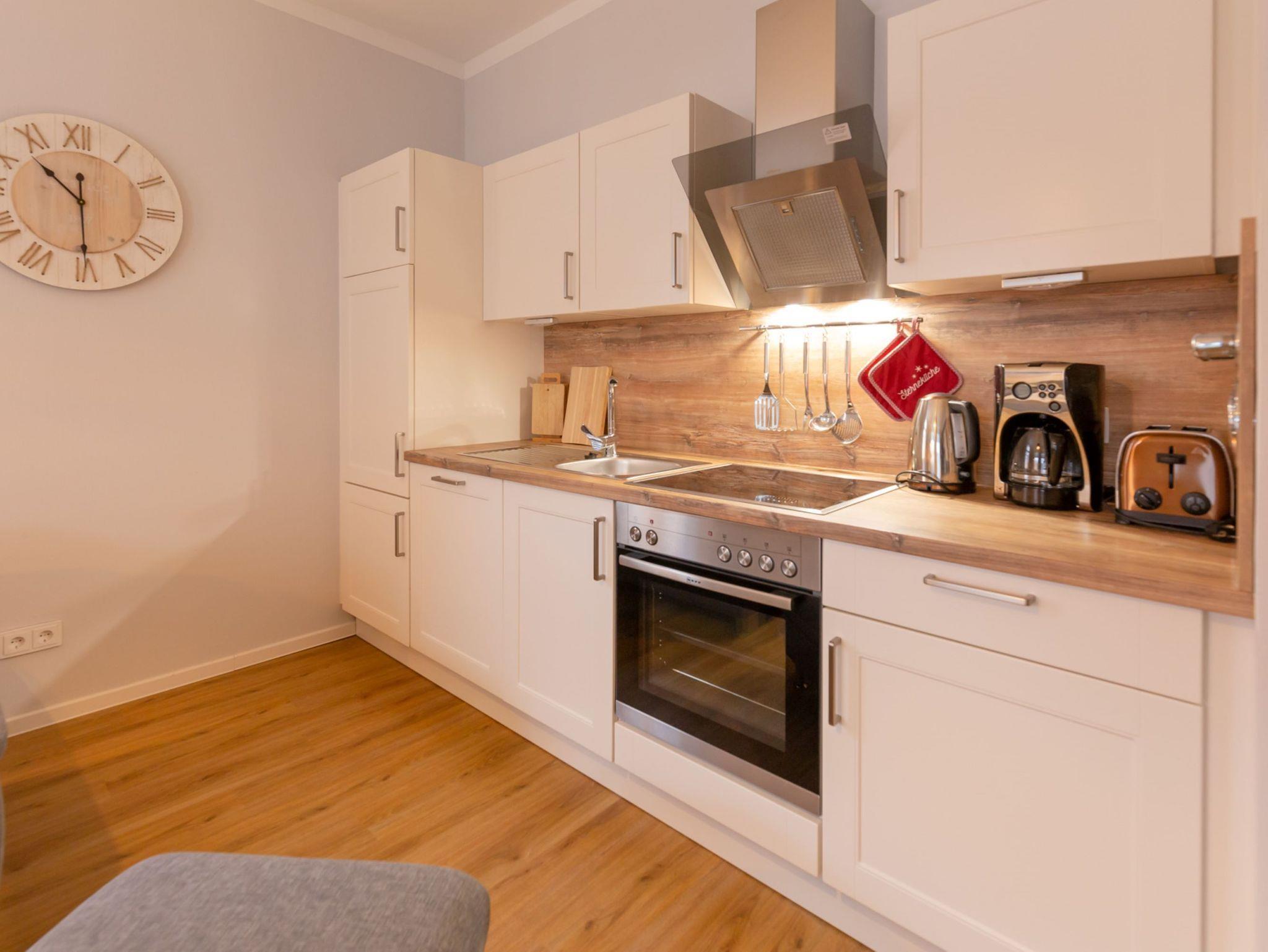 Die offene Küche ist bestens ausgestattet. Neben einem Kühlschrank mit Gefrierfach, einer Spülmaschine, einem Herd und einem Backofen finden Sie hier auch allerlei Küchenkleingeräte.