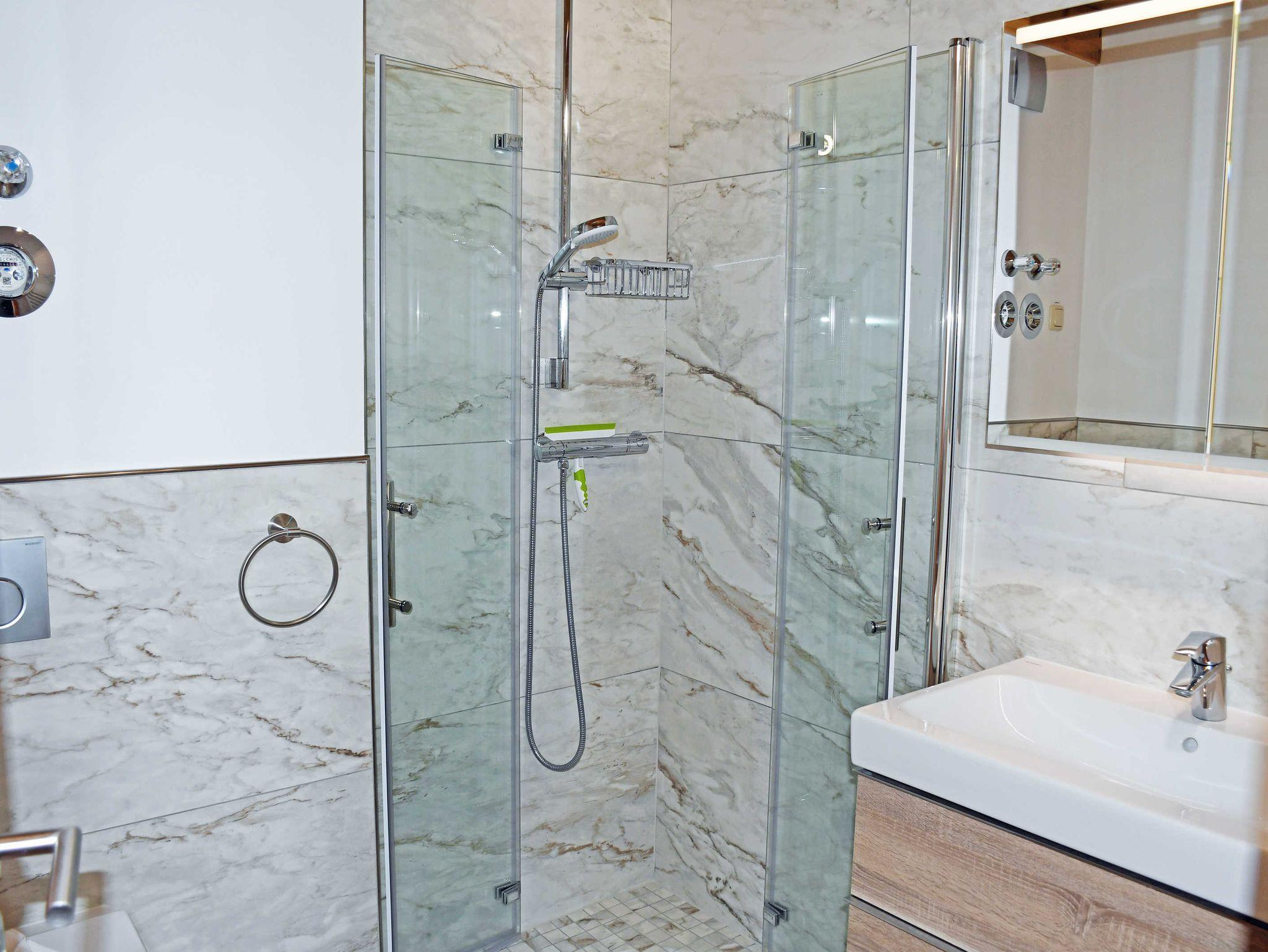 Das innenliegende, ebenfalls moderne Bad enthält eine Dusche mit Glasduschabtrennung, Waschtisch mit Unterschrank und beleuchtetem Spiegelschrank sowie einer automatischen Entlüftung. Der Süd-Ostbalkon bietet mit 14 m² viel Platz zum Frühstücken und Sonnenbaden, ausgestattet mit Tisch und Gartenstühlen.