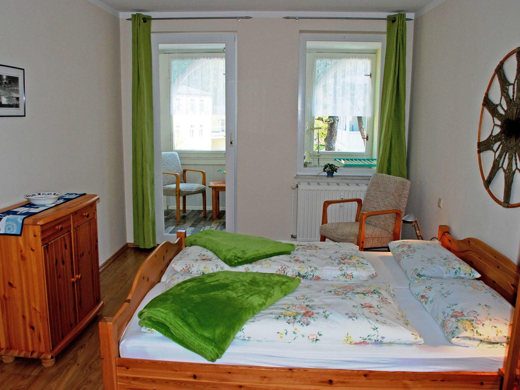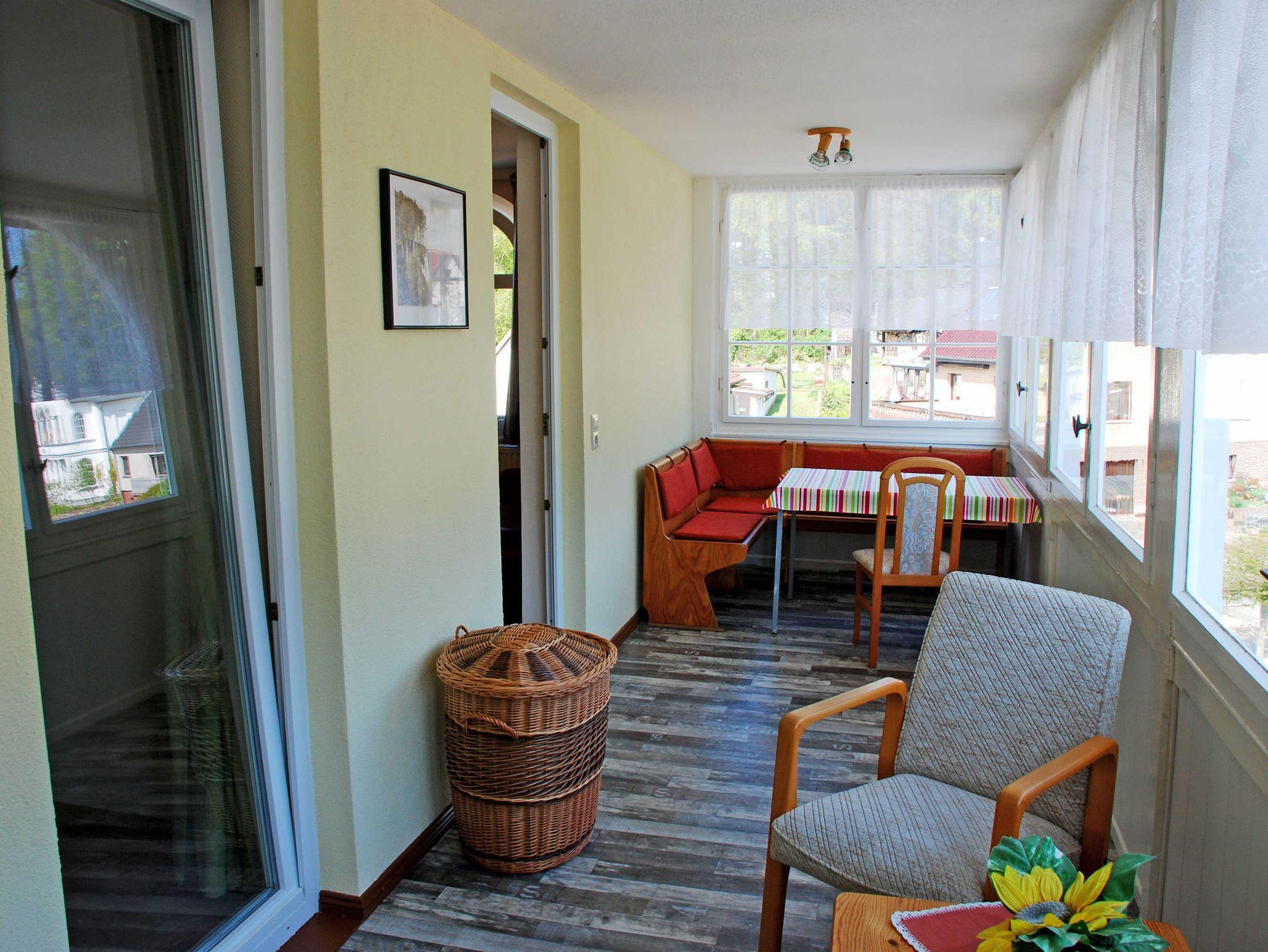 Das Schlafzimmer ist mit einem bequemen Doppelbett mit Nachttischen und Leselampen sowie einem Kleiderschrank ausgestattet. Bei Ihrer Anreise sind die Betten bereits mit Bettwäsche bezogen und es liegen für Sie frische Handtücher bereit. Zur dieser Wohneinheit gehört auch eine sehr große verglaste Veranda (Loggia) mit einem zusätzlichem Essbereich und schönem Ausblick. Diesen können Sie entweder aus dem Wohnbereich bzw. Schlafbereich betreten. Hier können Sie Ihr Frühstück einnehmen oder den Abend bei einem Glas Wein entspannt ausklingen lassen.